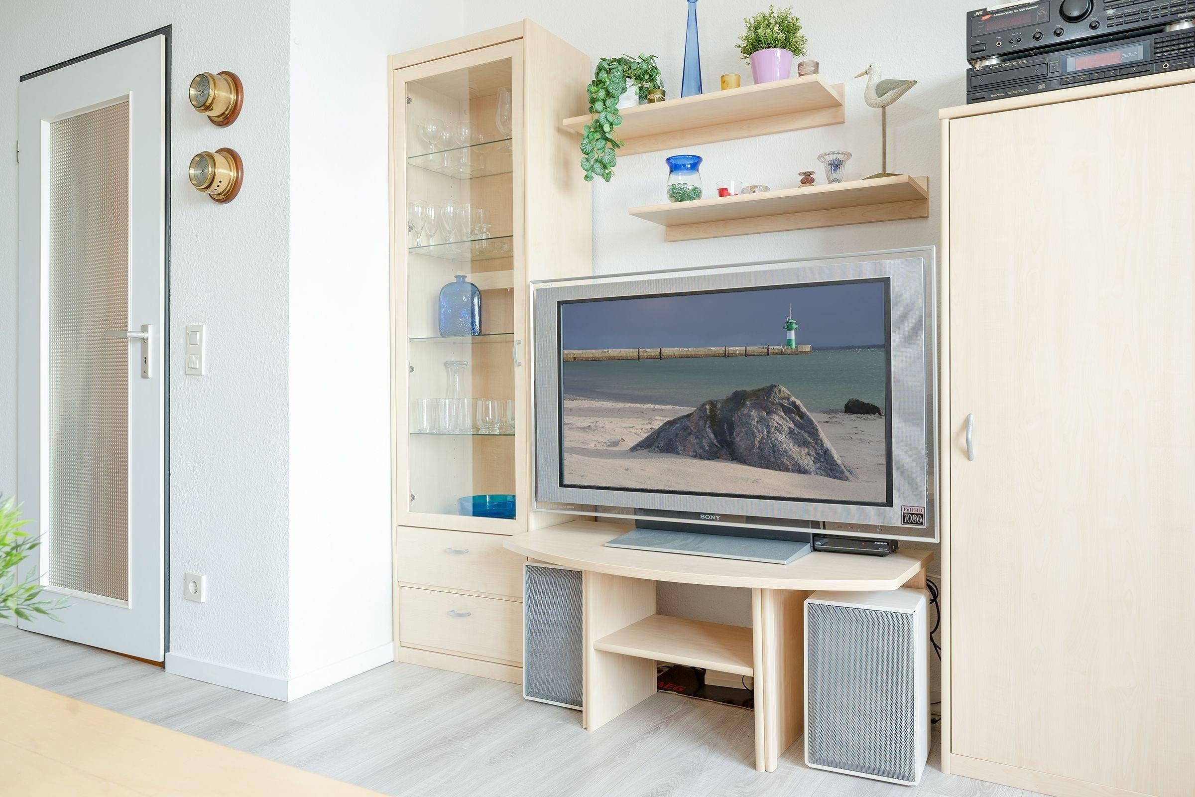 Ein geschmackvoll eingerichteter, heller Wohn- und Schlafraum mit einem Sofa, einem Sessel und einem Fernseher erwartet Sie. Als Schlafmöglichkeit dient hier das komfortable Doppelbett (2x 90x200 cm). Das separate (Kinder-) Schlafzimmer mit Fenster erreichen Sie durch die Küche. Dort steht Ihnen ein Kojenbett (je 80x200 cm) und ein Kleiderschrank zur Verfügung. Außerdem verfügt die Wohnung über eine gut ausgestattete, geschlossene Küche mit z. B. einem 4-Plattenkochfeld, einem Kühlschrank und einem Esstisch. Das innenliegende Badezimmer erwartet Sie mit einer Badewanne. Der überdachte, möblierte Balkon bietet Ihnen einen traumhaften Meerblick. Der WLAN-Anschluss ist selbstverständlich inklusive.