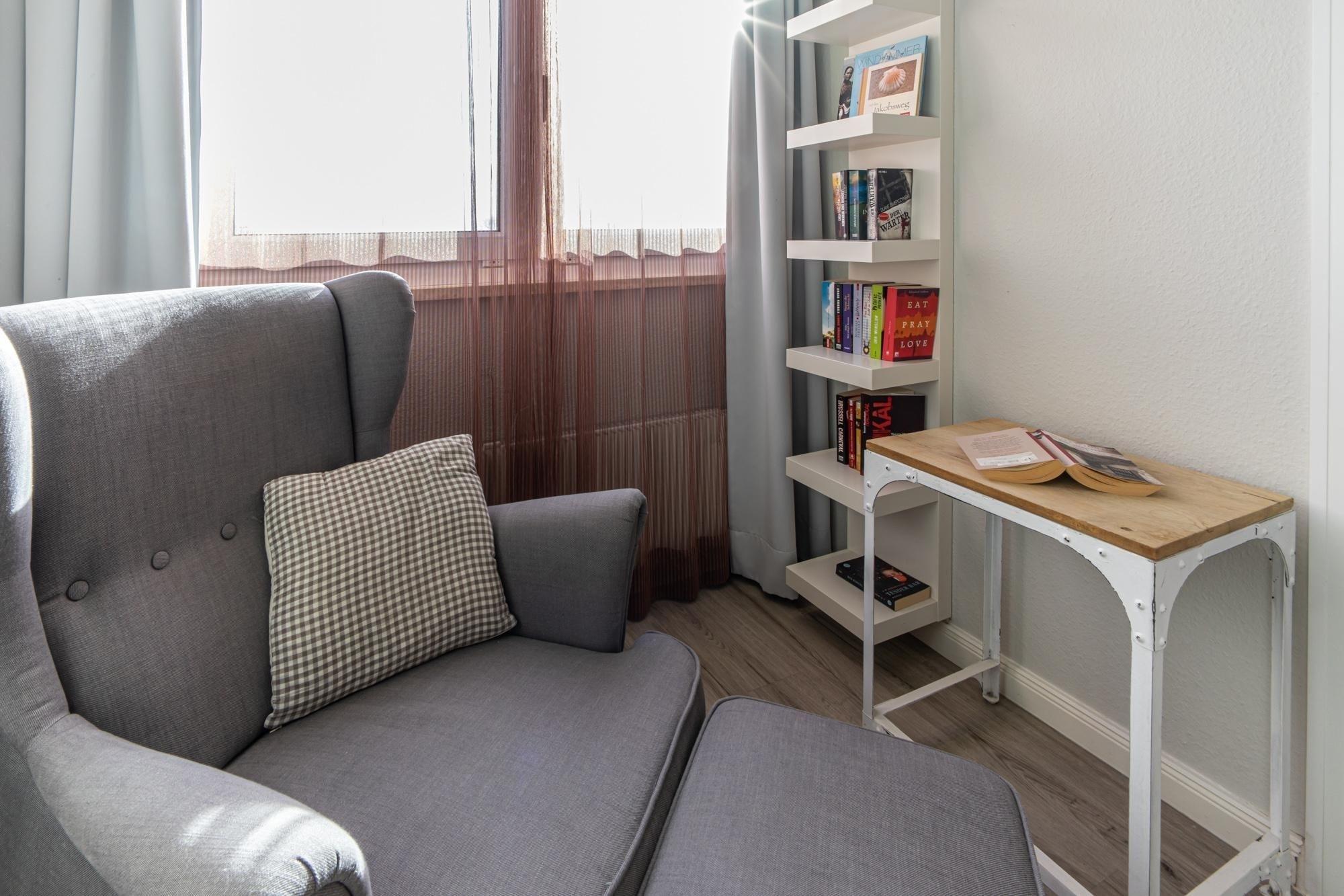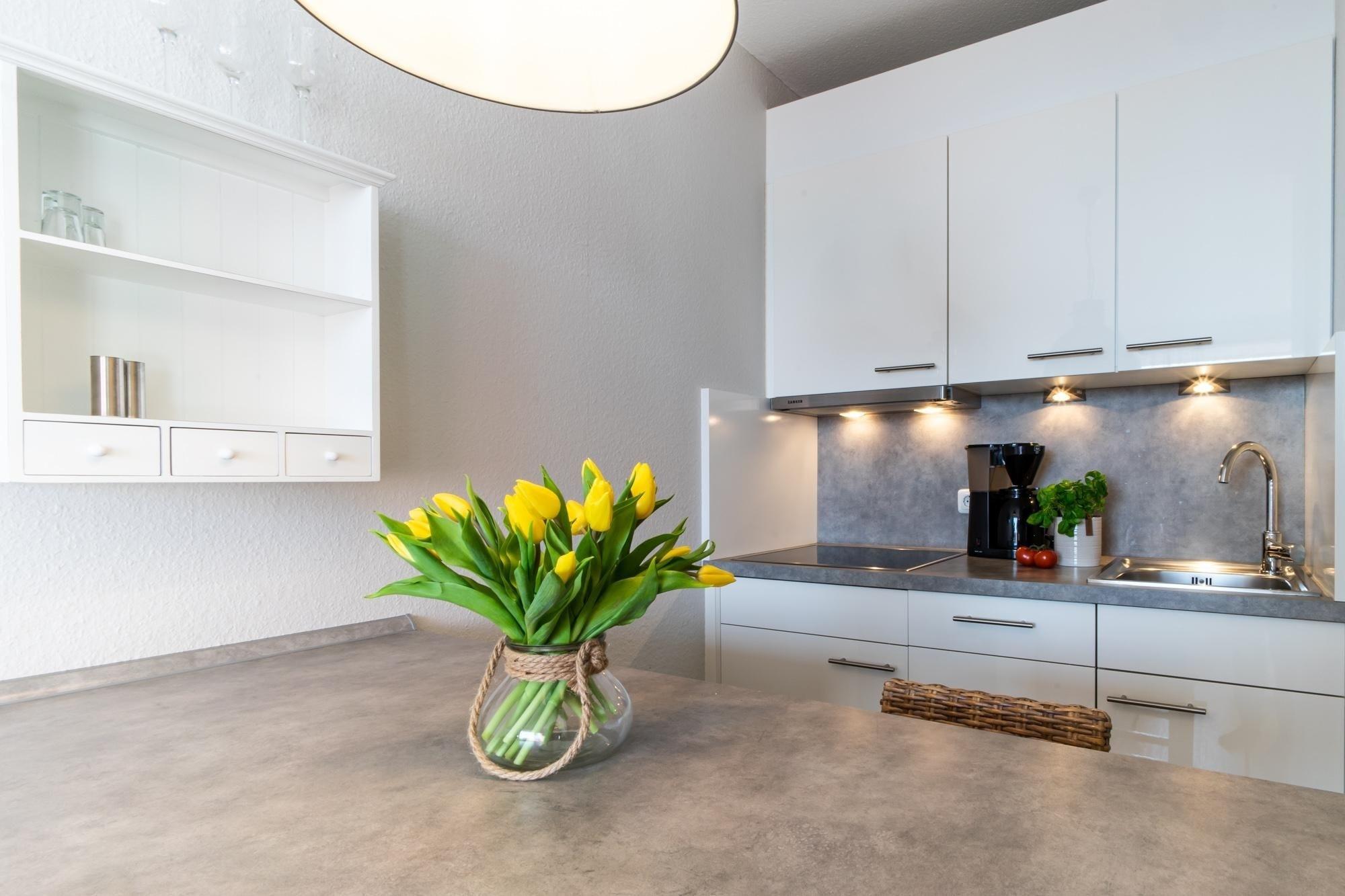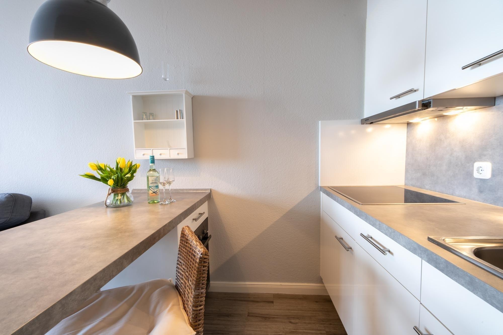 Diese Wohnung ist perfekt für einen Urlaub zu zweit und besticht durch eine moderne und stilvolle Einrichtung. Im kombinierten Wohn- und Schlafzimmer wartet ein komfortables Doppelbett (2x 80x200 cm) sowie ein gemütliches Ecksofa und ein Sessel auf Sie. Für gemütliche Abende nach einem langen Tag am Strand ist ein Flachbildfernseher vorhanden. Die moderne und voll ausgestattete Küche z. B. mit Spülmaschine ist zum Wohnbereich mit einem Tresen abgetrennt. Dort können Sie gemütlich auf 2 Barhockern gemeinsam speisen. Im modernen Badezimmer befindet sich eine Dusche mit niedrigem Einstieg. Von Ihrem Balkon aus haben Sie sogar Meerblick! Der WLAN-Anschluss ist selbstverständlich inklusive.