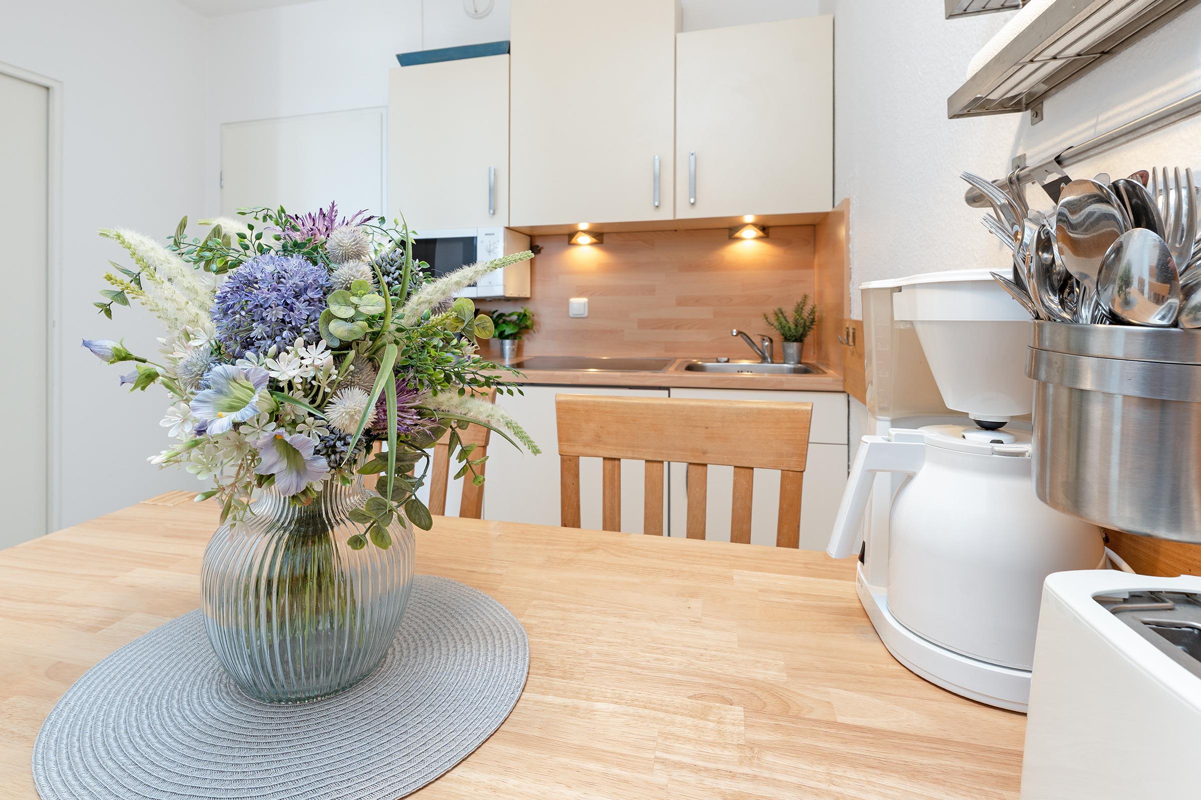 Wohnung war mit Besteck und Geschirr reichlich ausgestattet. Es fehlt eine Dunstabzugshaube. Sonst ist alles vorhanden.