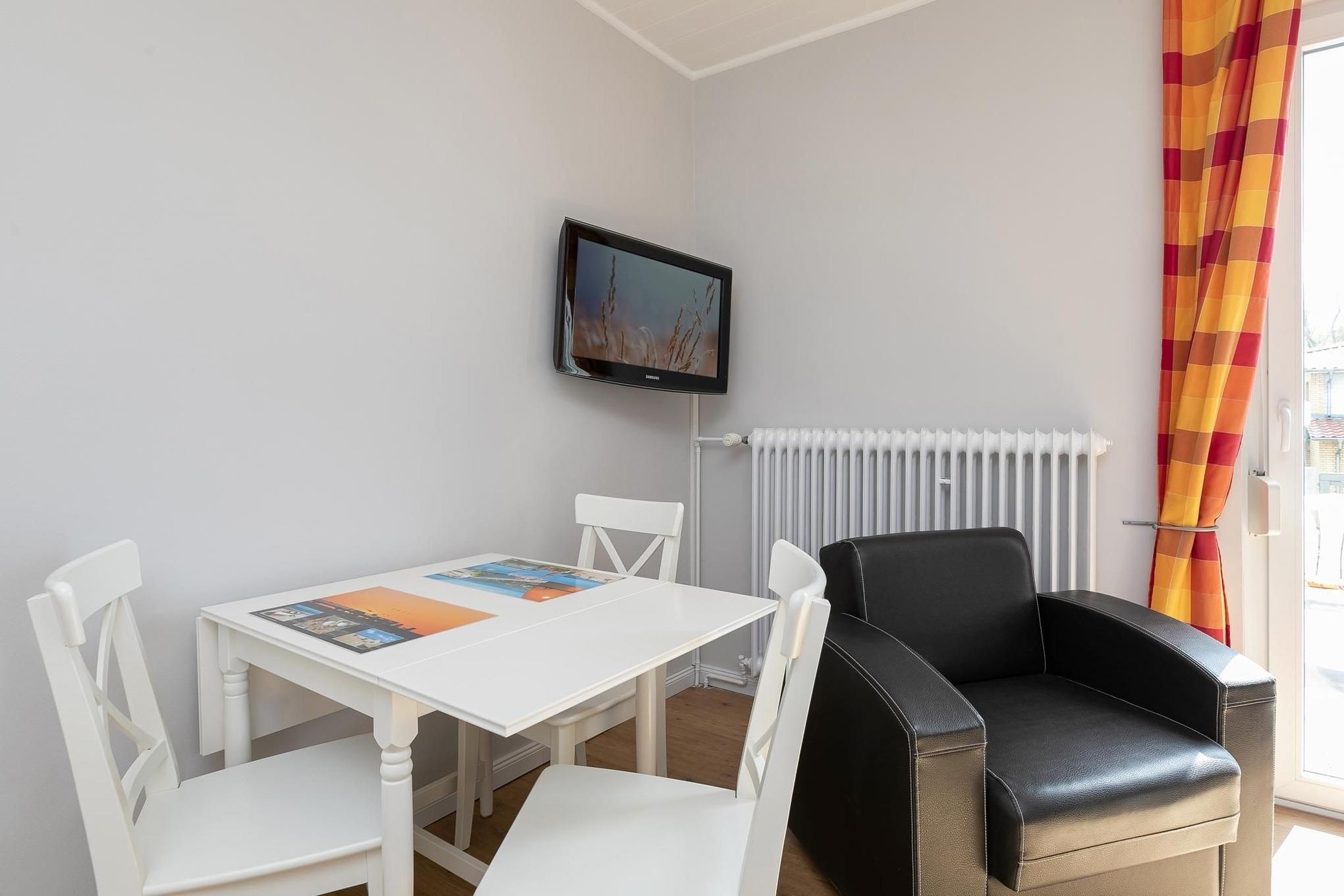 Der gemütliche Wohnraum mit integrierter Küchenzeile verspricht gesellige Abende auf dem Sofa. Ein TV-Gerät und eine Stereoanlage mit CD-Player und Radio sorgen für Unterhaltung. Über ein offenes WLAN-Netzwerk können Sie mit den Daheimgebliebenen in Kontakt bleiben. Auf dem großen möblierten Balkon mit Liegestühlen können Sie bei einem Glas Wein die gute Ostseeluft genießen. In der offenen Küche finden Sie alles, um kulinarische Köstlichkeiten zu zaubern - einen Herd mit Backofen, Kühlschrank, Spülmaschine, Mikrowelle, Kaffeemaschine, Wasserkocher und Toaster. Nebenan befindet sich das gemütliche Schlafzimmer, hier lädt ein komfortables Doppelbett (180x200 cm) zum Träumen ein. Für Ihre Urlaubsgarderobe können Sie im Kleiderschrank verstauen. Das Duschbad befindet sich en suite und ist mit Dusche, WC und Waschbecken ausgestattet.