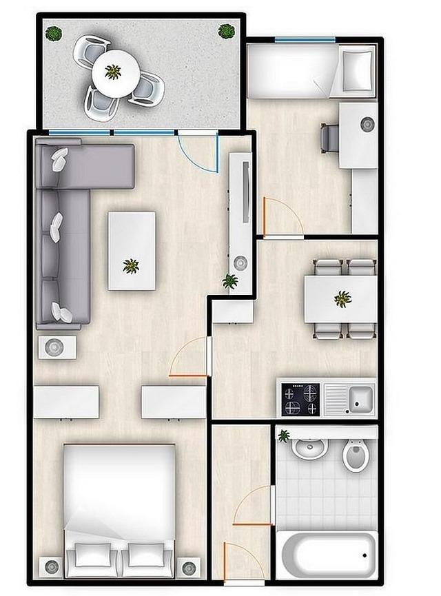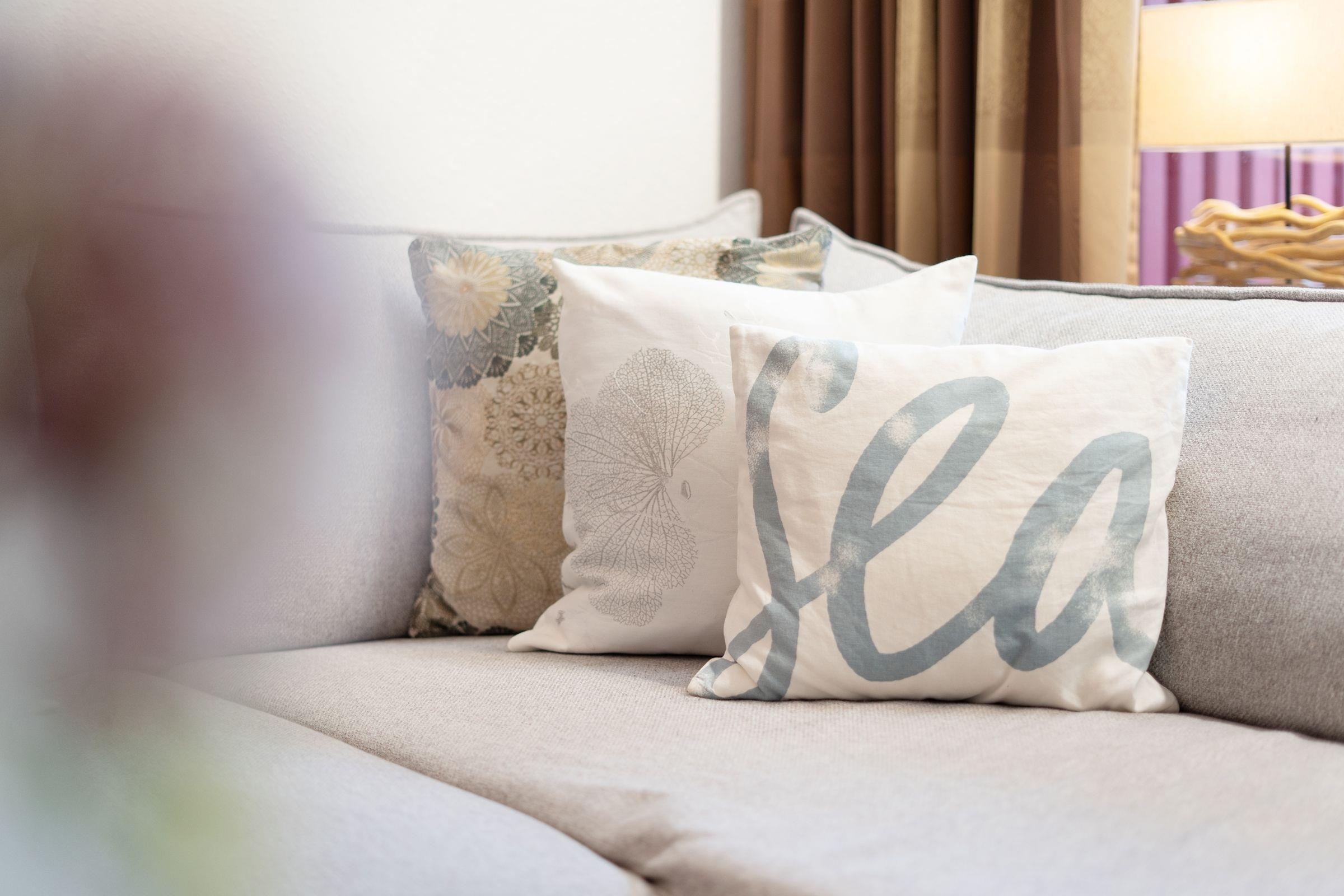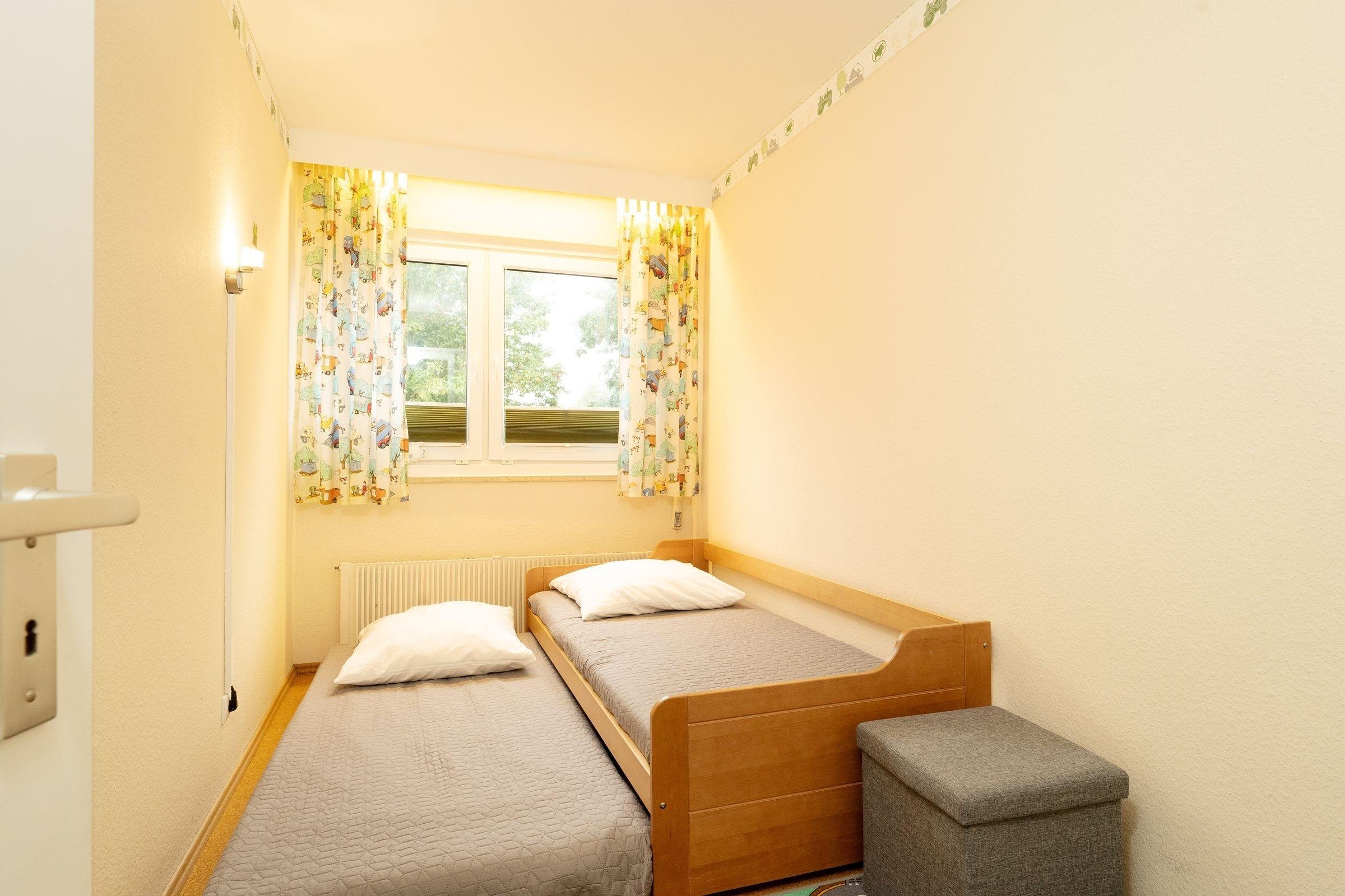 Der kombinierte Wohn- und Schlafraum wird durch einen Raumteiler optisch elegant getrennt. Ein Ecksofa mit Flachbildfernseher und ein Essplatz bilden den Mittelpunkt. Der gemütliche Schlafbereich im hinteren Bereich mit Doppelbett (2x 90x200 cm) lädt abends zum Träumen und Entspannen ein. Die kleine Küche ist durchdacht ausgestattet und Sie können hier Ihre Lieben verwöhnen. In einem separaten Kinderzimmer lässt sich das Kojenbett um einen zweiten Schlafplatz erweitern (je 90x200 cm). Abgerundet wird die Ausstattung dieser Wohnung durch das Wannenbad. Auf dem möblierten, zur Landseite gelegenen Balkon können Sie die Nachmittagssonne und die gesunde Ostseeluft genießen.