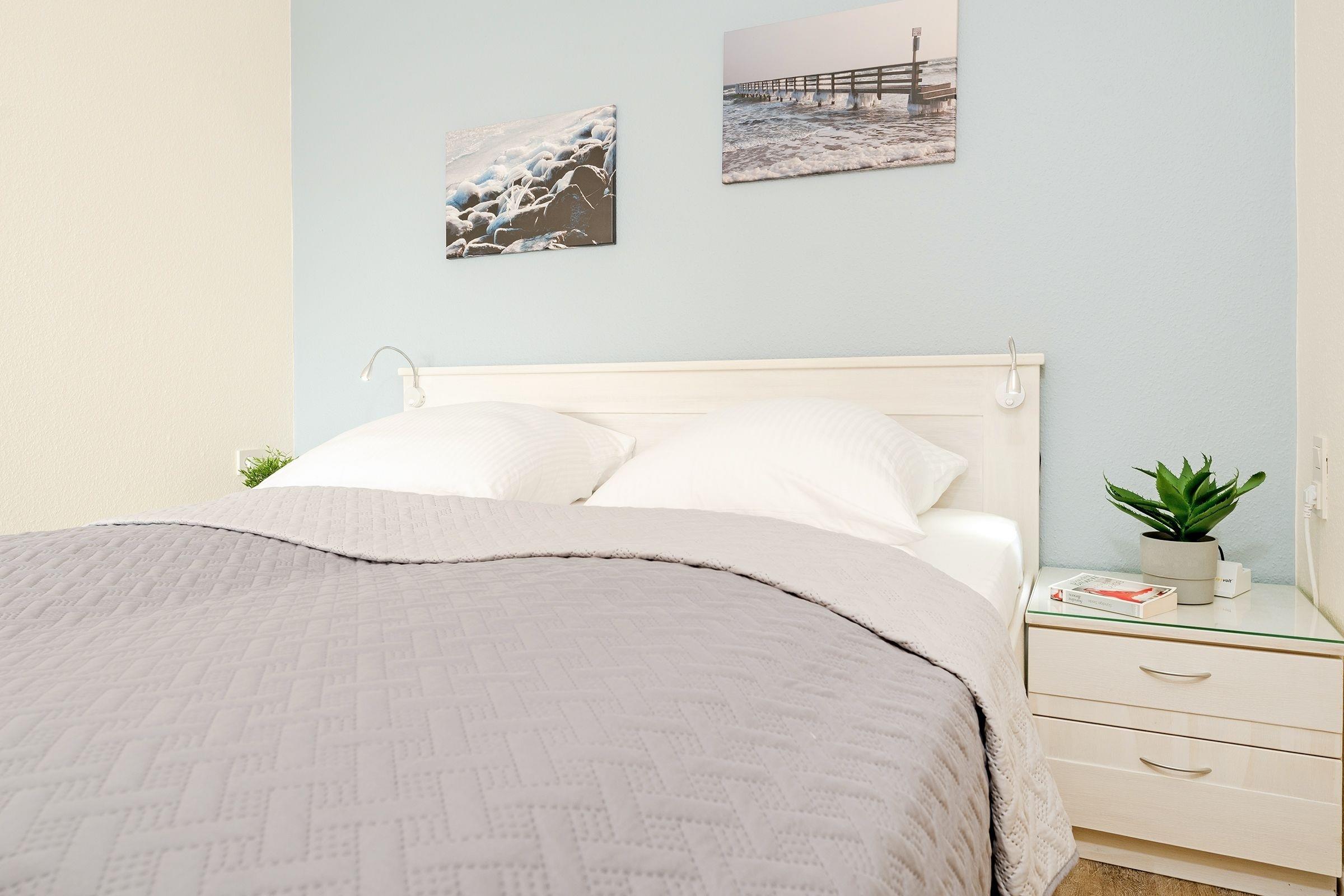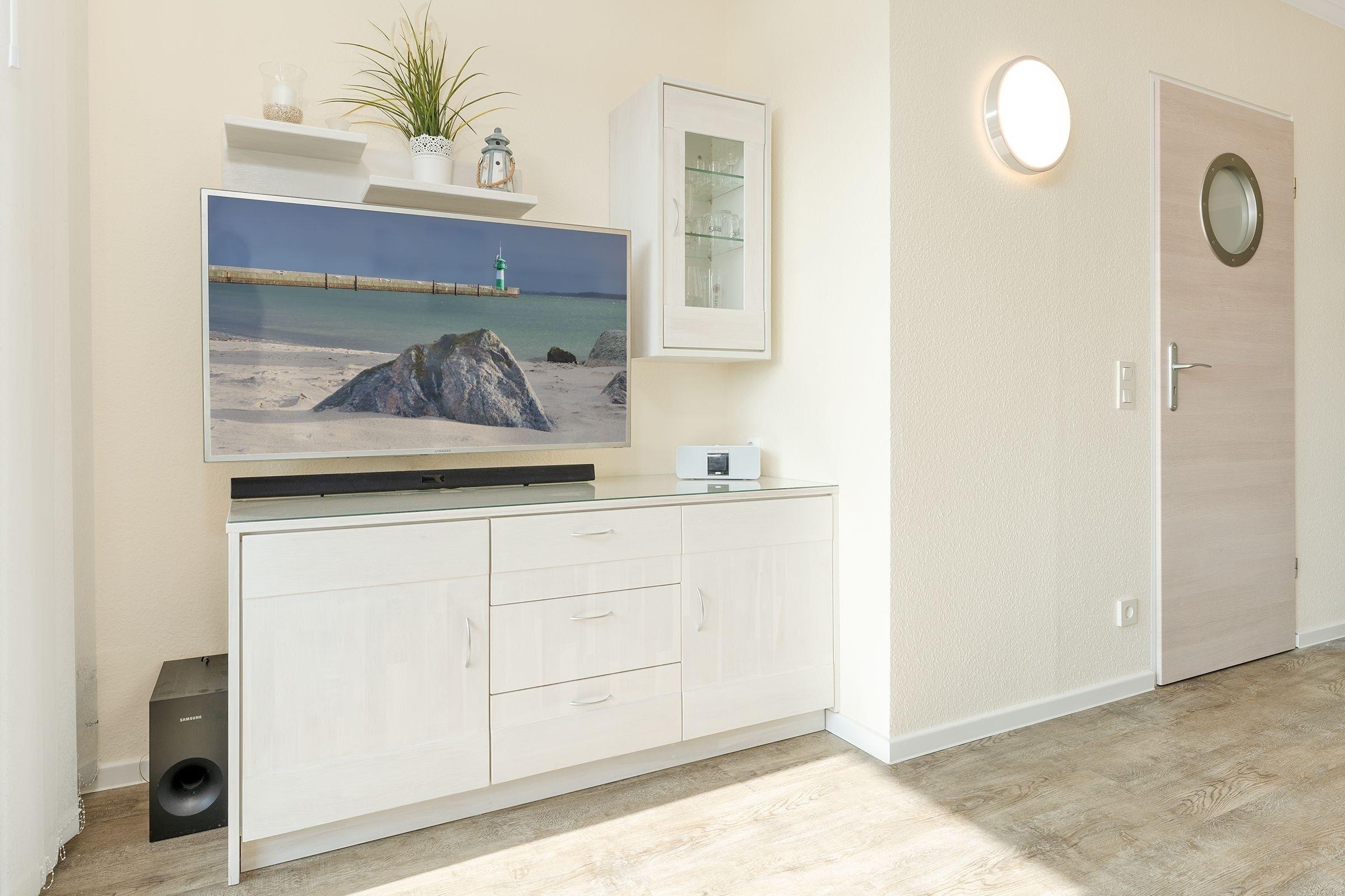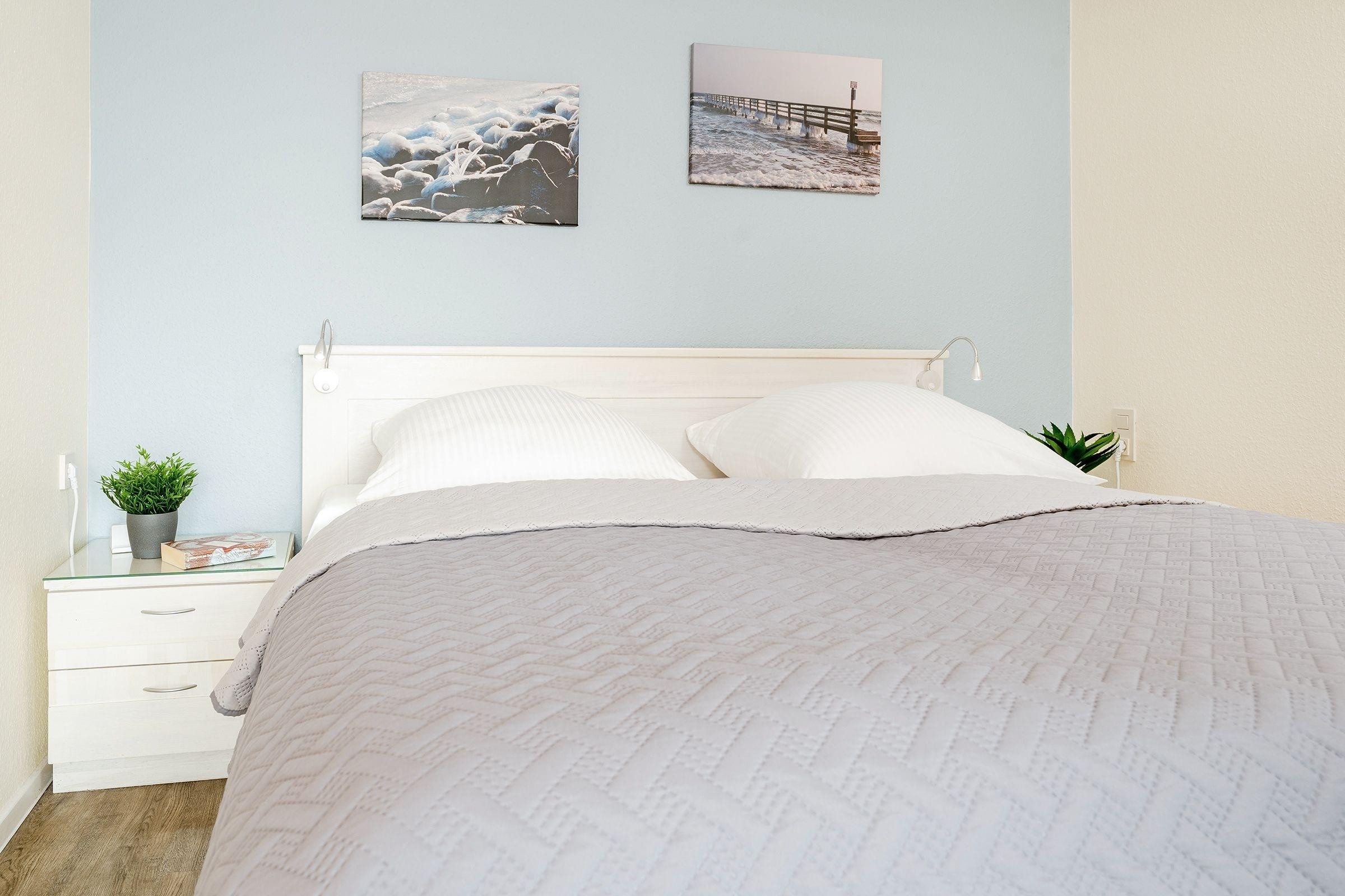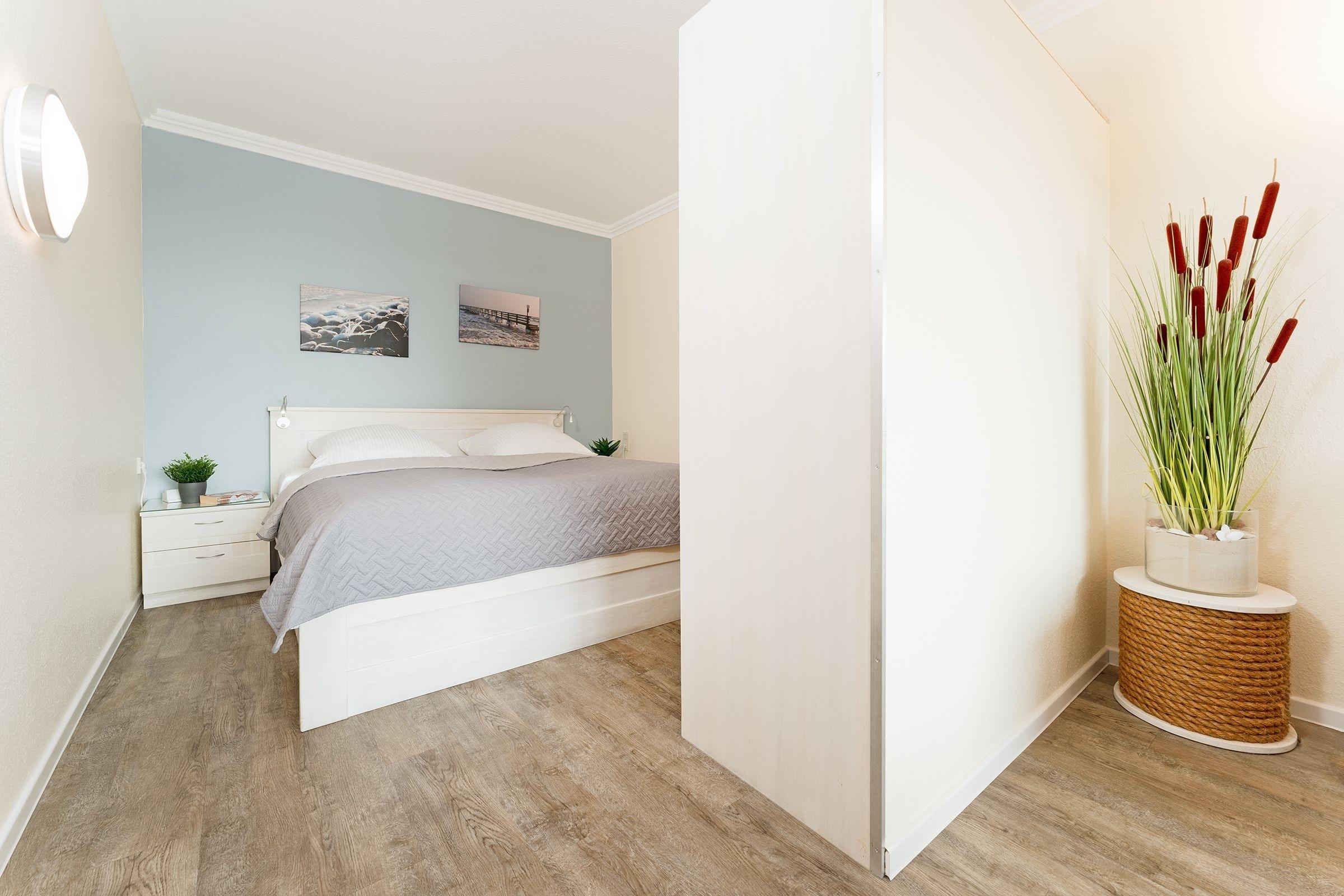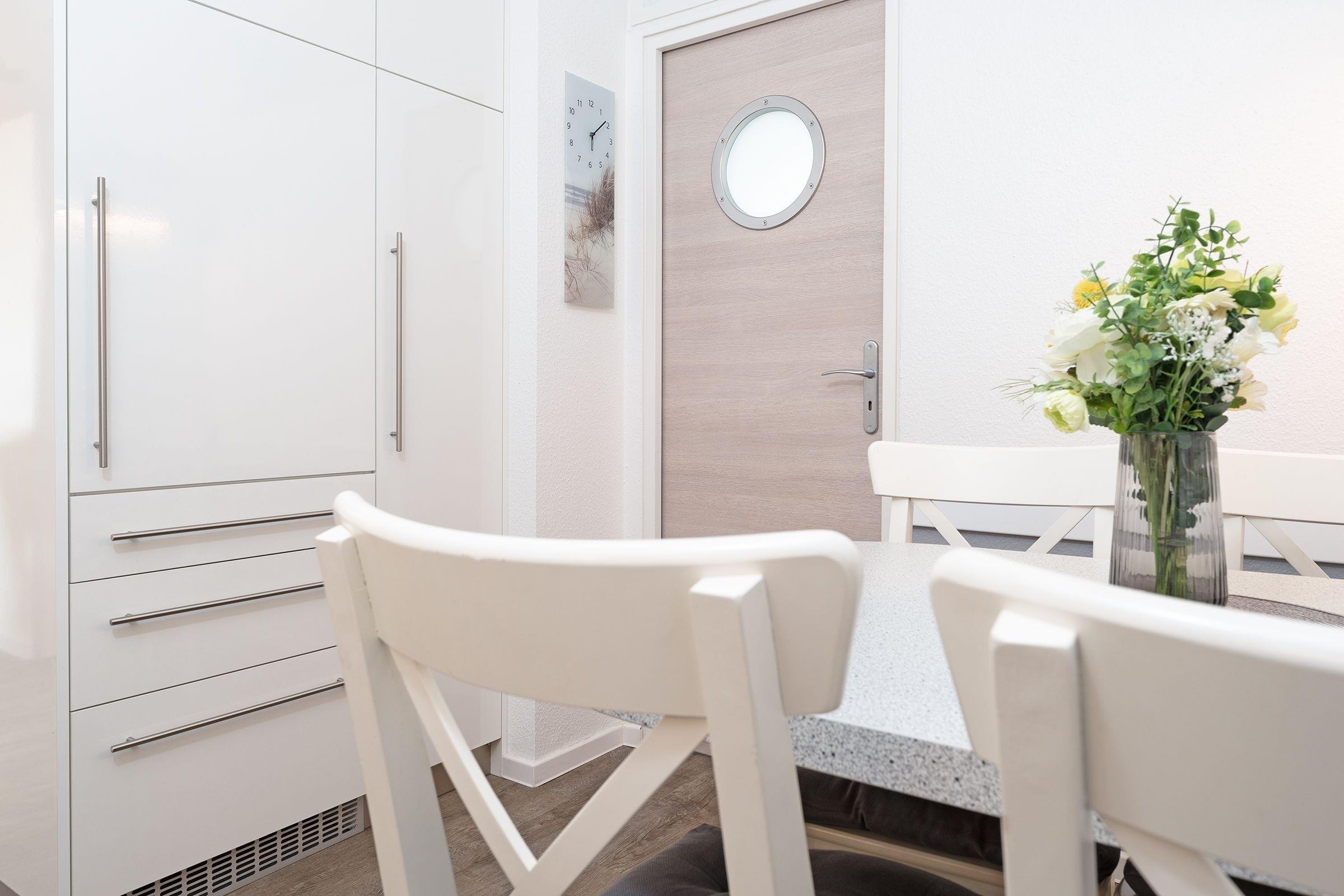 Der helle und freundliche Flur bietet Ihnen mit der Garderobe und dem Schuhschrank die Möglichkeit, Ihre Jacken und Schuhe abzulegen. Geradeaus gelangen Sie in den großen Wohn- und Schlafbereich mit Doppelbett (2 x 90x200). Der große Kleiderschrank dient auch als Raumteiler zwischen dem Wohn- und Schlafbereich. Im Wohnbereich befindet sich eine gemütliche Sitzecke mit Flachbildfernseher und direktem Zugang zum möblierten Balkon. Die separate Küche mit Esstisch ist gut ausgestattet und bietet viele Extras. Das separate Schlafzimmer hält 2 Einzelbetten (je 80x200 cm), einen Kleiderschrank sowie einen weiteren Fernseher für Sie bereit. Das Badezimmer mit Badewanne rundet diese Wohnung perfekt ab. Ein absolutes Highlight sind hier die Türen mit Bullaugen. Der WLAN-Anschluss ist selbstverständlich inklusive.