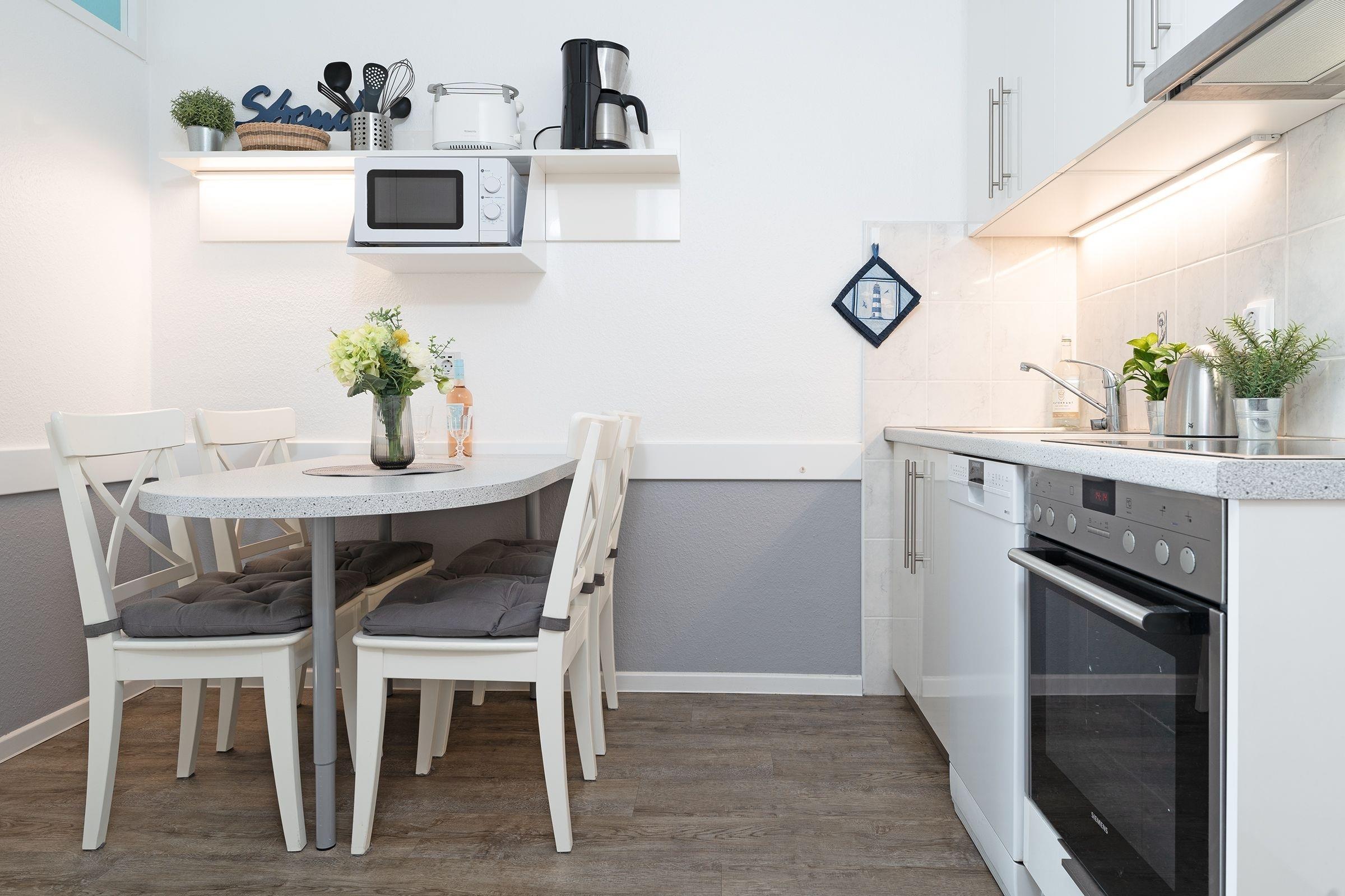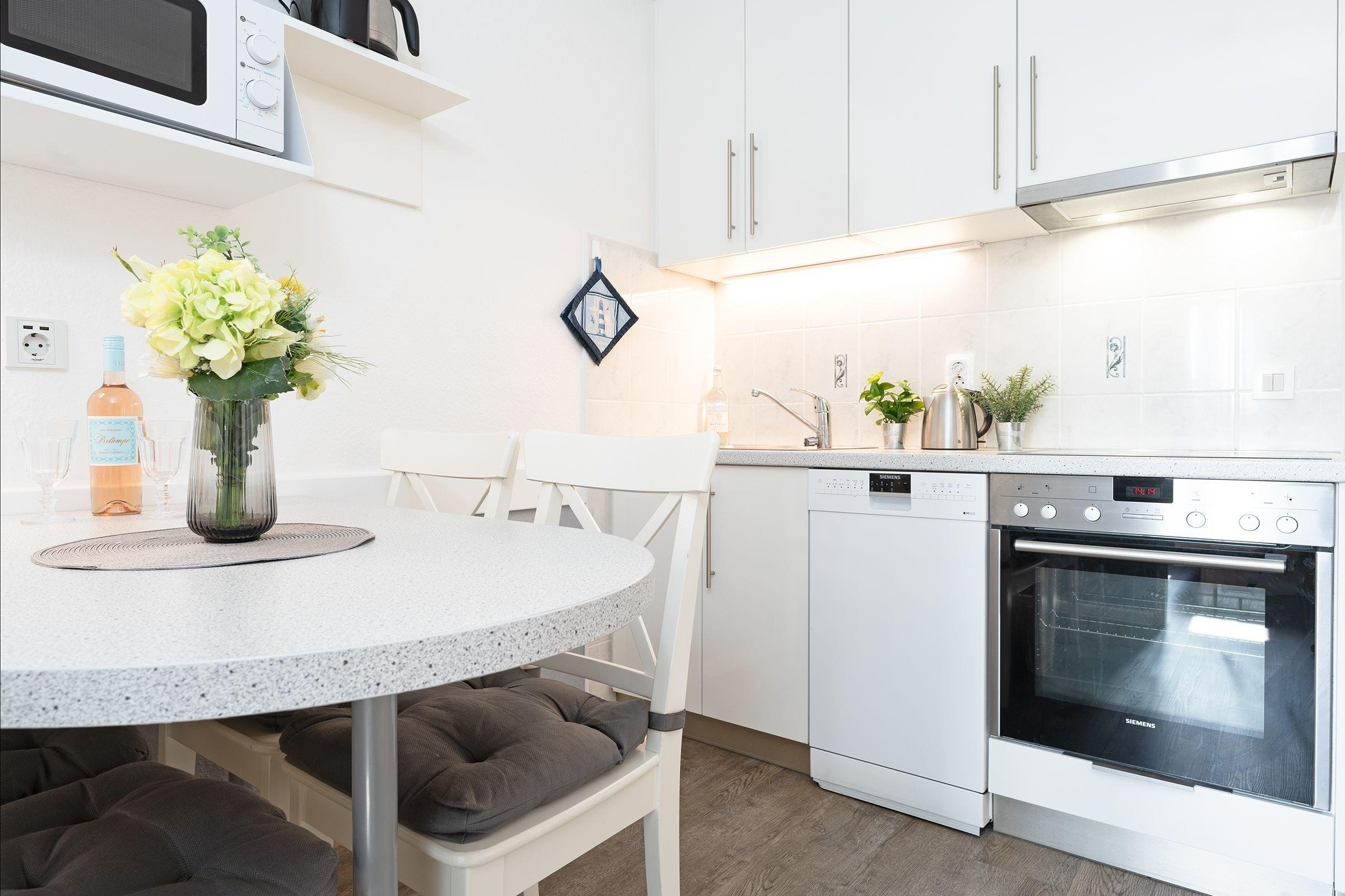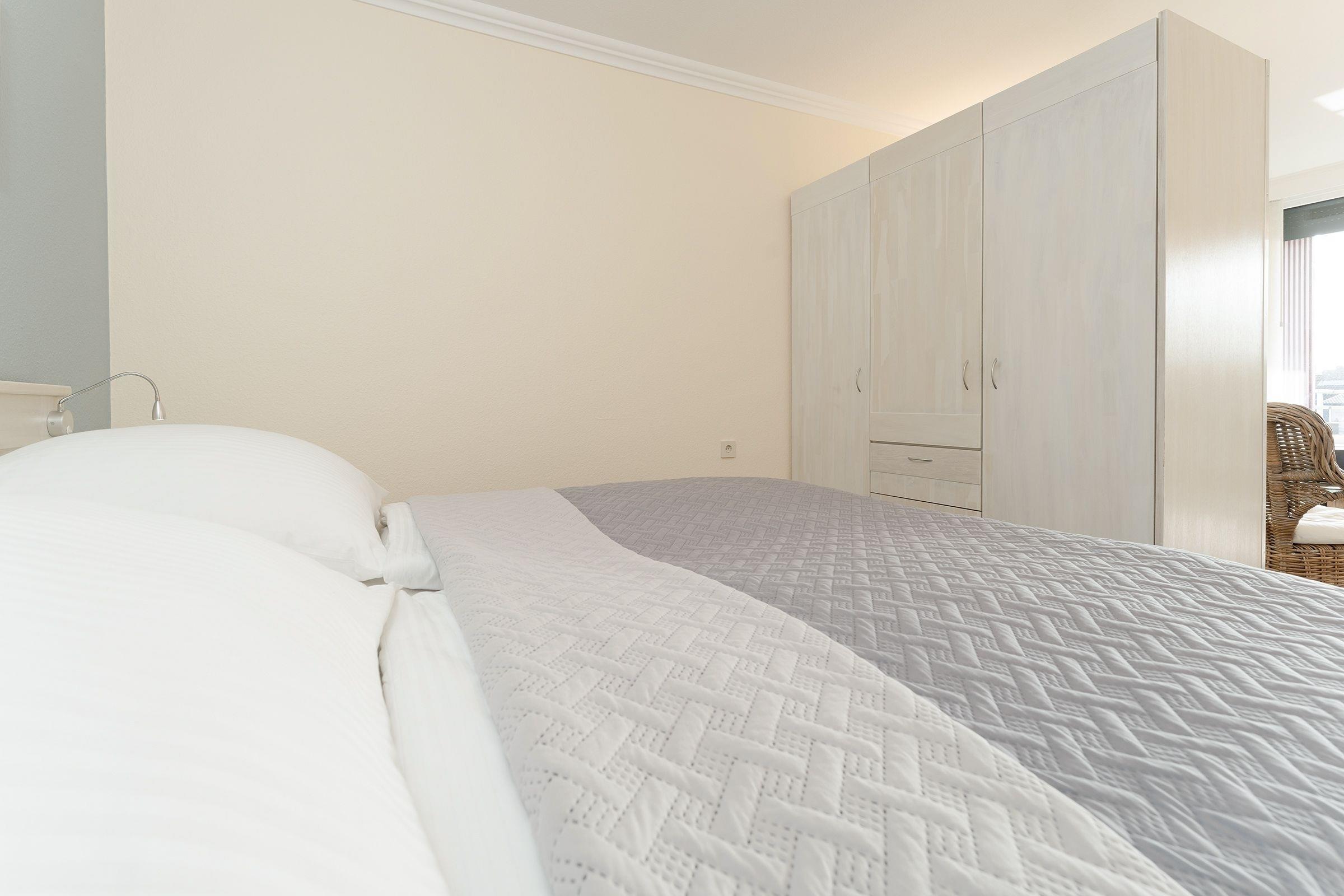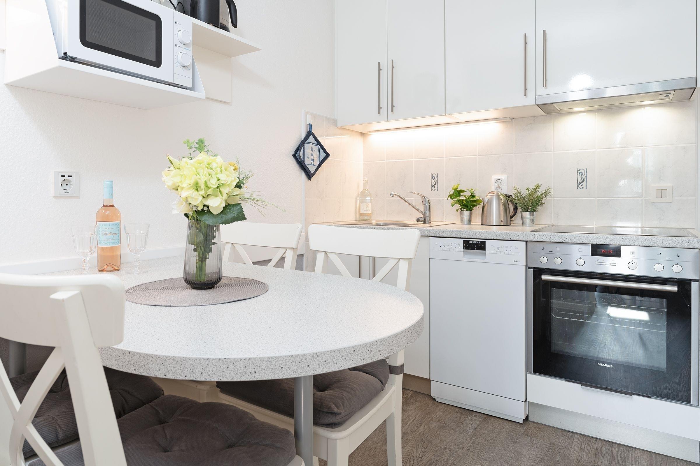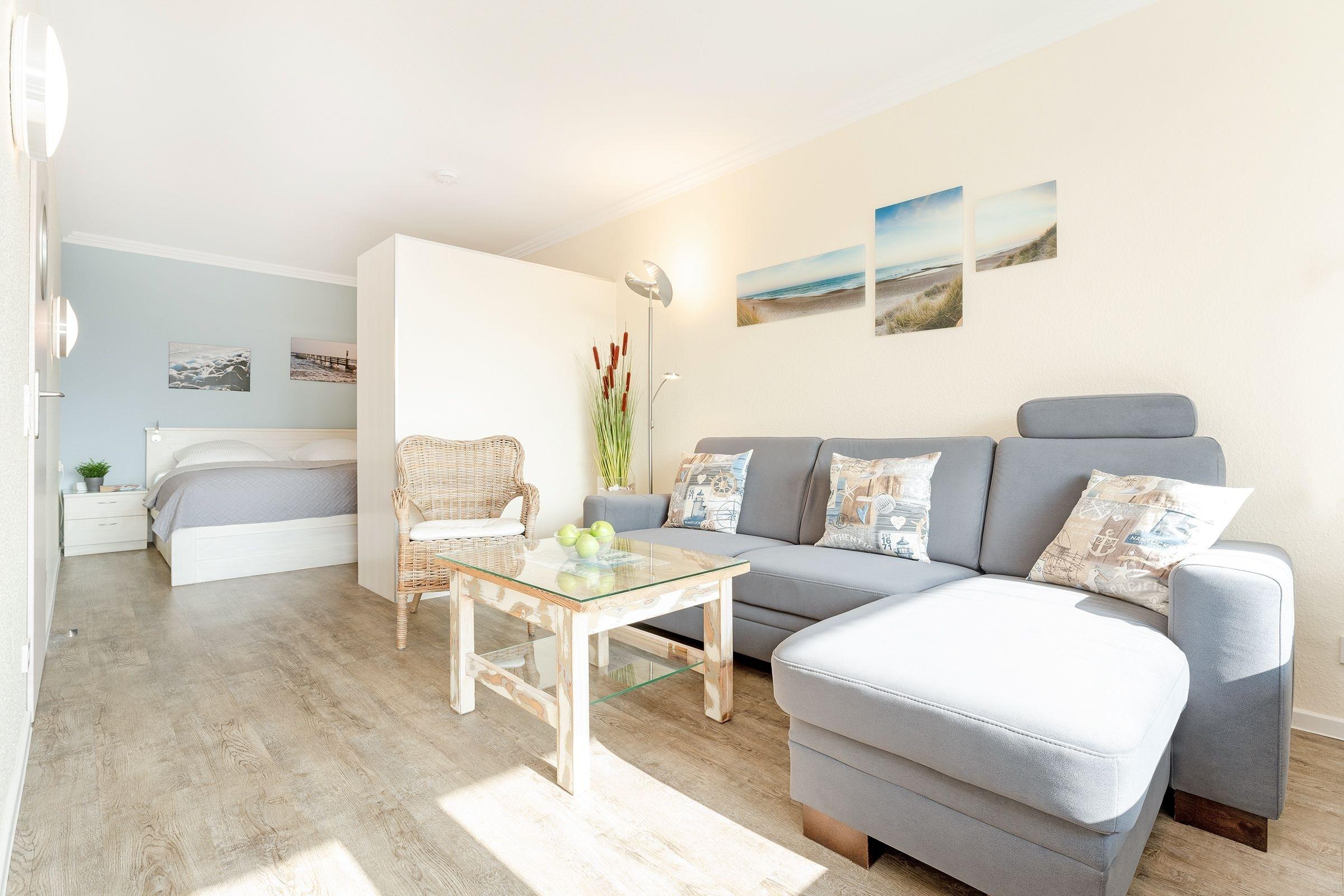 Der helle und freundliche Flur bietet Ihnen mit der Garderobe und dem Schuhschrank die Möglichkeit, Ihre Jacken und Schuhe abzulegen. Geradeaus gelangen Sie in den großen Wohn- und Schlafbereich mit Doppelbett (2 x 90x200). Der große Kleiderschrank dient auch als Raumteiler zwischen dem Wohn- und Schlafbereich. Im Wohnbereich befindet sich eine gemütliche Sitzecke mit Flachbildfernseher und direktem Zugang zum möblierten Balkon. Die separate Küche mit Esstisch ist gut ausgestattet und bietet viele Extras. Das separate Schlafzimmer hält 2 Einzelbetten (je 80x200 cm), einen Kleiderschrank sowie einen weiteren Fernseher für Sie bereit. Das Badezimmer mit Badewanne rundet diese Wohnung perfekt ab. Ein absolutes Highlight sind hier die Türen mit Bullaugen. Der WLAN-Anschluss ist selbstverständlich inklusive.