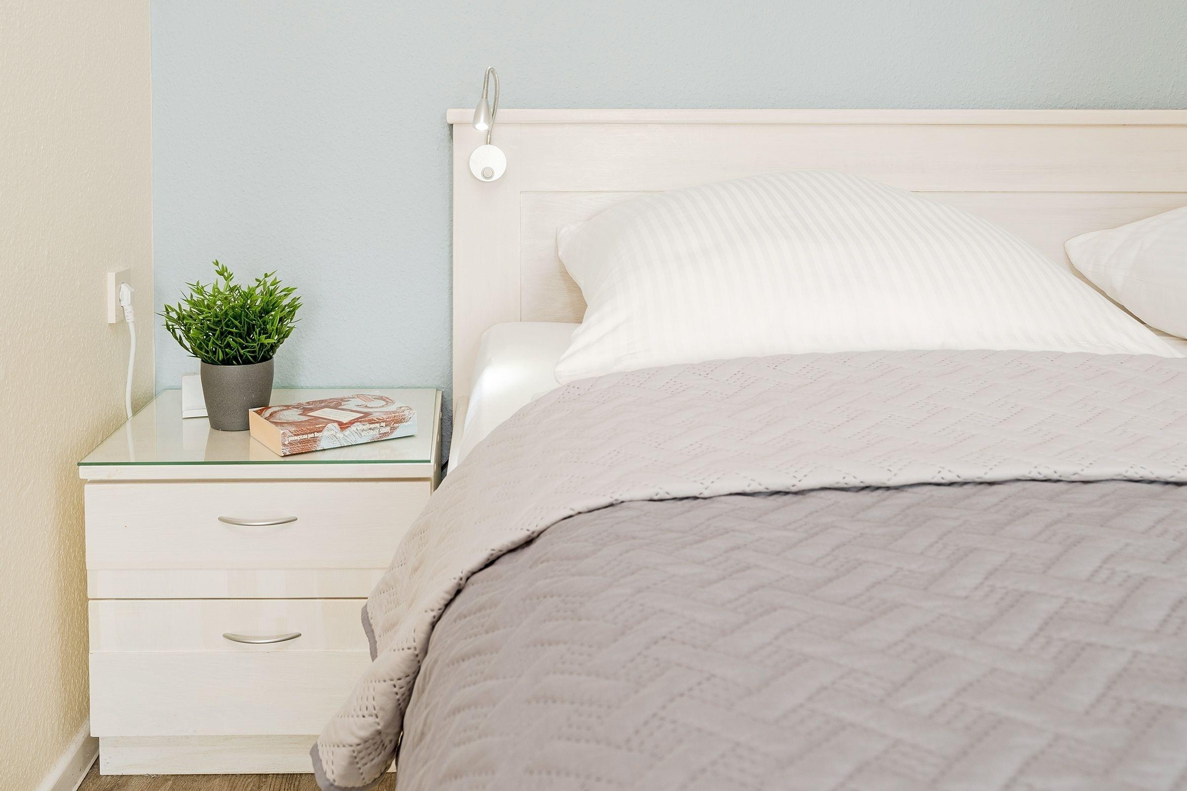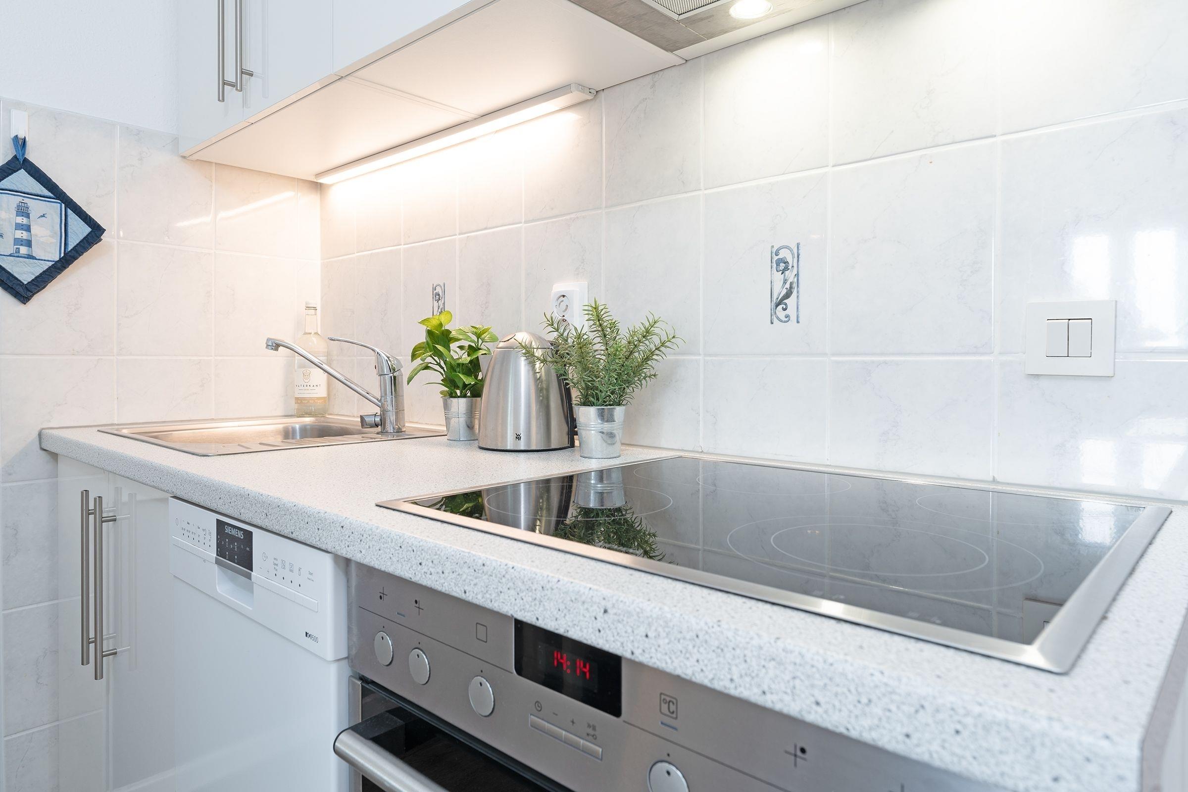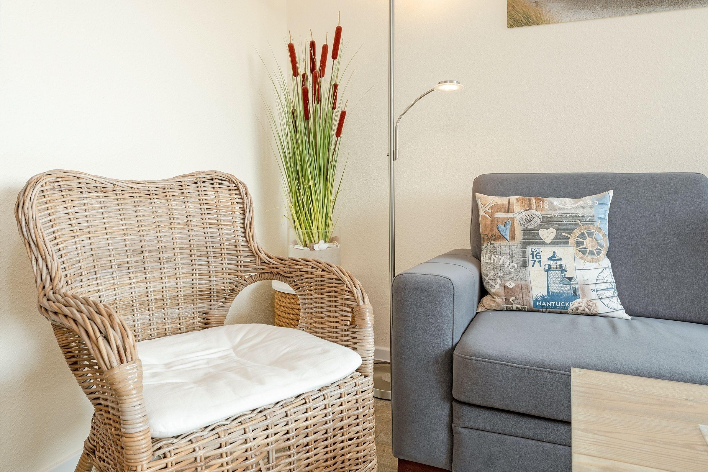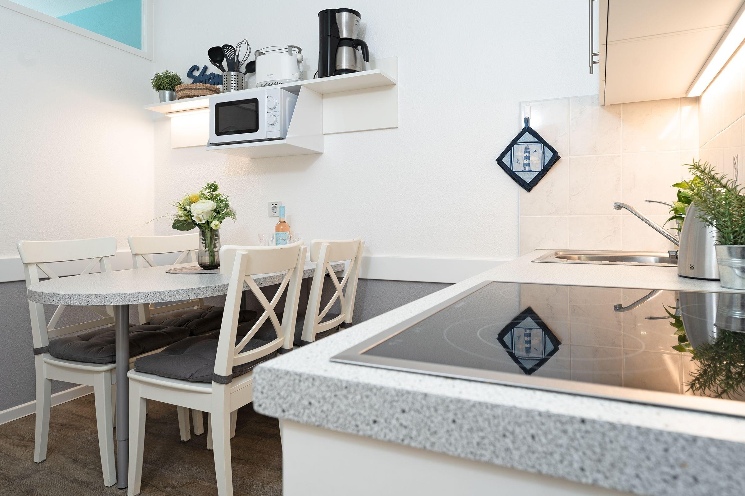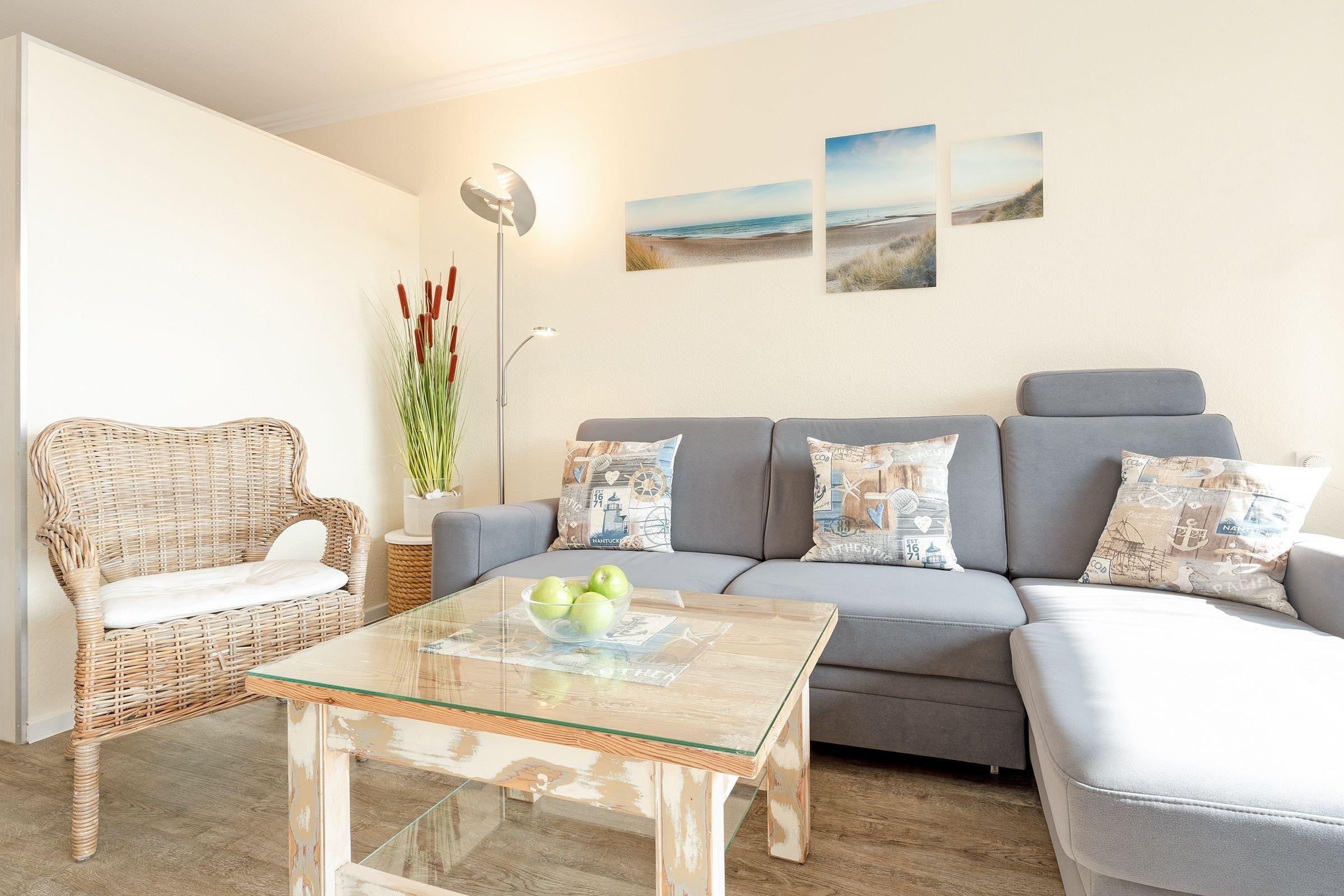 Der helle und freundliche Flur bietet Ihnen mit der Garderobe und dem Schuhschrank die Möglichkeit, Ihre Jacken und Schuhe abzulegen. Geradeaus gelangen Sie in den großen Wohn- und Schlafbereich mit Doppelbett (2 x 90x200). Der große Kleiderschrank dient auch als Raumteiler zwischen dem Wohn- und Schlafbereich. Im Wohnbereich befindet sich eine gemütliche Sitzecke mit Flachbildfernseher und direktem Zugang zum möblierten Balkon. Die separate Küche mit Esstisch ist gut ausgestattet und bietet viele Extras. Das separate Schlafzimmer hält 2 Einzelbetten (je 80x200 cm), einen Kleiderschrank sowie einen weiteren Fernseher für Sie bereit. Das Badezimmer mit Badewanne rundet diese Wohnung perfekt ab. Ein absolutes Highlight sind hier die Türen mit Bullaugen. Der WLAN-Anschluss ist selbstverständlich inklusive.