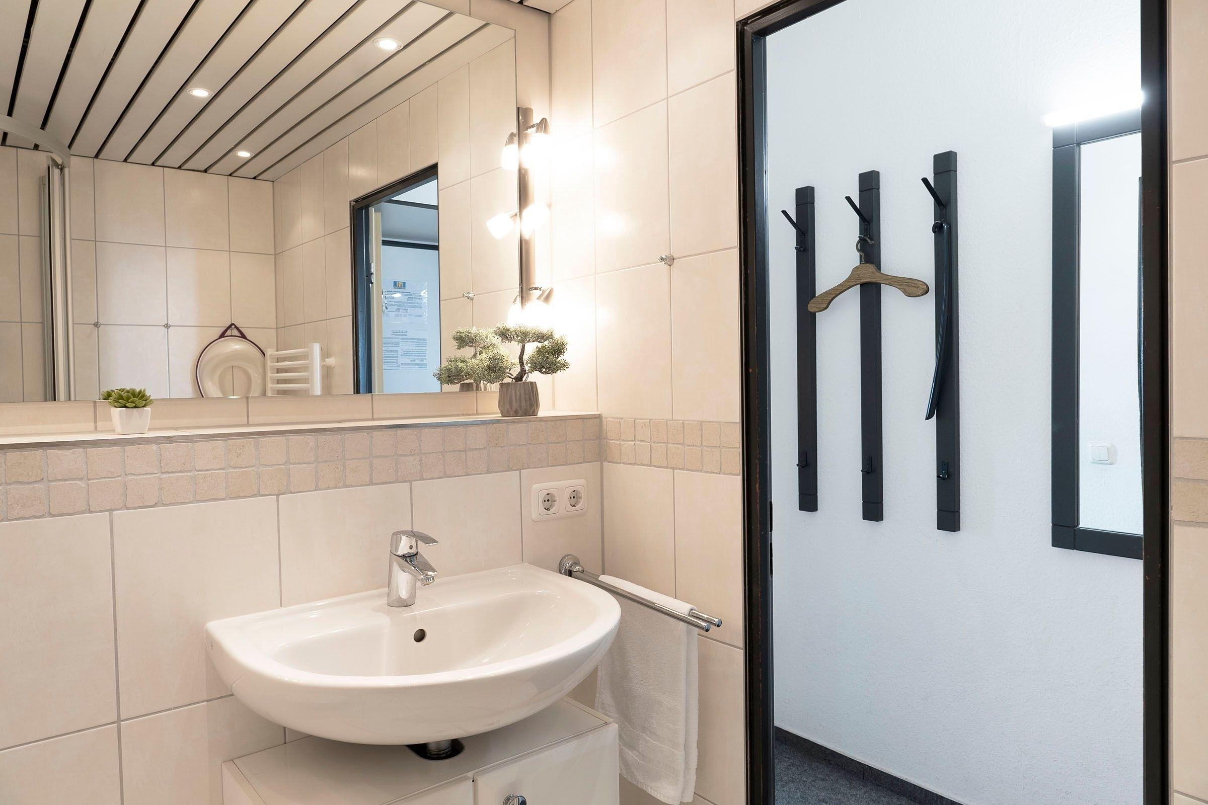 Ein PKW-Tiefgaragenstellplatz ist für Sie reserviert (max. 185 cm Durchfahrtshöhe). Die Nutzung des Hallenbades, der drei Gemeinschafts-Dachterrassen mit Meer- und Landblick sowie des Tischtennisraumes sind für Sie selbstverständlich kostenlos. Ihre mitgebrachten Fahrräder können Sie in einem der 2 Kellerräume in Haus A oder in dem Fahrradraum im Erdgeschoss zwischen Haus A und B abstellen. In Haus D befindet sich auf den Etagen 1 - 4 je ein Gemeinschaftswaschraum mit Waschmaschine und Trockner (gegen Gebühr/Münzgeräte).