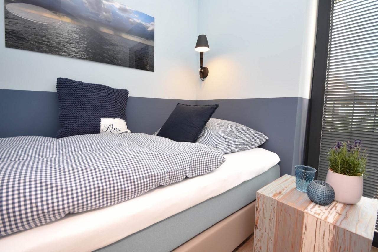 Schlafzimmer 2: 1 Boxspring-Doppelbett (160x200 cm), Kleiderschrank, Verdunkelungsmöglichkeit