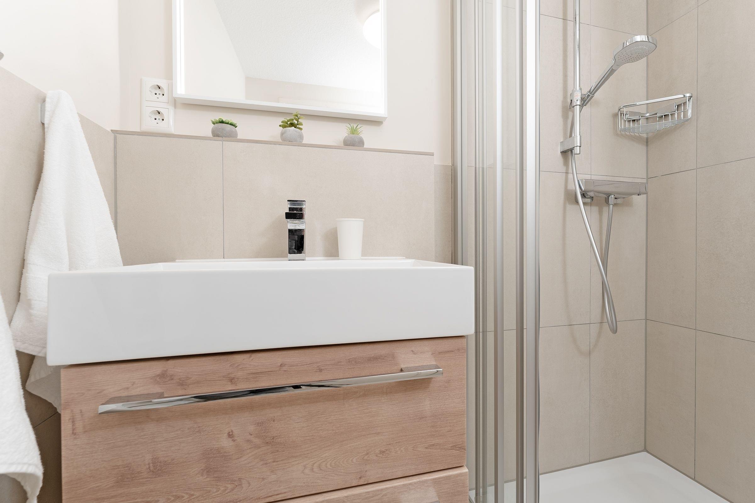 Verweilen Sie im gemütlichen Wohnbereich auf dem Sofa und lesen ein gutes Buch oder lassen sich vom Fernsehprogramm unterhalten. Die separate, gut ausgestattete Küche hält viele Annehmlichkeiten für ein herrliches Urlaubsmenü bereit. Erholsame Nächte können Sie im Schlafzimmer mit Boxspring-Doppelbett (160x200 cm) verbringen. Als weitere Schlafmöglichkeit dient das Schlafsofa (140x200 cm) im Wohnbereich. Das Badezimmer erwartet Sie mit einer Dusche. Verbringen Sie erholsame Stunden auf der möblierten Terrasse am Haus und genießen Sie die Ruhe.