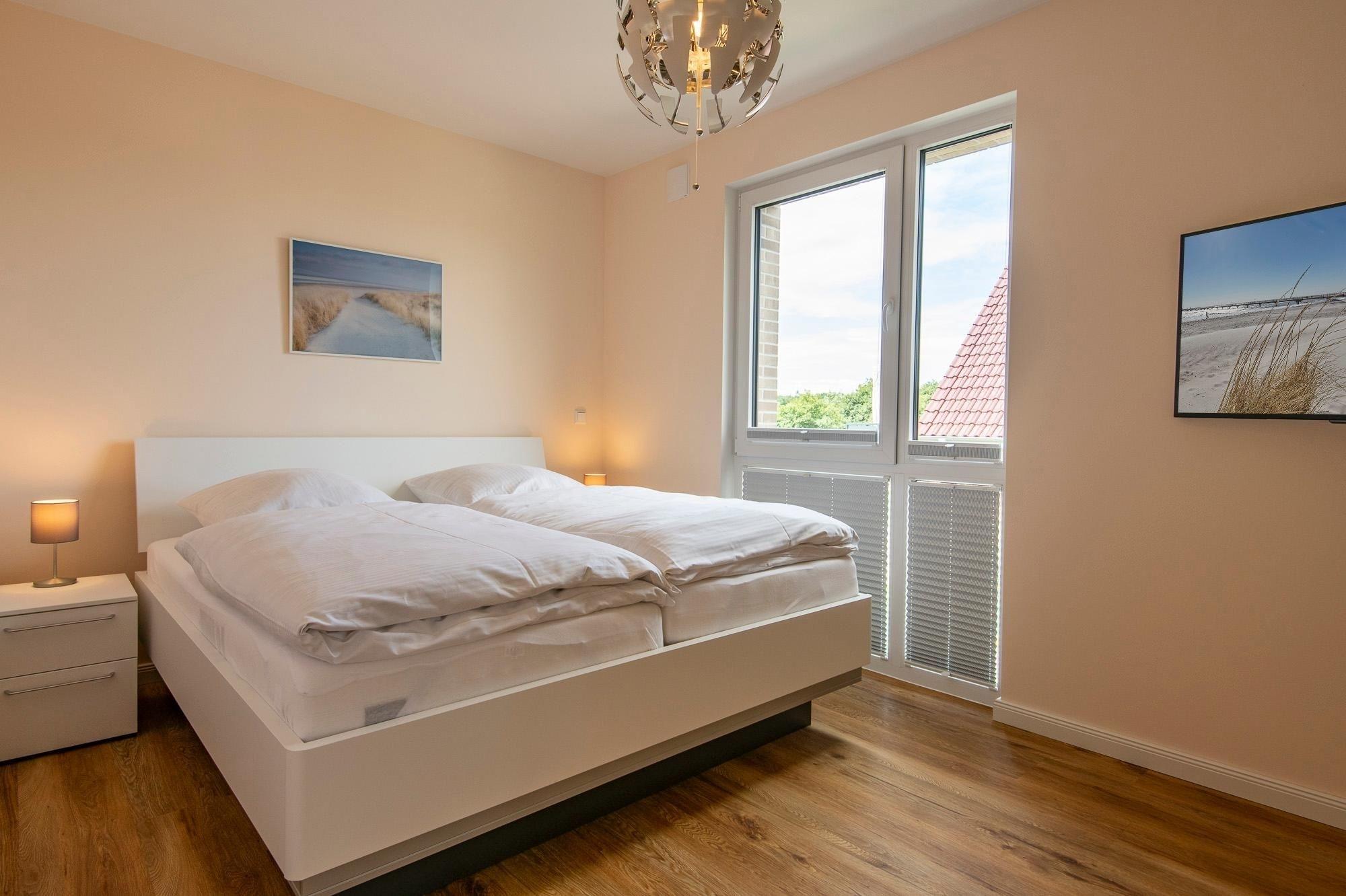 Im separaten Schlafzimmer sorgt ein komfortables Doppelbett (2x90x200cm) für erholsame Nächte und im Wohnzimmer bietet das hochwertige Schlafsofa (Liegefläche ca. 180x240cm) einen weiteren gemütlichen Schlafplatz für zwei. Plissees bieten angenehme Verdunklung. Neben der geschmackvollen Ausstattung sorgt auch die Fußbodenheizung für ein wohliges Ambiente. Das tageslichthelle Wellnessbad begeistert ebenfalls mit Fußbodenheizung, Waschmaschine, Handtuchheizung, sowie bodentiefer Dusche.