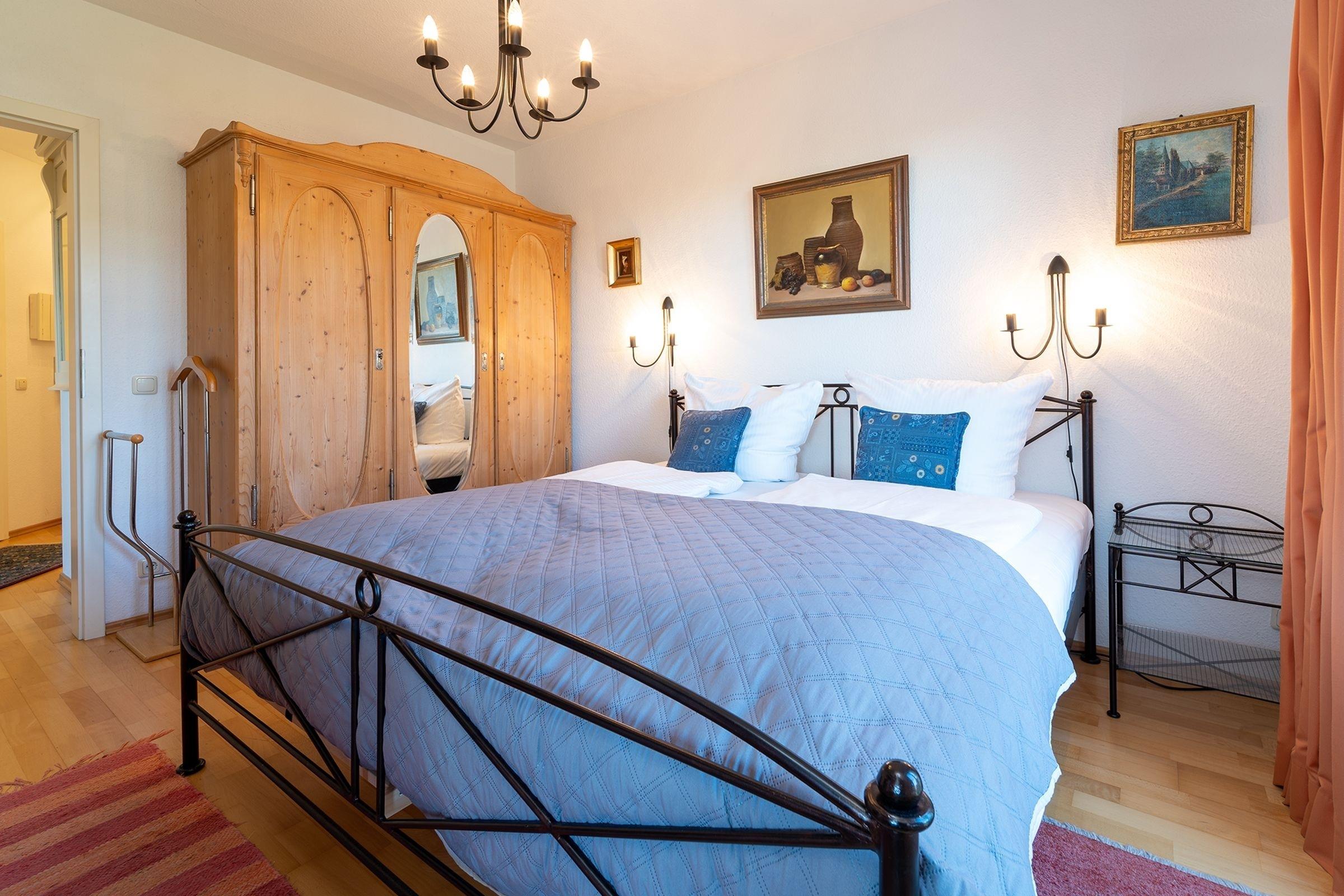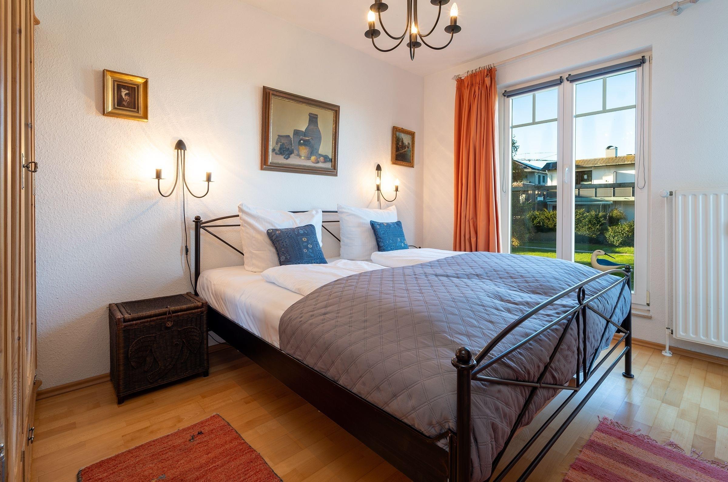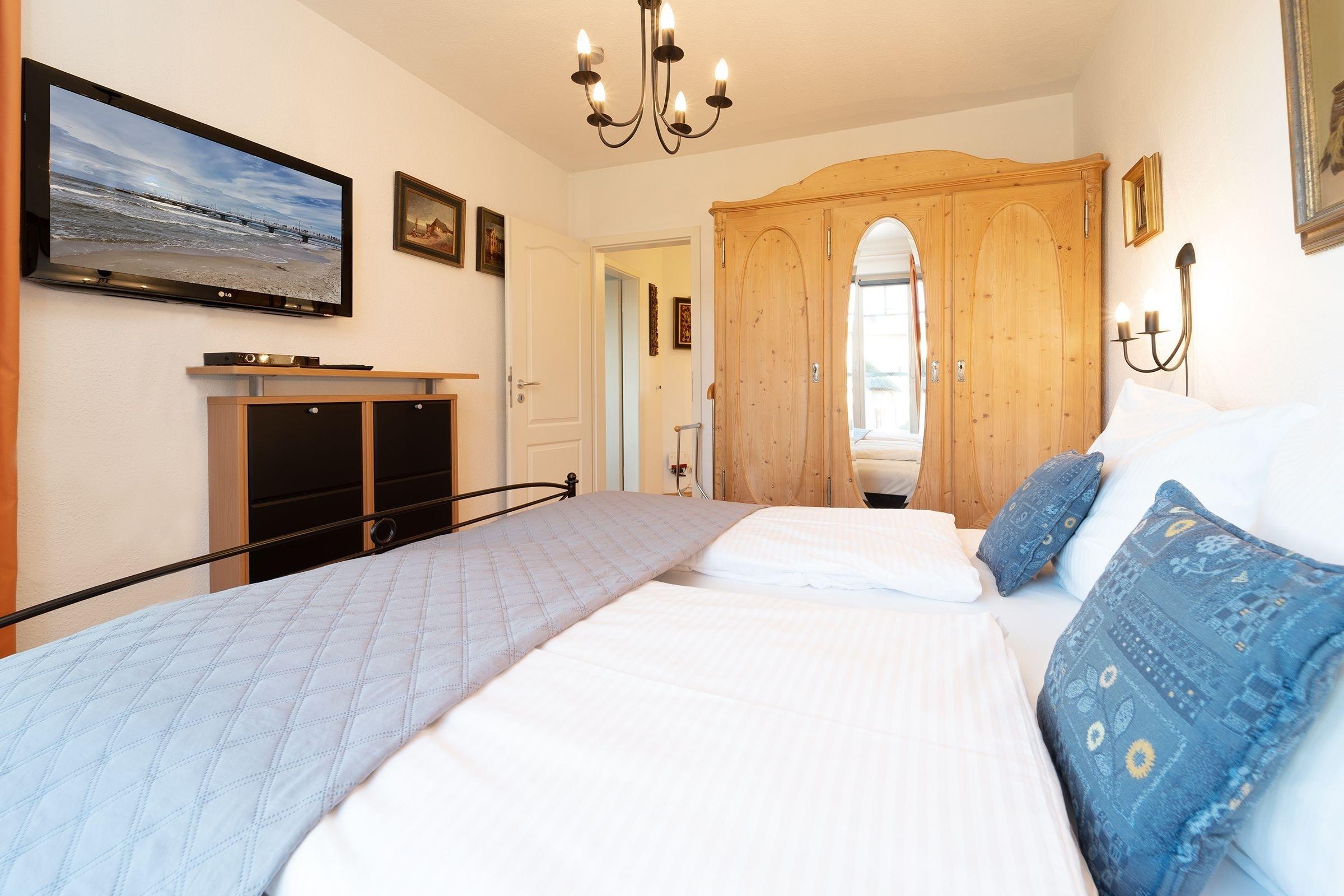 Schlafzimmer: 1 Doppelbett (2x 90x200 cm), TV, Verdunkelungsgardinen