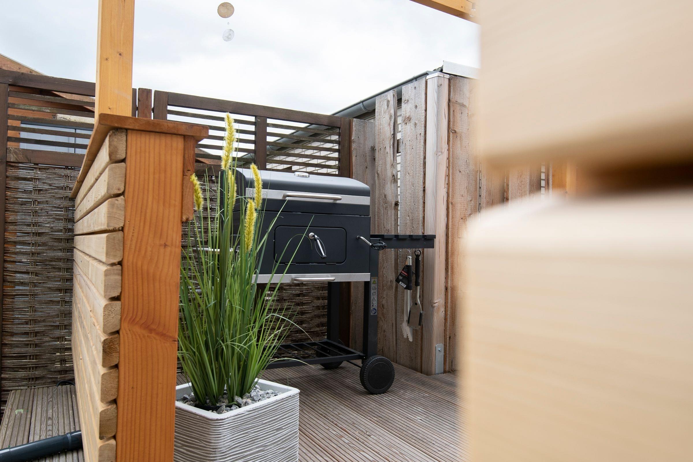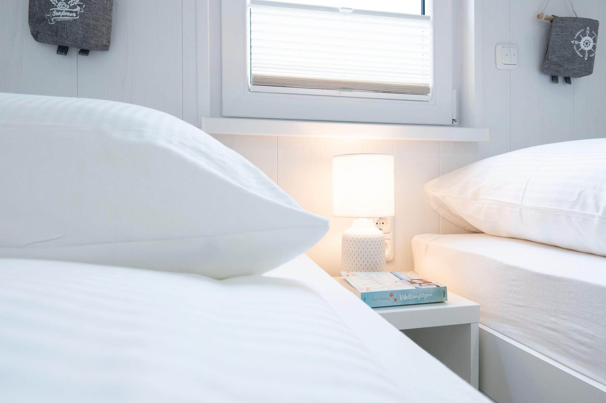 Unterteilt ist das Feriendomizil in ein Wohnzimmer mit Schlafsofa (Liegefläche 140x200 cm) und Smart TV, eine offene, gut ausgestattete Küche, 2 Schlafzimmer, sowie ein tageslichthelles Badezimmer mit bodentiefer Dusche, Fön und Handtuchheizung. Das erste Schlafzimmer ist mit komfortablem Boxspringbett (160x200 cm), Kleiderschrank, und Smart TV ausgestattet. Bei Bedarf ist auch Platz um ein Kinderreisebett aufzustellen. Das zweite Schlafzimmer umfasst 2 Einzelbetten (je 80 x 190 cm) und einen Kleiderschrank. Plissees und Außenrollos sorgen in allen Schlafräumen, sowie im Wohnzimmer für angenehme Verdunklung. Der eingezäunte Garten bietet mit möblierter Terrasse viel Raum zum Entspannen. Auch ein Grill ist vorhanden, genießen Sie gesellige Barbecue Abende oder entspannen bei einem stilvollen Sundowner und lauschen den Ostseewellen.
