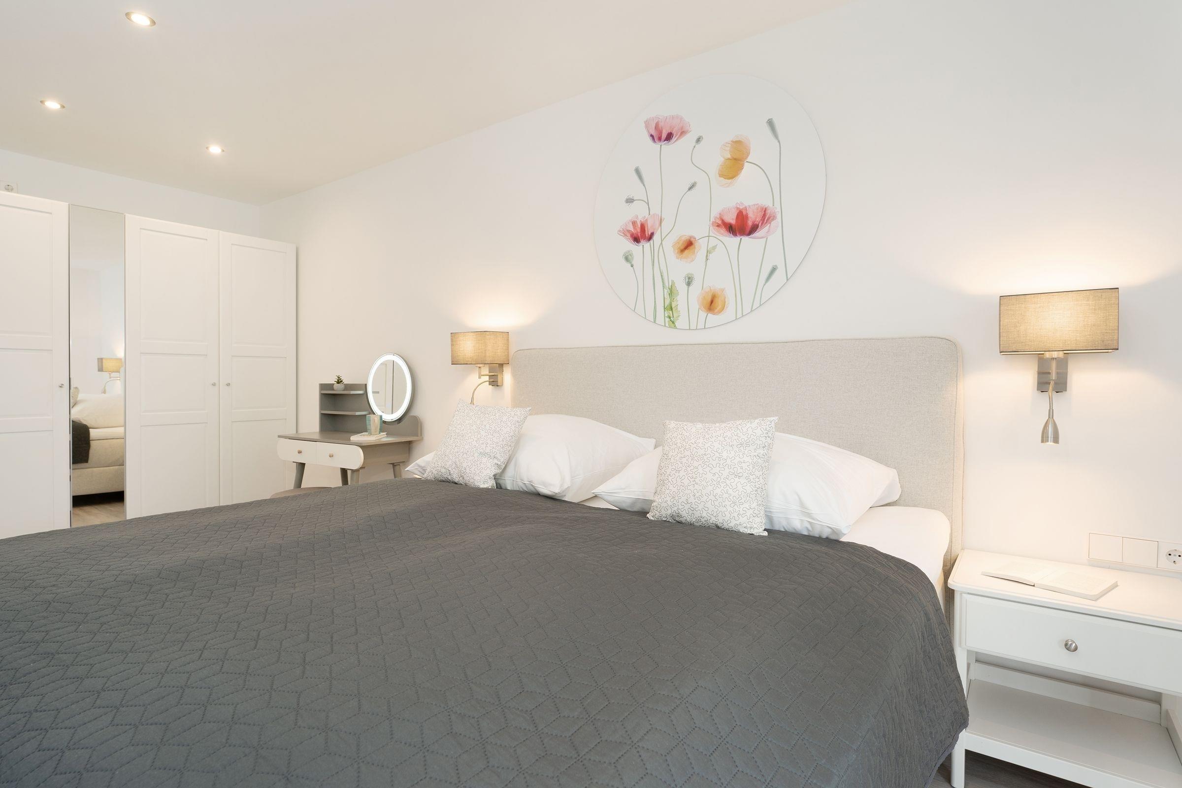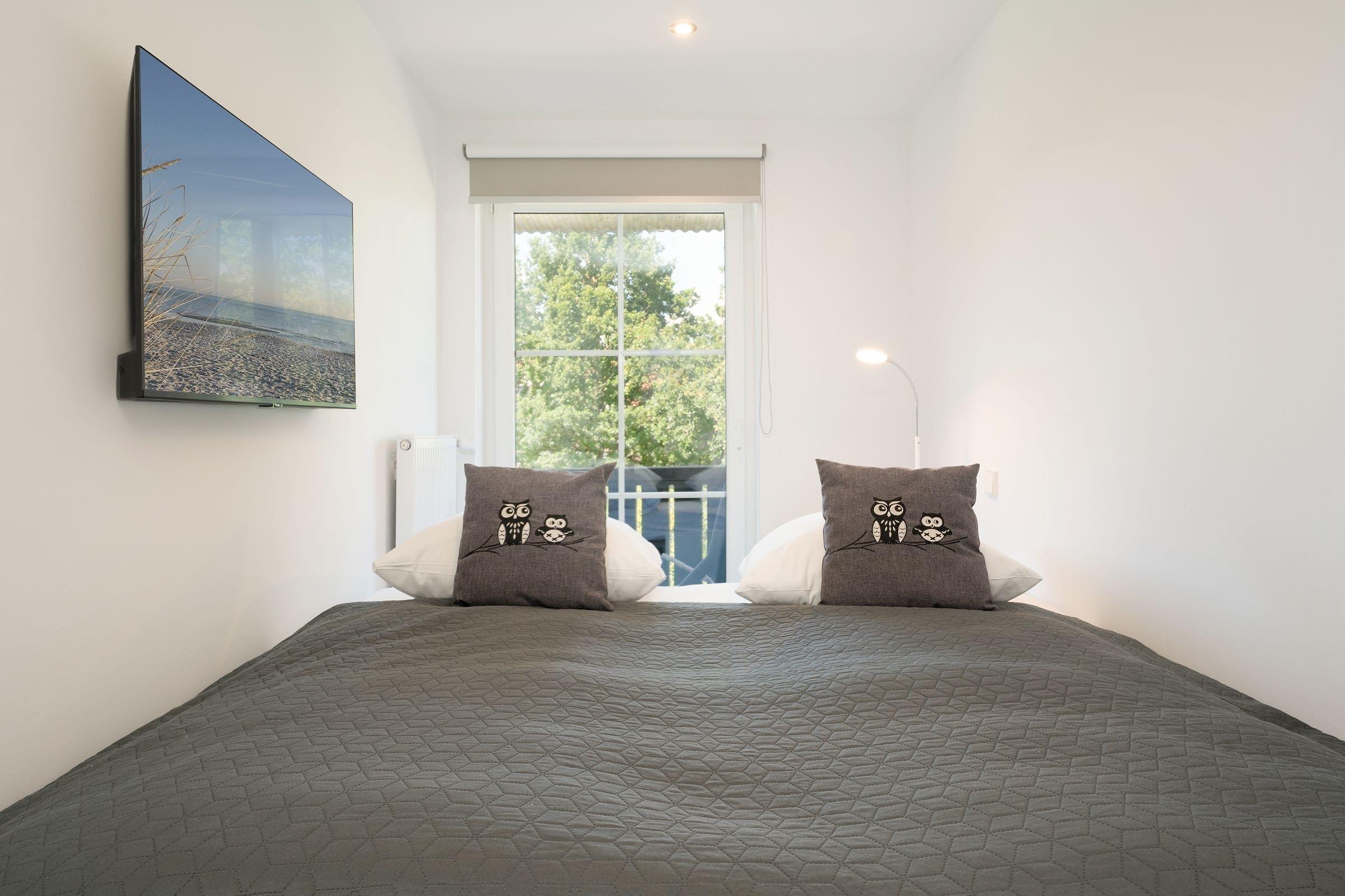 Schlafzimmer 1: 1 Doppelbett (180x200 cm), TV, Kleiderschrank, Verdunkelungsmöglichkeit: Rollo, Platz für Babybett vorhanden