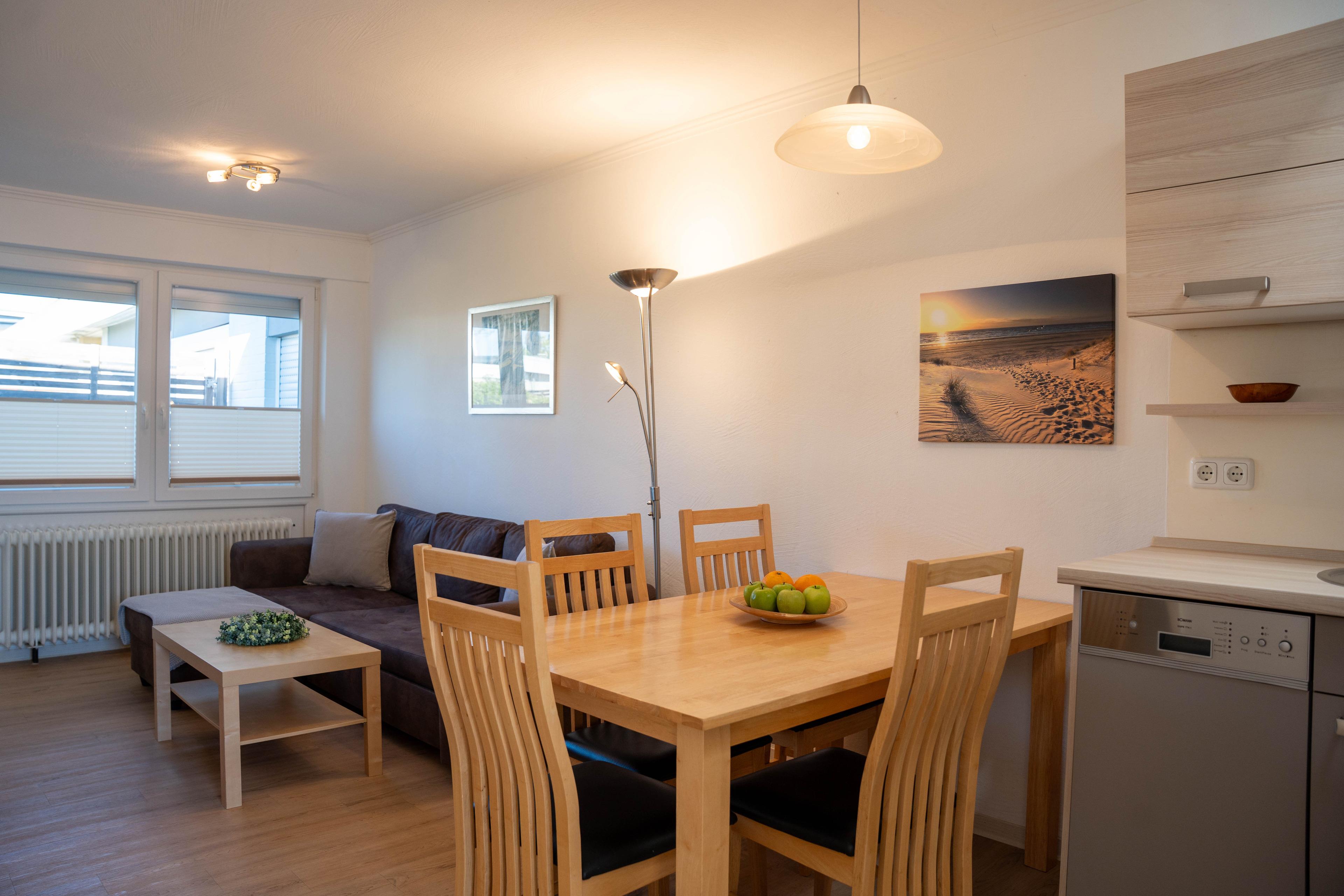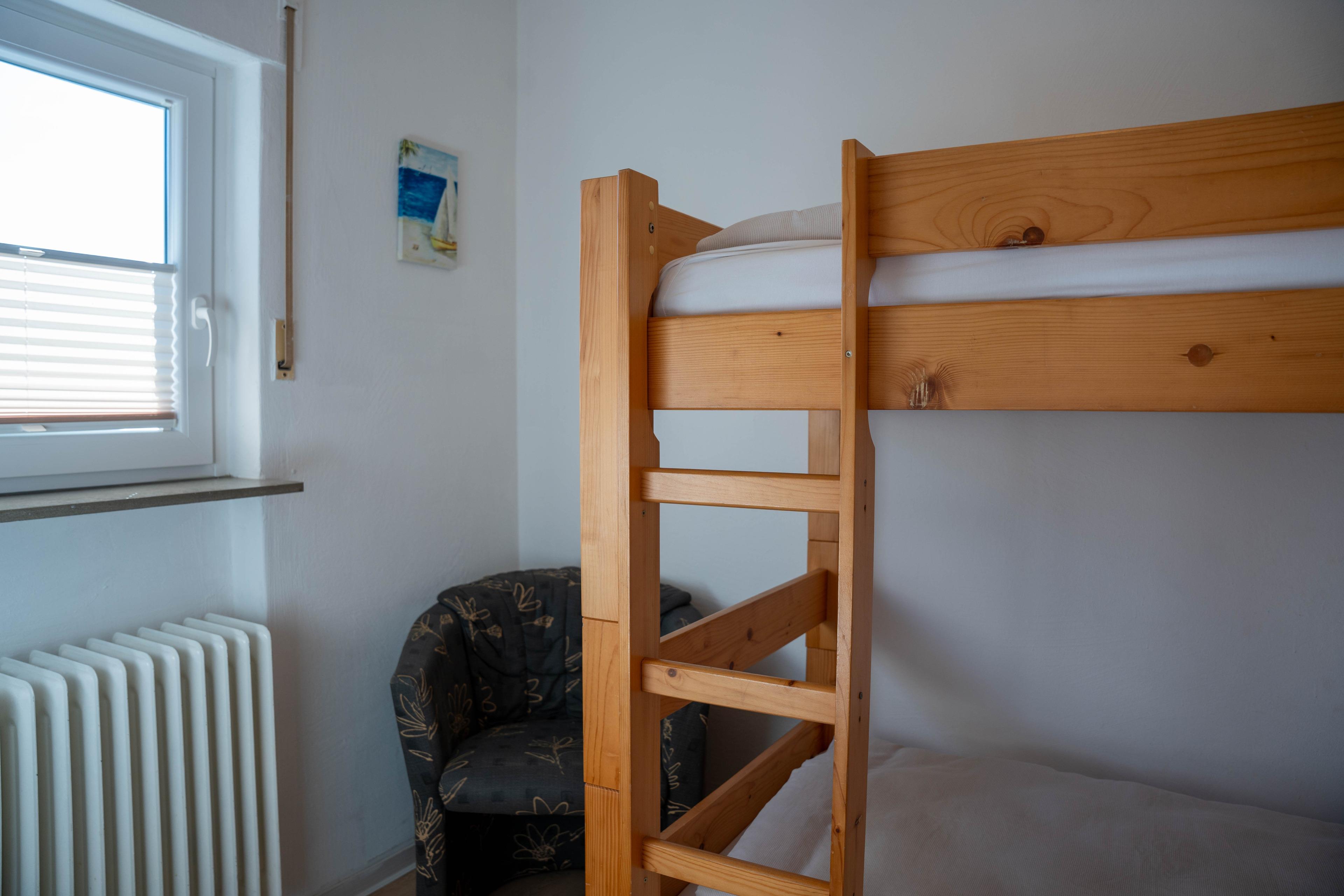 Der Bungalow verfügt über ein Schlafzimmer mit einem Doppelbett (180 x 190 cm) sowie einen separaten Schlafraum mit einem Etagenbett (90 x 190 cm). Die offene Küchenzeile ist mit einem Geschirrspüler ausgestattet. Im Wohnbereich können Sie auf der Couch entspannen. .Die Einrichtung ist funktional, und es gibt eine Sitzecke für bis zu vier Personen, perfekt für gemeinsame Mahlzeiten oder entspannte Abende. Im Außenbereich gibt es eine kleine Terrasse, die ab Juli 2025 eingezäunt sein wird, sodass auch Hunde dort sicher entspannen können.