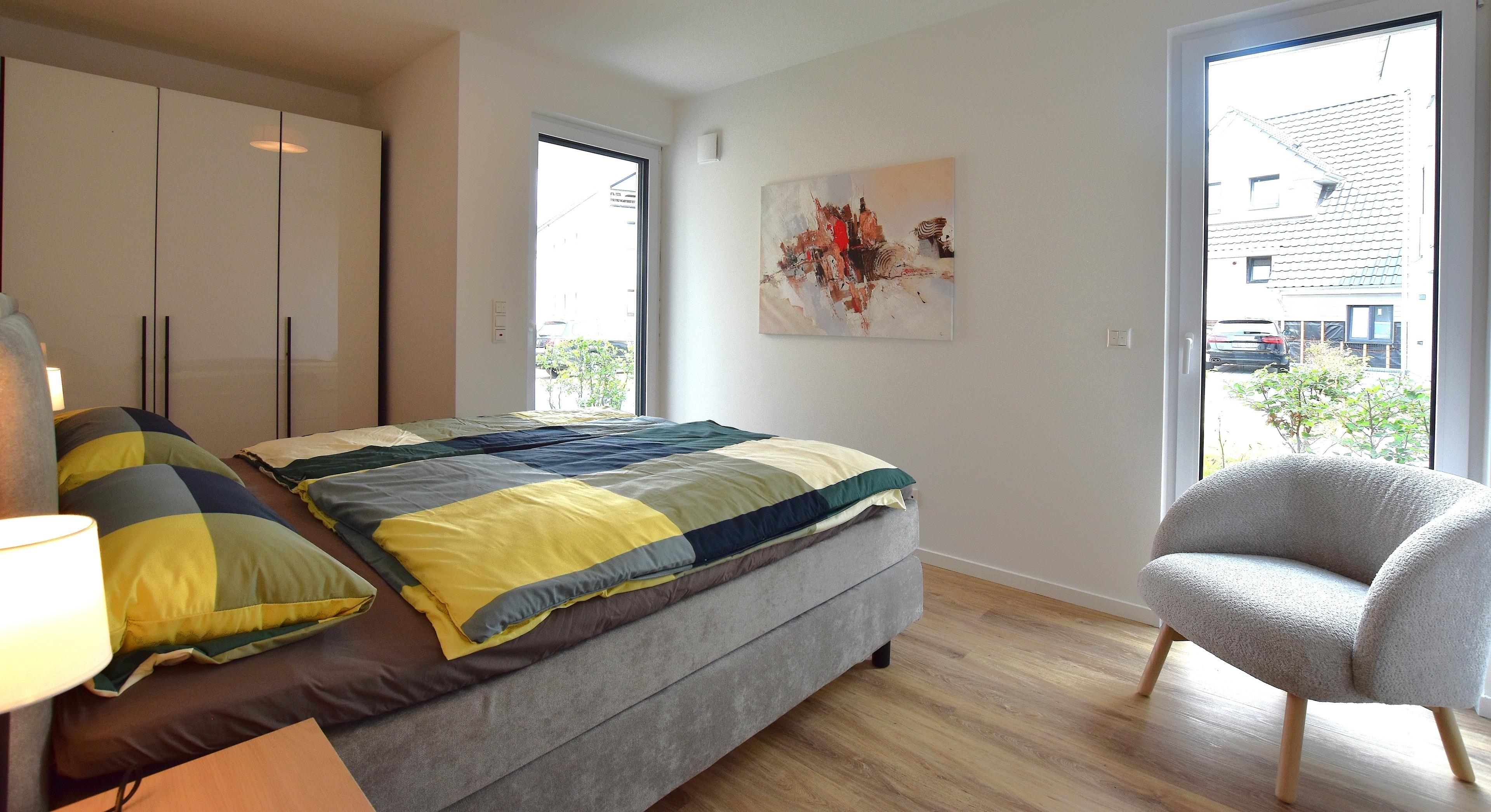 • Schlafzimmer 1: Das gemütliche Schlafzimmer verfügt über ein Doppelbett mit einer Einzelmatratzen (190 x 200 cm), zwei Nachttische mit Nachttischlampen, einen geräumigen Kleiderschrank sowie Außenrollläden für erholsamen Schlaf.