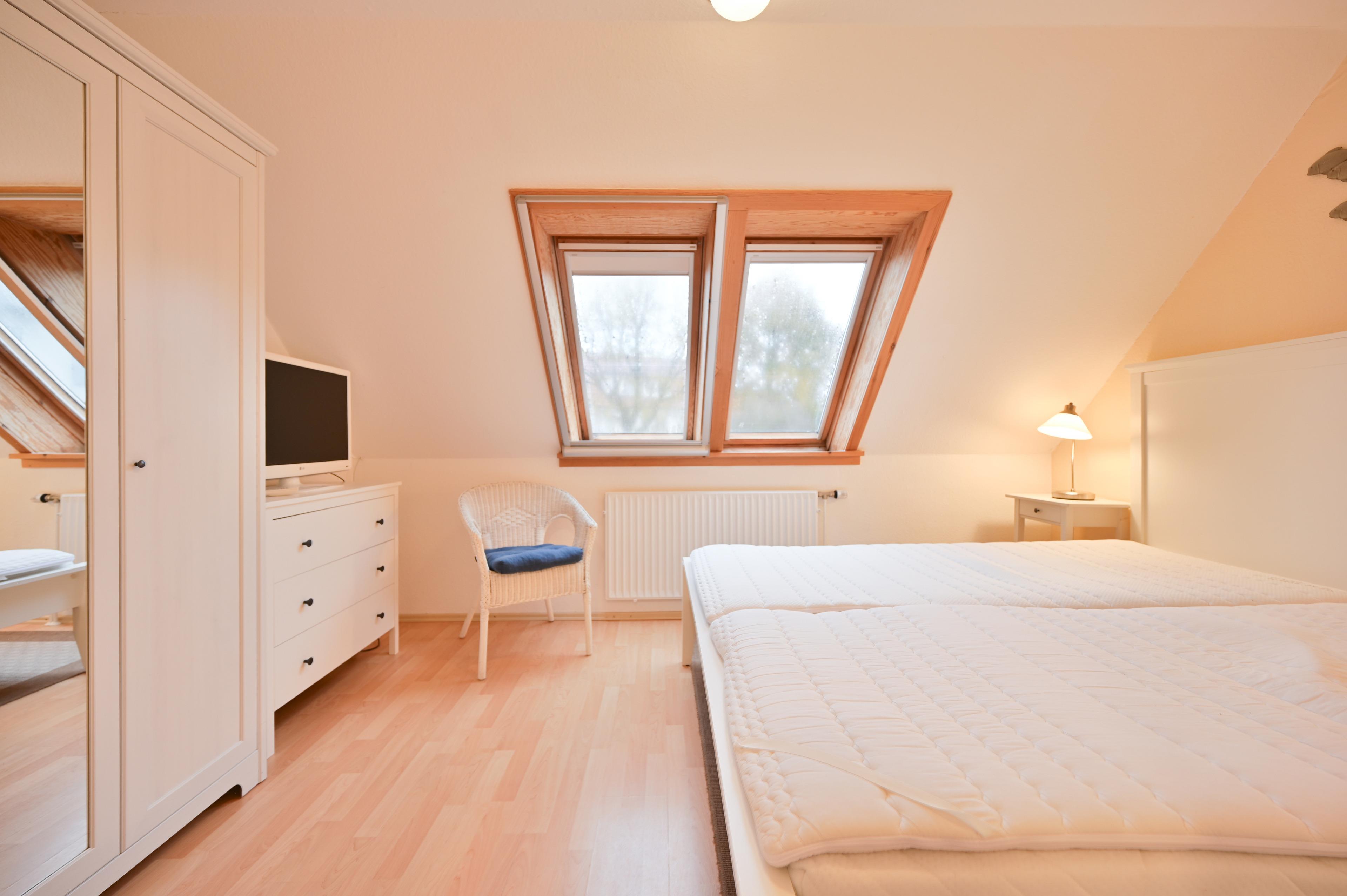 - ein Schlafzimmer mit Doppelbett, Kleiderschrank und Sat-TV,