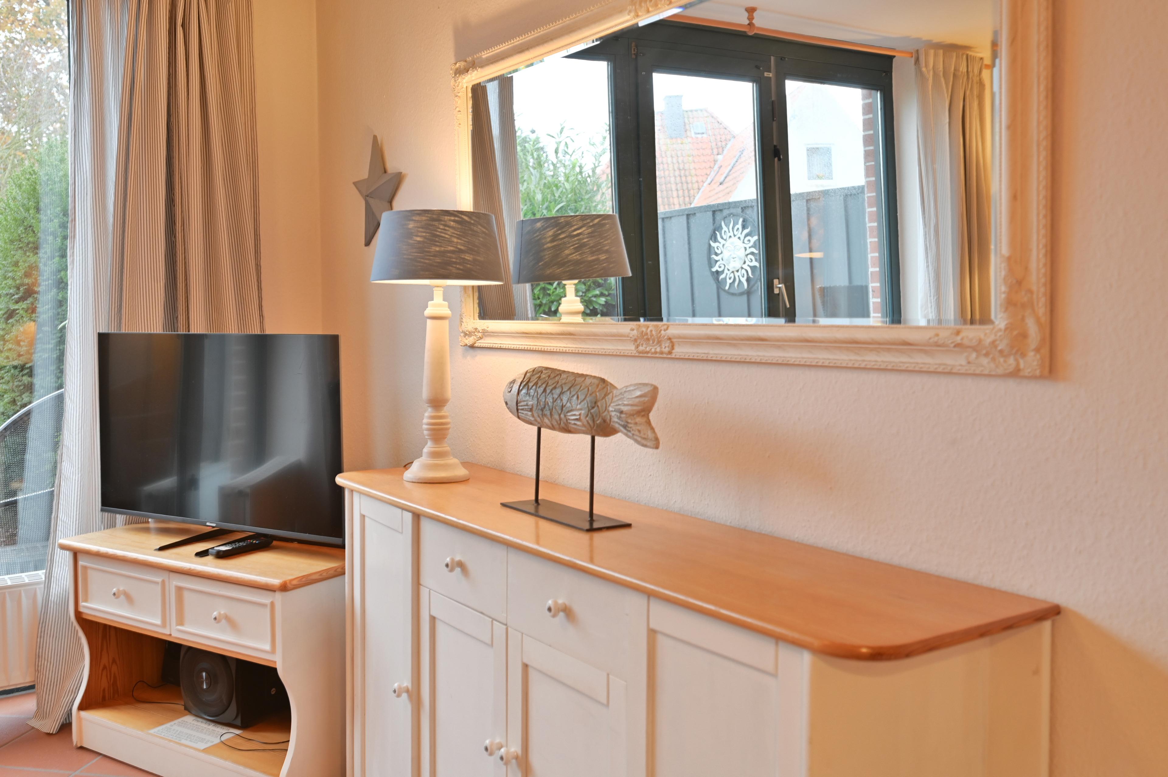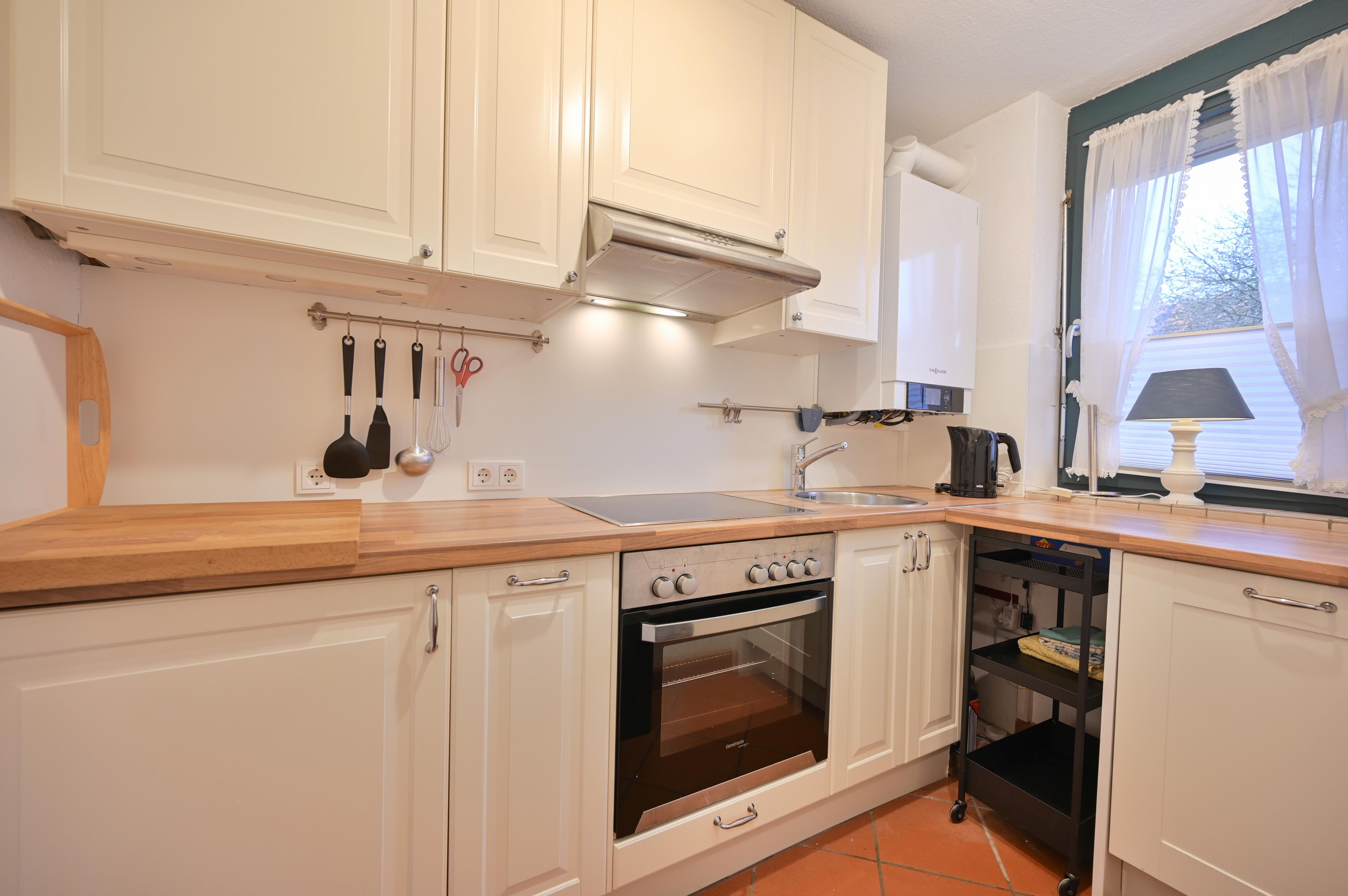 Im Erdgeschoss erwartet Sie ein wohnliches Wohnzimmer mit komfortablem Sofabereich und Smart-TV. Der angrenzende Essbereich mit Sitzgelegenheit für bis zu fünf Personen lädt zu gemeinsamen Mahlzeiten und Spieleabenden ein. Die kleine, gut ausgestattete Küche bietet alles, was Sie für Ihren Urlaub benötigen - vom Frühstück bis zum Abendessen. Ein separates Duschbad mit WC ergänzt das Erdgeschoss.