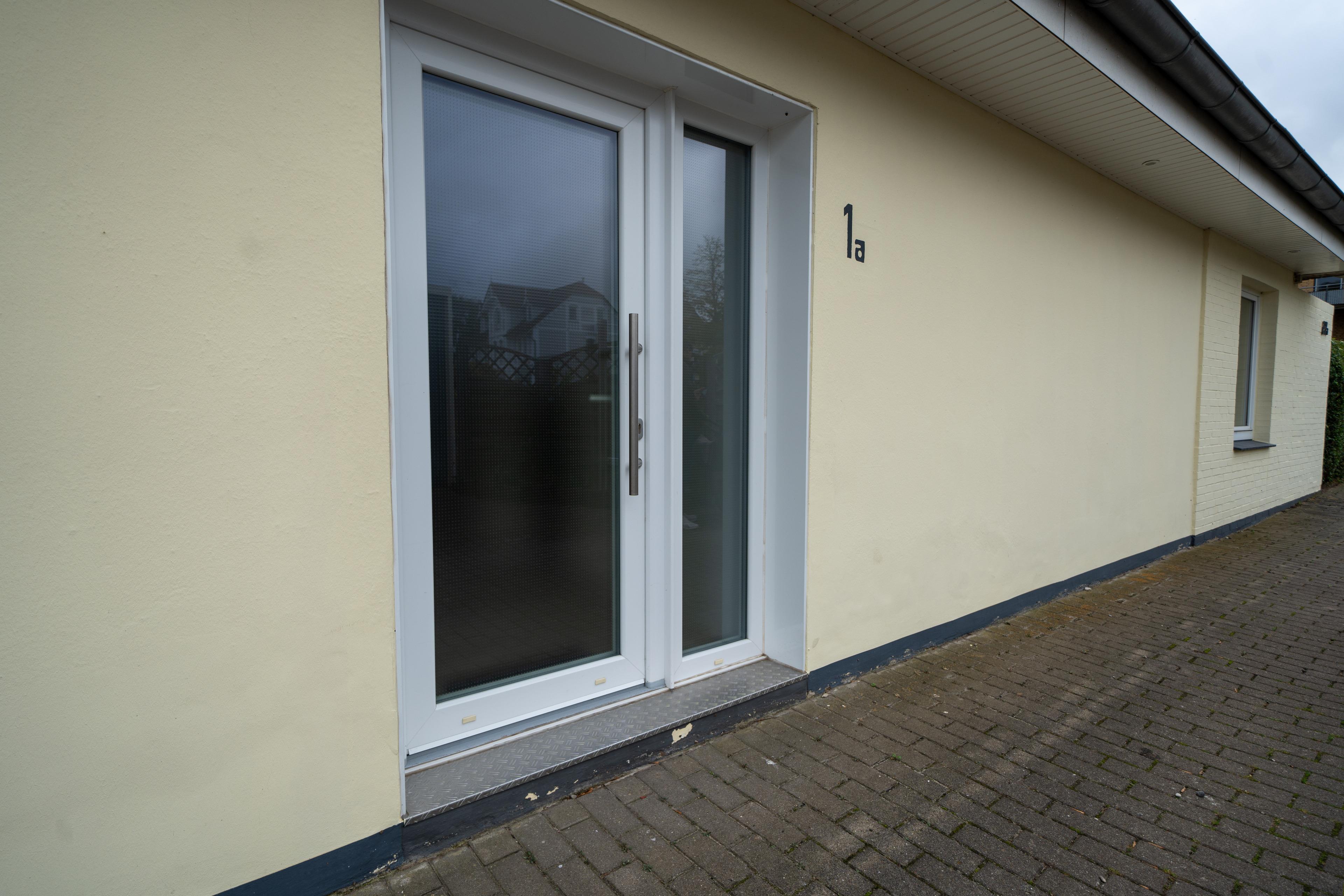 Die an den Wohnbereich angrenzende Terrasse ist mit Gartentisch, Bestuhlung und Sonnenschirm ausgestattet.