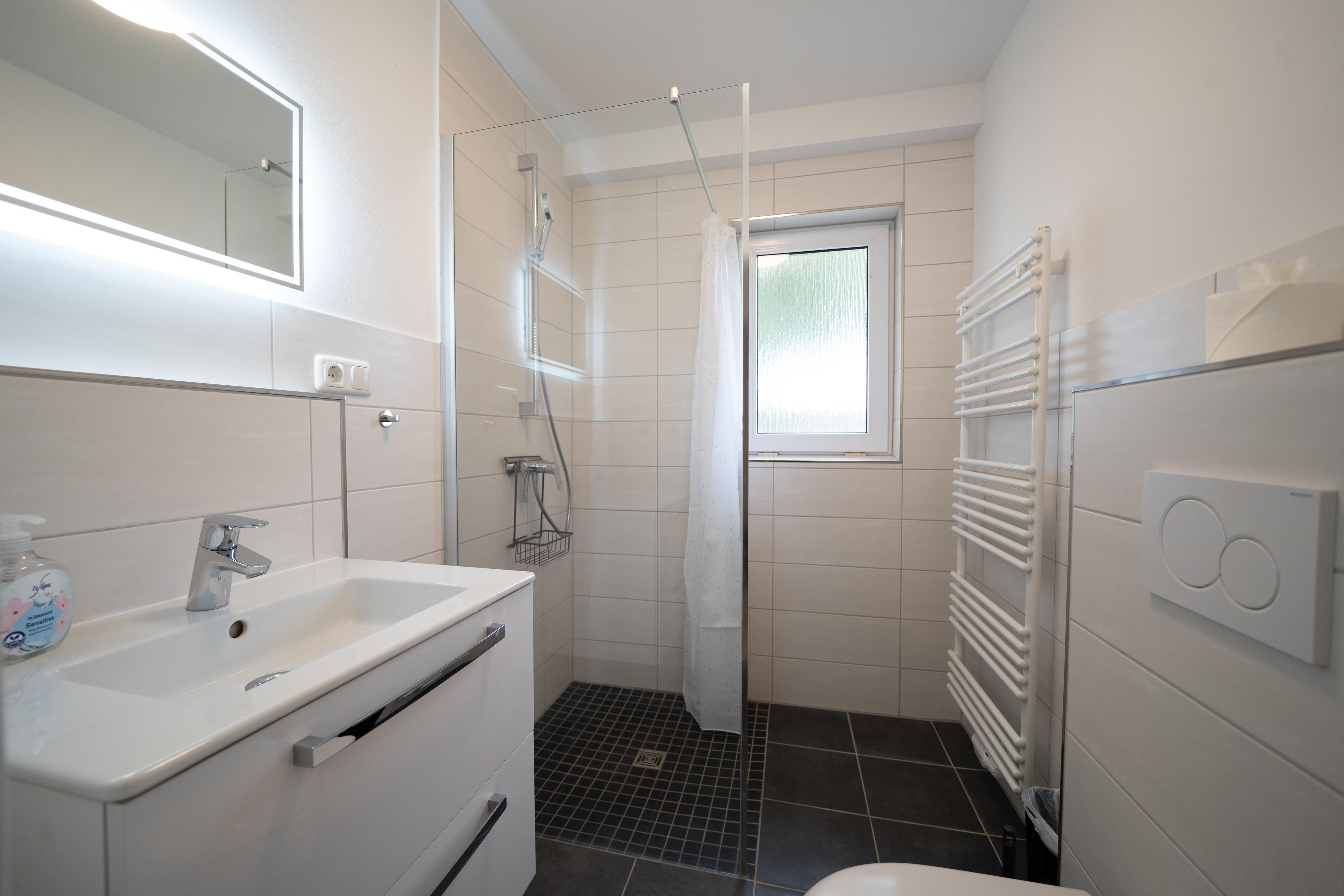 Das Badezimmer ist mit ebenerdiger Dusche und WC ausgestattet.