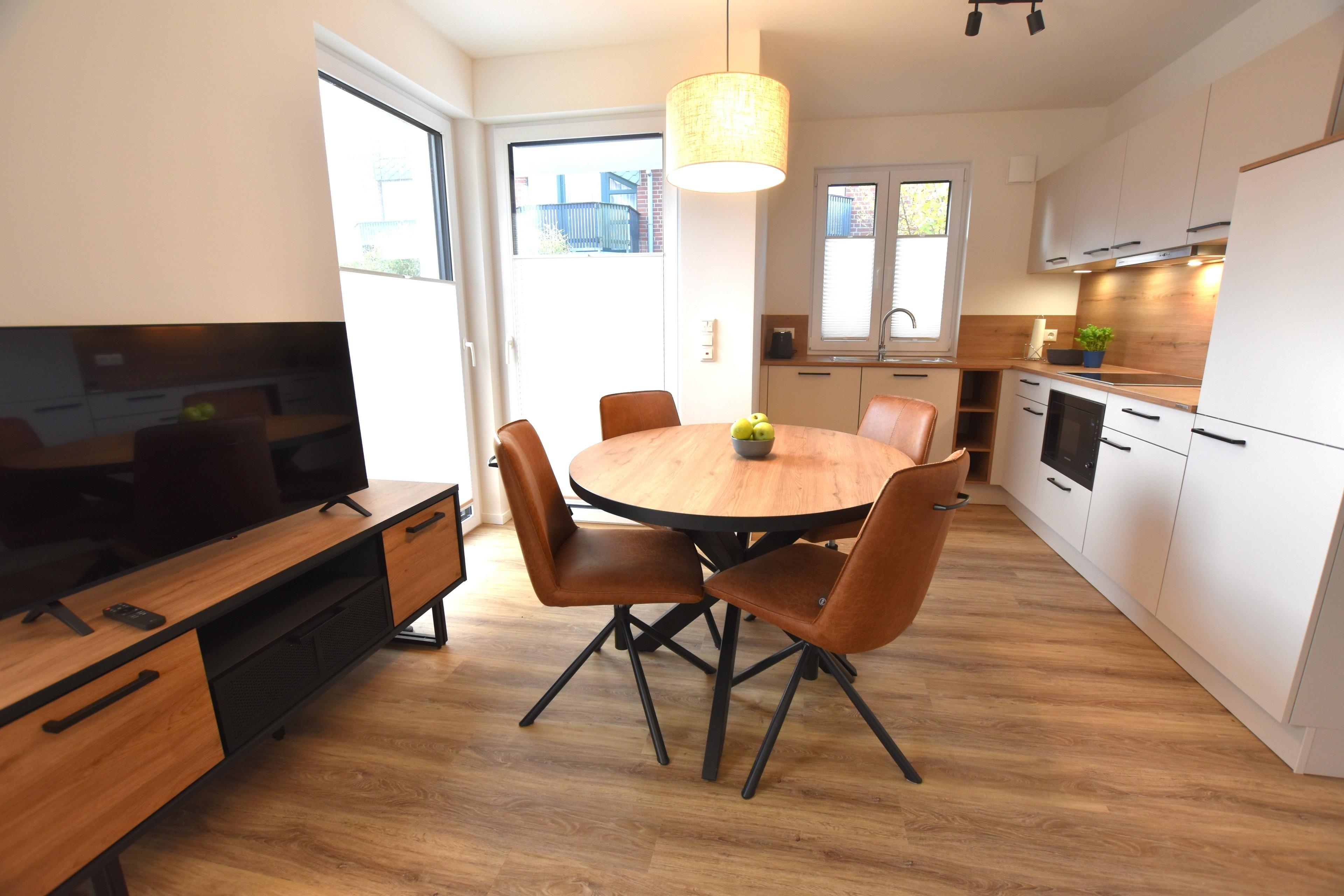 • Wohn- und Essbereich: Der offene Wohnbereich bietet einen Essplatz mit vier bequemen Stühlen sowie eine voll ausgestattete Einbauküche mit Mikrowelle mit Grillfunktion, Geschirrspüler, Kaffeemaschine und Kapselmaschine – natürlich mit allen wichtigen Küchenutensilien.