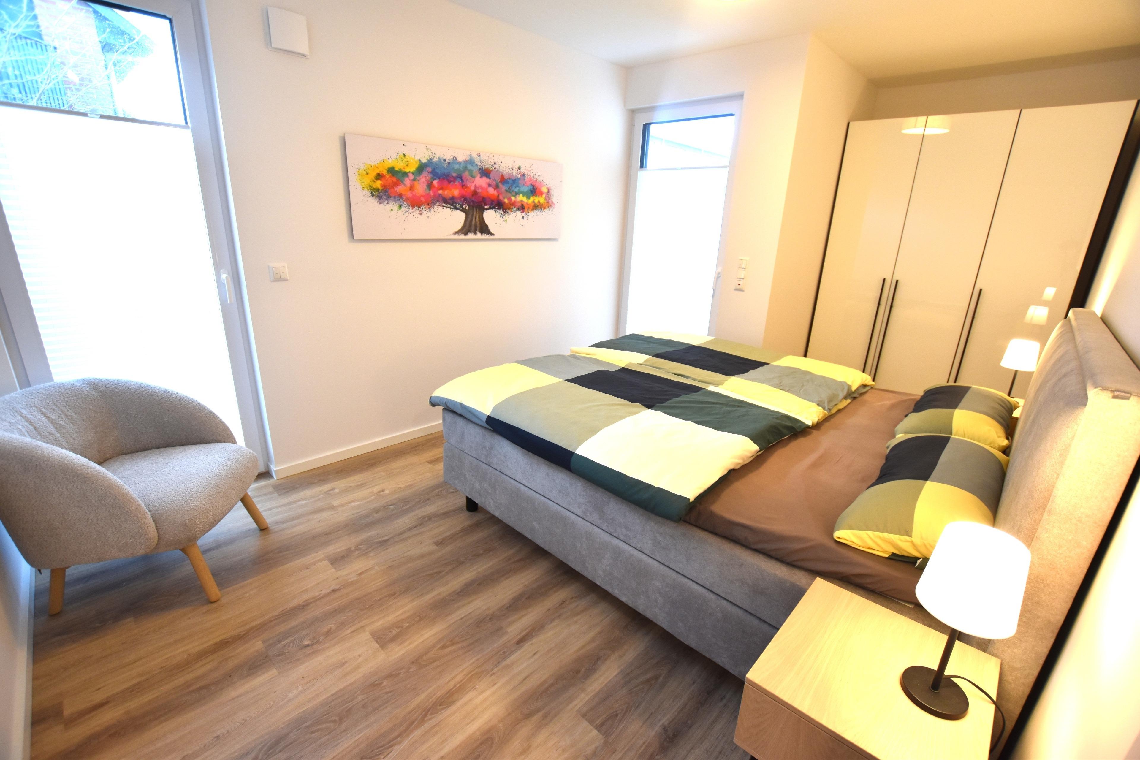 • Schlafzimmer 1: Das gemütliche Schlafzimmer verfügt über ein Doppelbett mit einer Einzelmatratzen (190 x 200 cm), zwei Nachttische mit Nachttischlampen, einen geräumigen Kleiderschrank sowie Außenrollläden für erholsamen Schlaf.