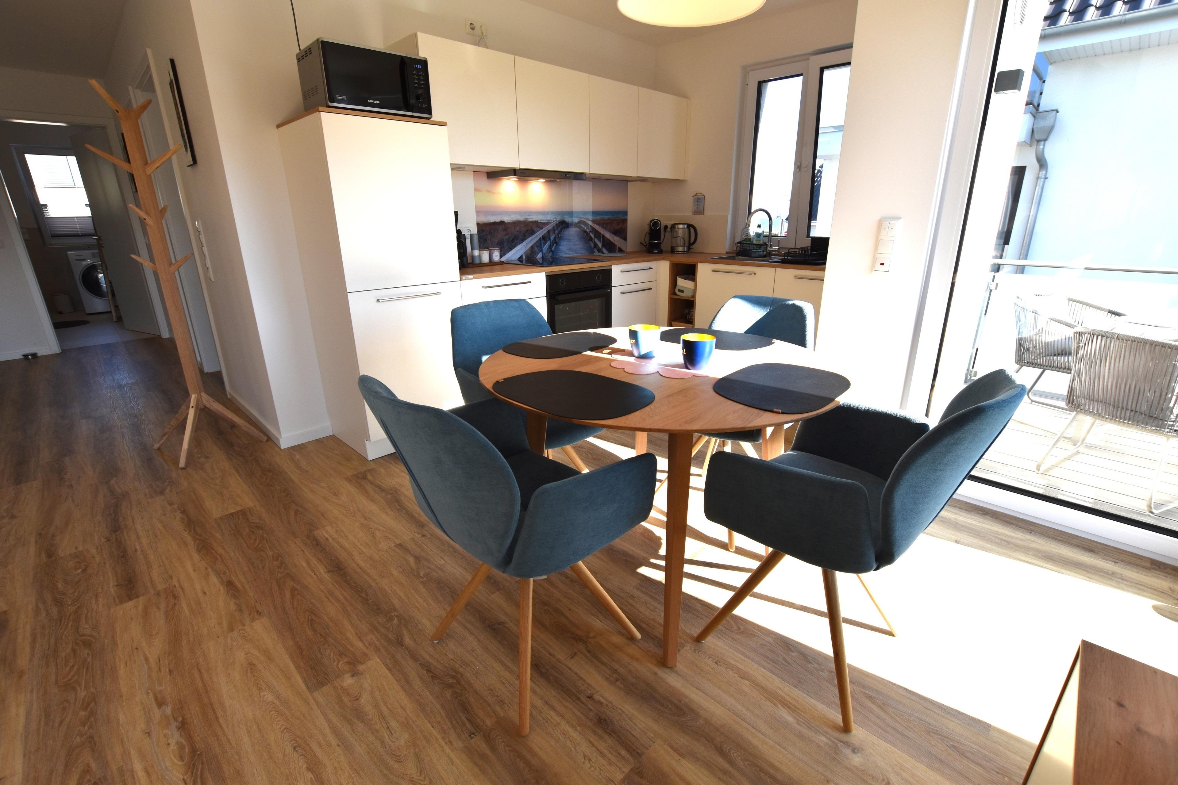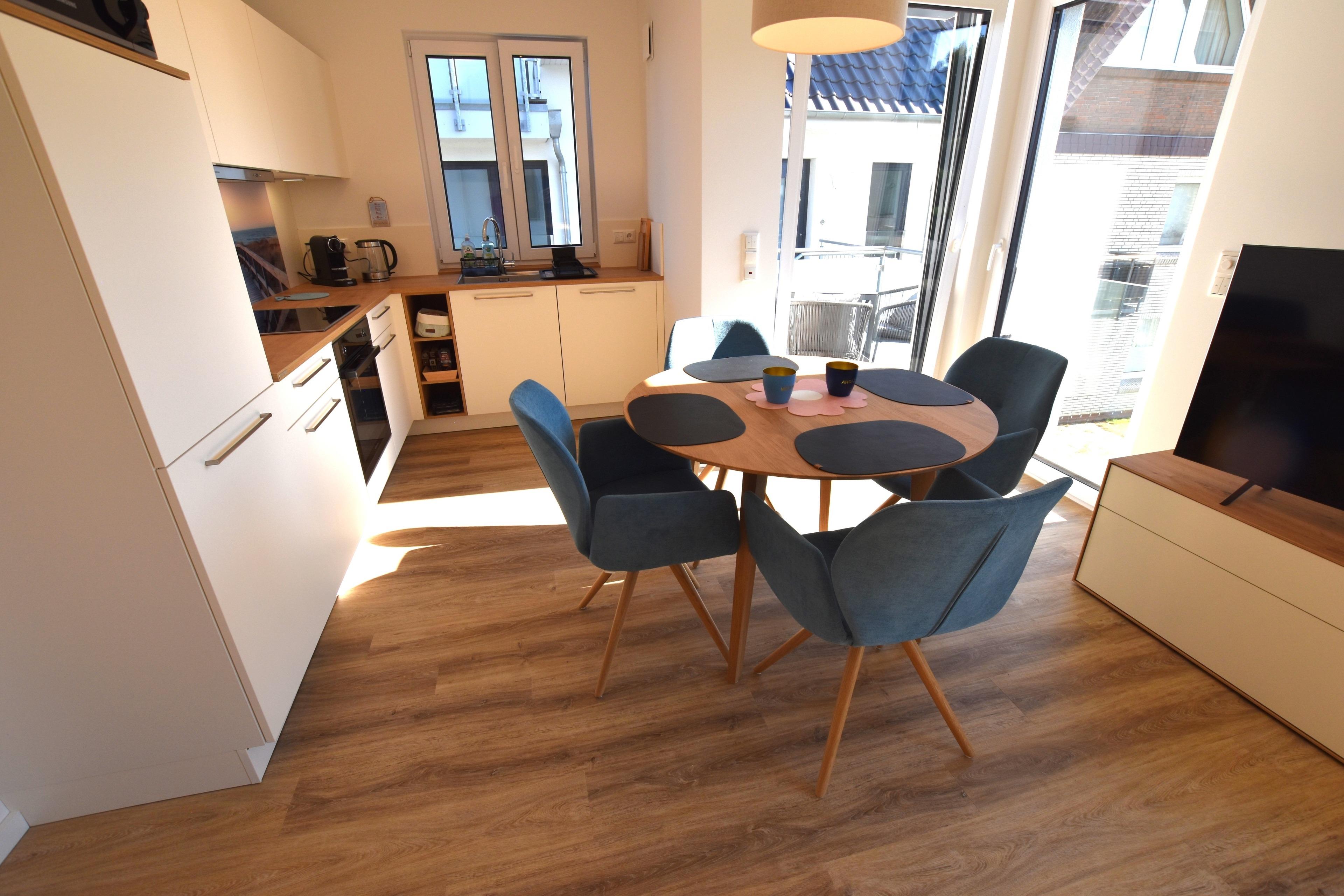 • Wohn- und Essbereich: Der offene Wohnbereich bietet einen Essplatz mit vier bequemen Stühlen sowie eine voll ausgestattete Einbauküche mit Mikrowelle, Backofen, Geschirrspüler, Kaffeemaschine und Kapselmaschine – natürlich mit allen wichtigen Küchenutensilien.