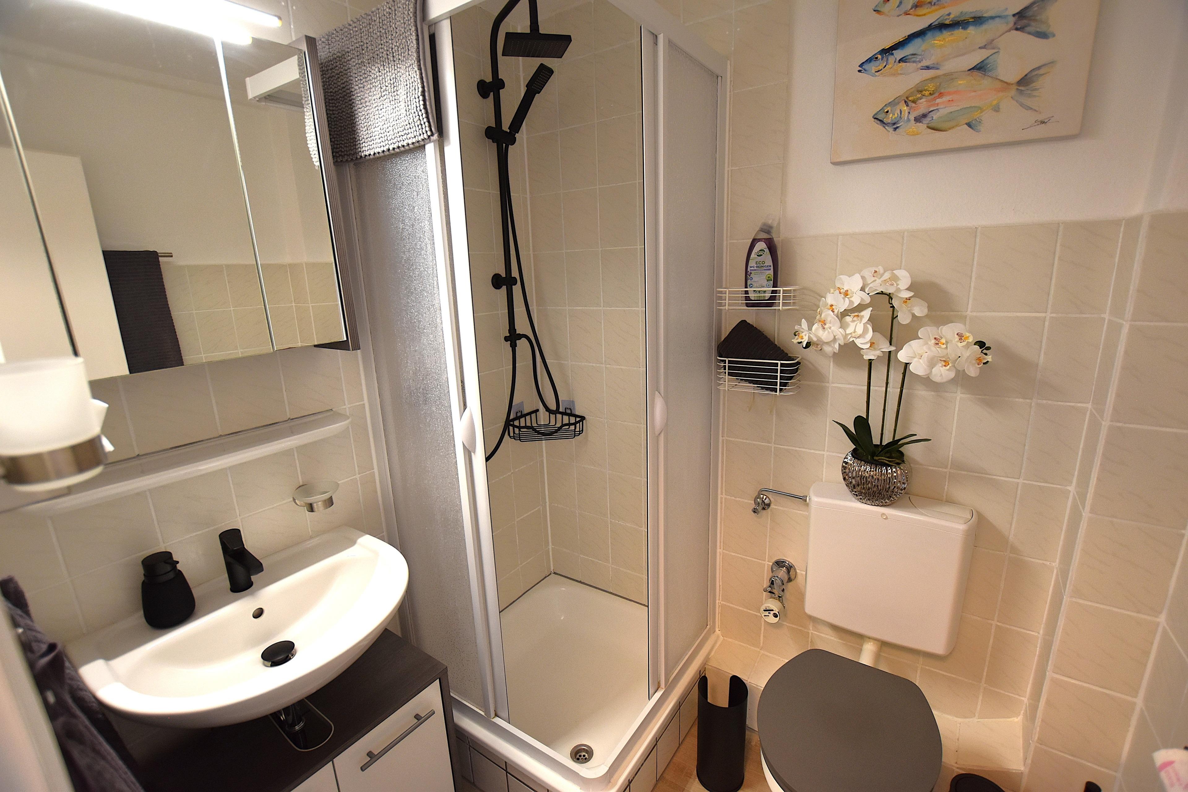 Auf der rechten Seite befindet sich das Duschbad mit Dusche, Spiegelschrank, Waschbecken und WC.