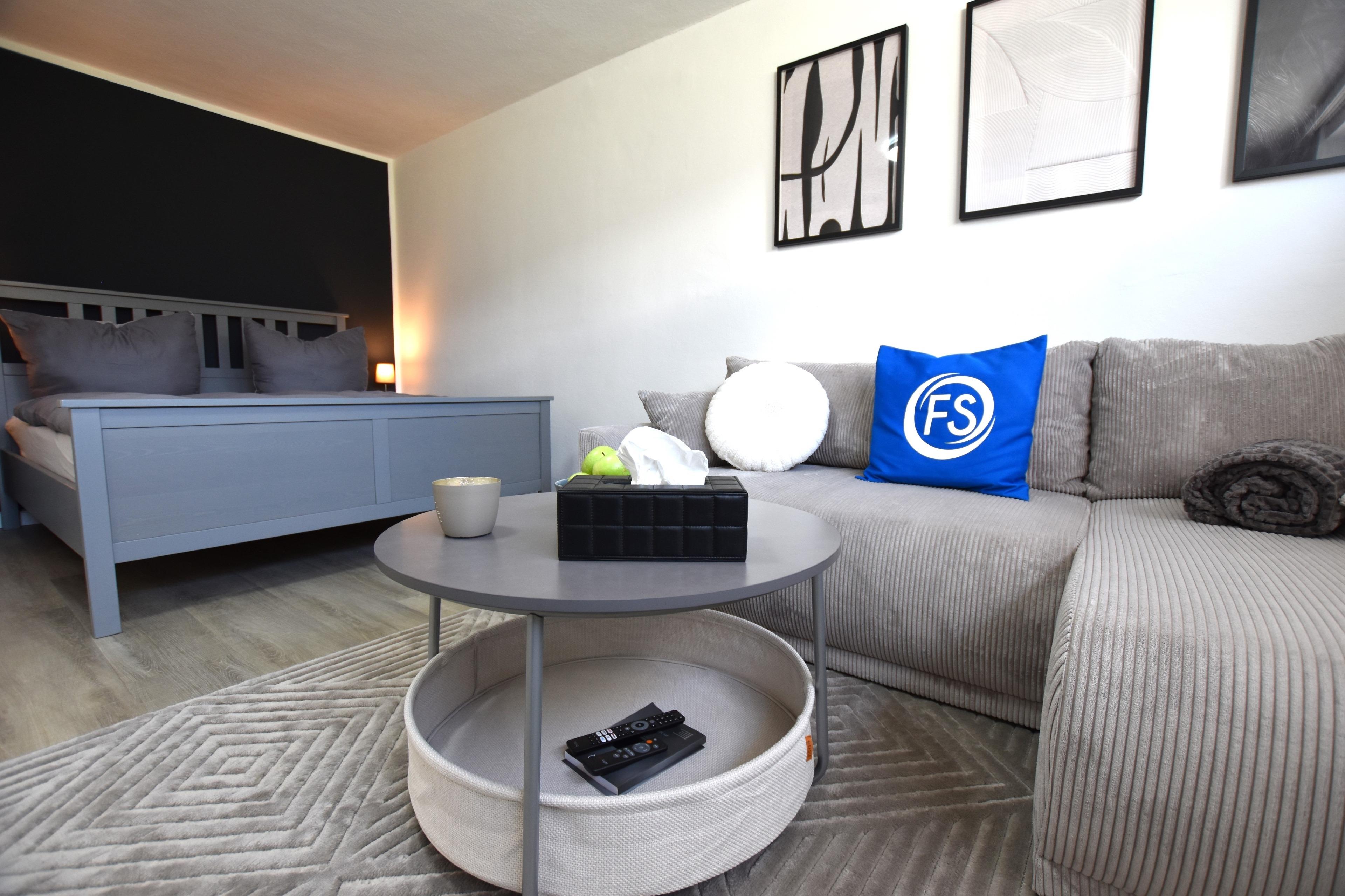 Vom Flur aus öffnet sich das helle Wohn- und Schlafzimmer, das geschmackvoll eingerichtet ist und zum Wohlfühlen einlädt. Hier finden Sie: