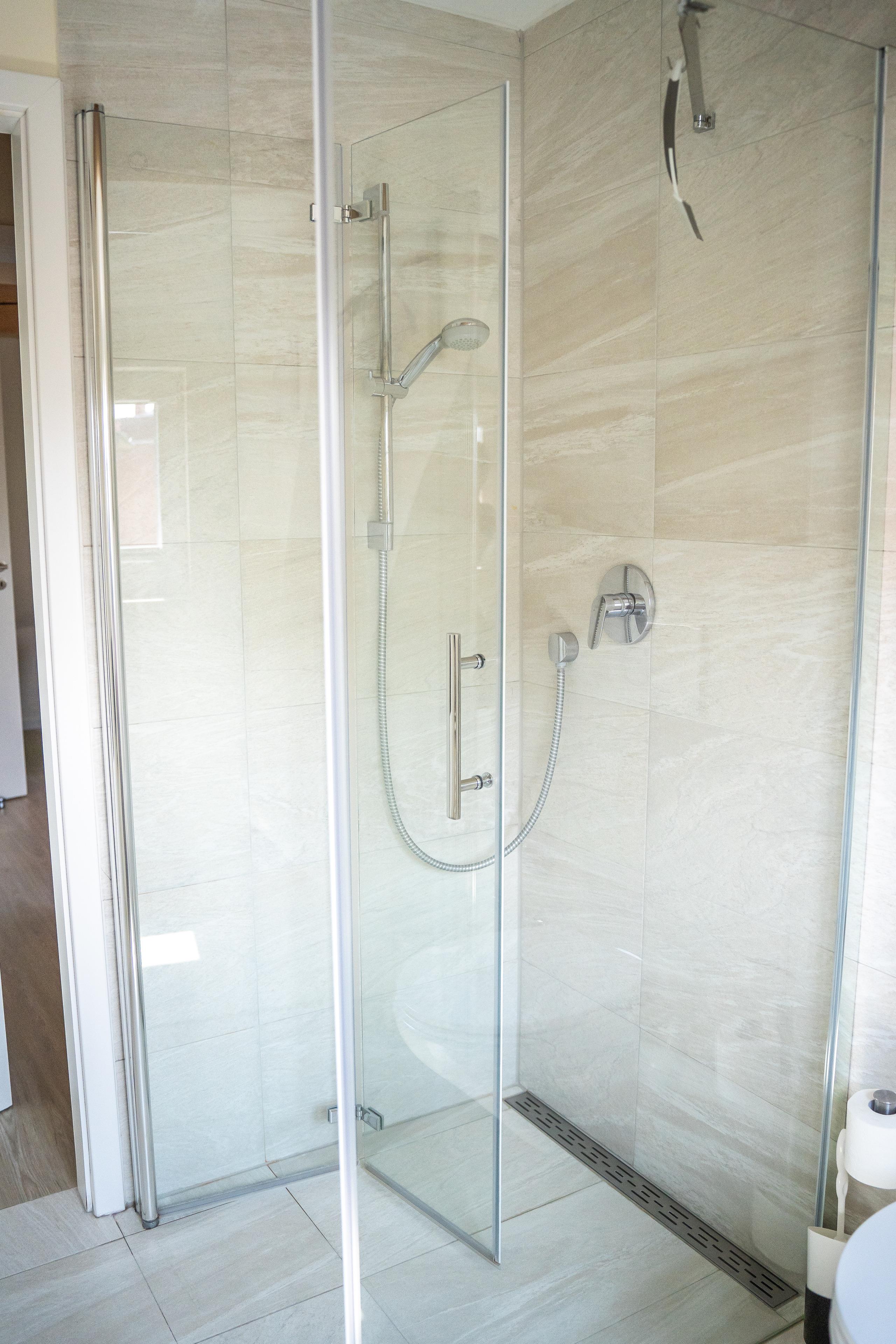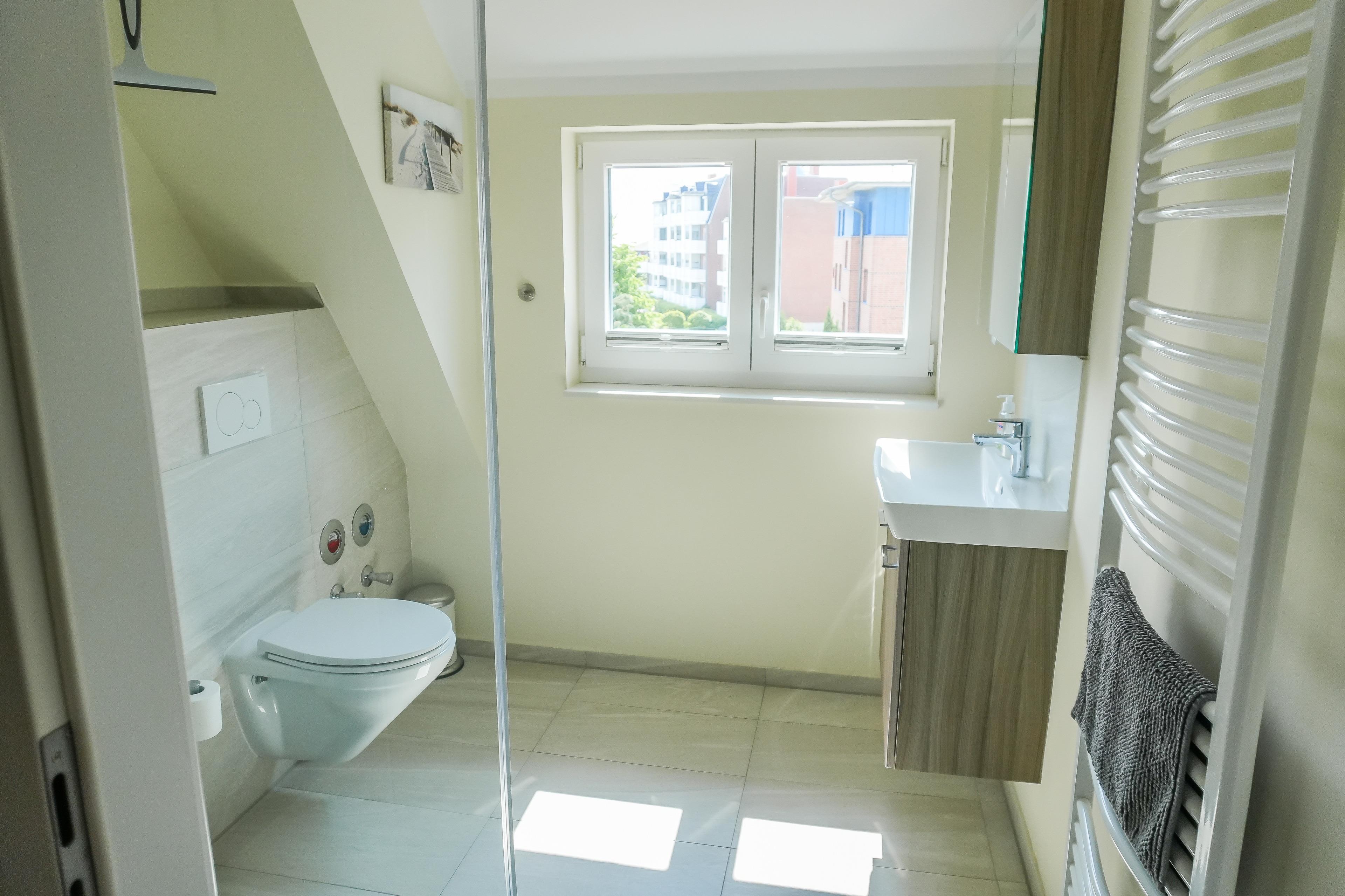 Das zweite Schlafzimmer (mit Meerblick) befindet sich im Dachgeschoss und ist mit 2 Einzelbetten (0,80x2,00 m) ausgestattet. Die Betten sind individuell verschiebbar . Die Schlafzimmerfensterverdunklung findet durch zwei Plissees statt. Vor dem großen Dachgeschossfenster steht ein Kicker und lädt zu einer Runde Spielspaß für jung und alt ein. Im neuen Bad befindet sich eine ebenerdige Dusche.