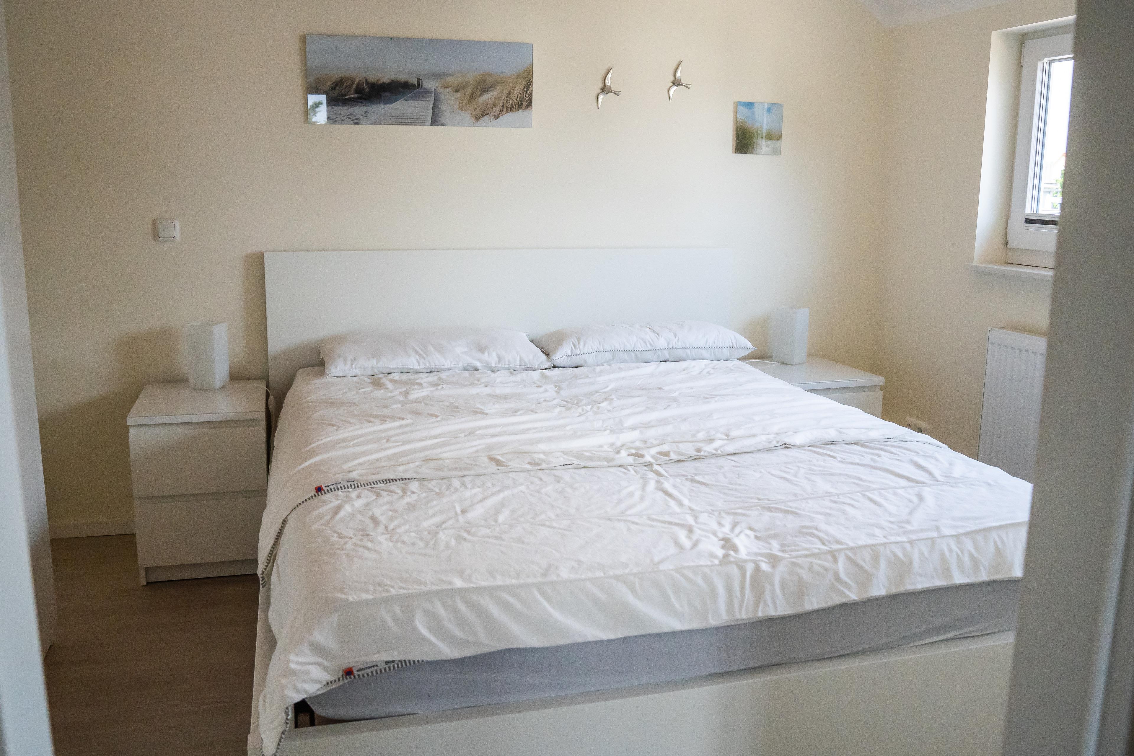 Das Schlafzimmer ist mit einem Doppelbett (1,80x2,00 m) und einem Kleiderschrank ausgestattet .