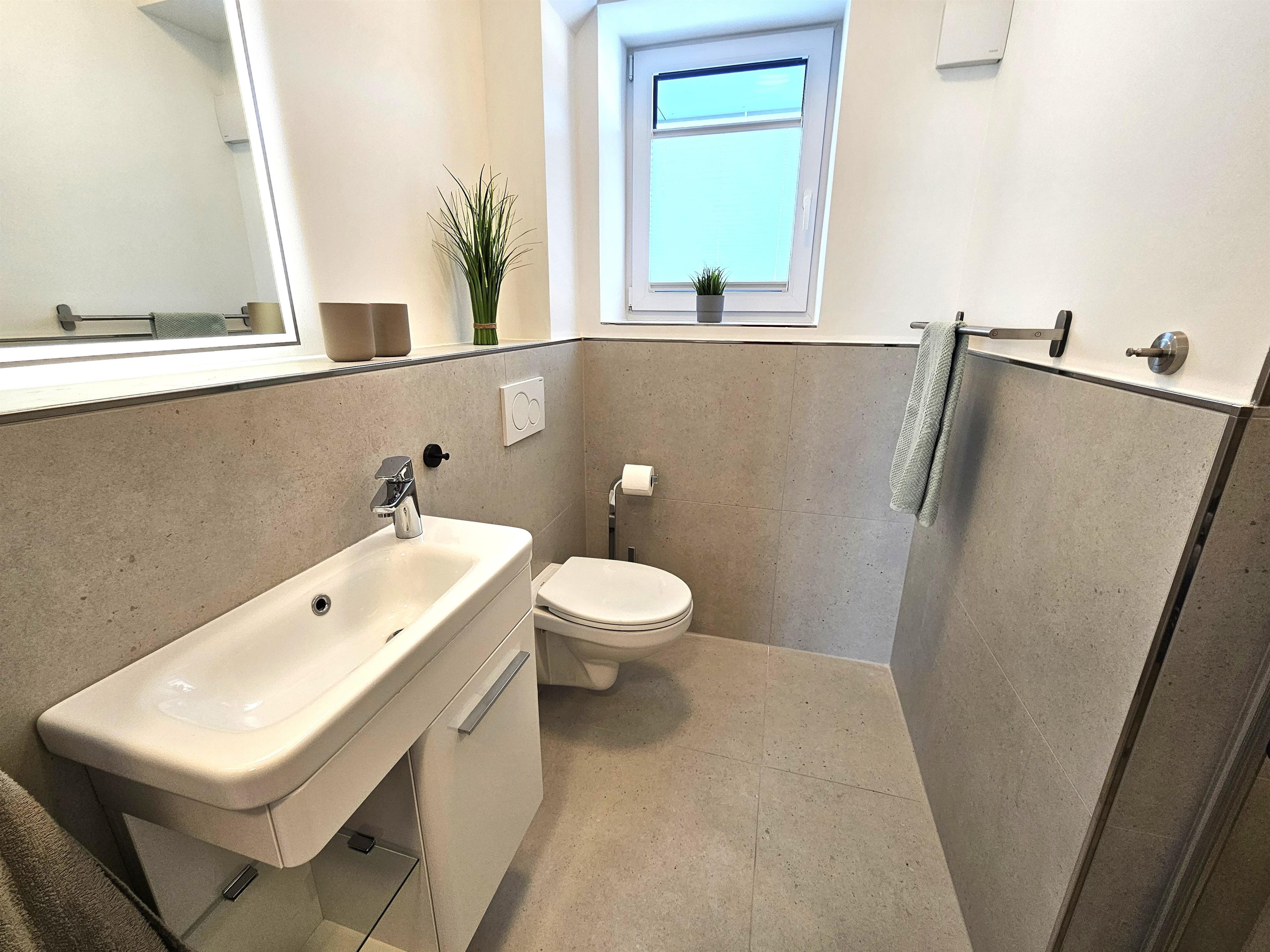 • Duschbad: ein Duschbad mit bodentiefer dusche, Waschbecken, Spiegel und Fenster.