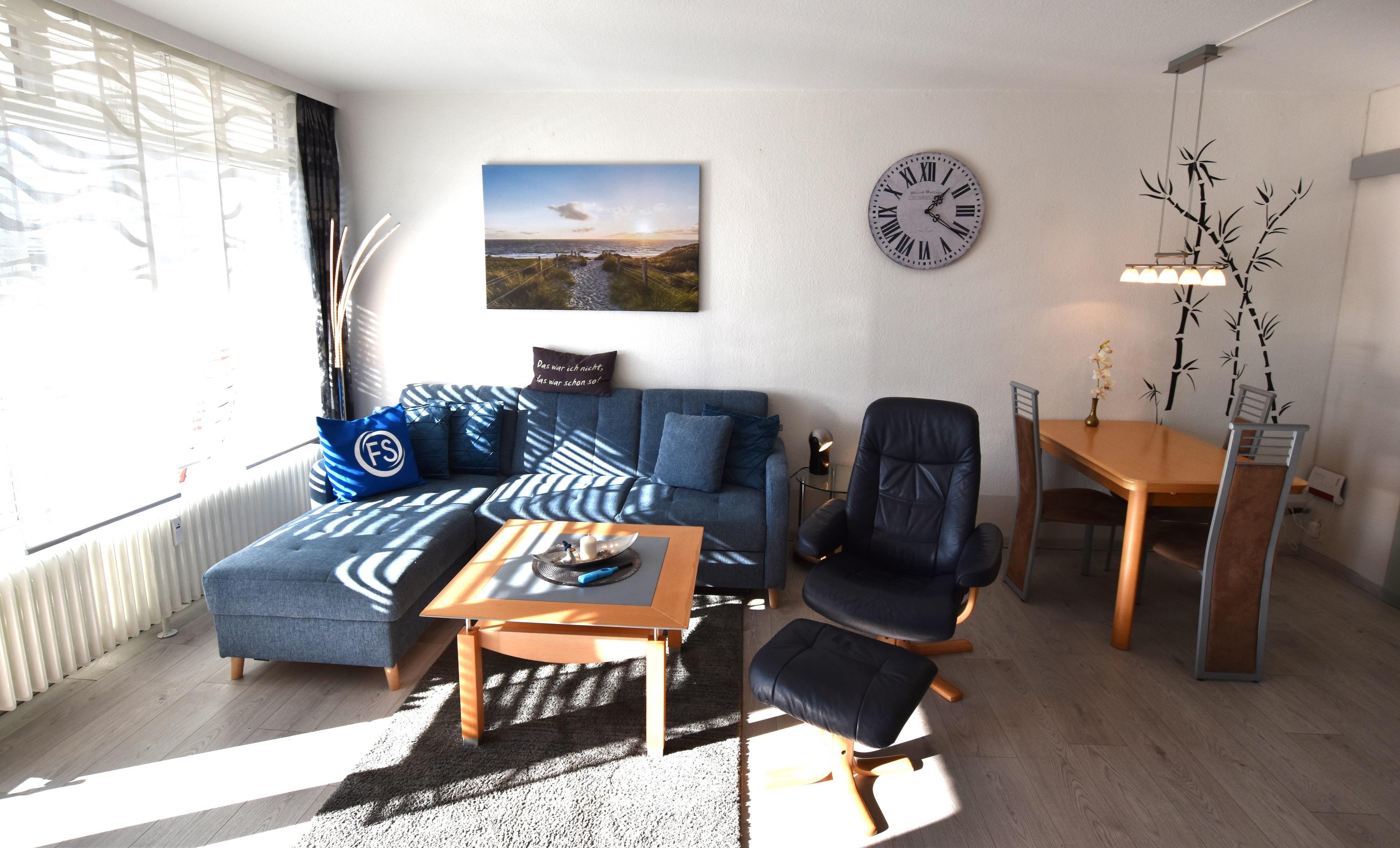 ein separates Schlafzimmer mit einem Doppelbett (1x160x200cm), einem Duschbad, Waschbecken und WC und einem großen Wohn/- Esszimmer mit neuer gut ausgestatter Küche, einer gemütlichen Schlafcouch (120x200cm), einem Esstisch mit Bestuhlung und großem LCD TV Gerät. Der an den Wohnbereich angrenzende Balkon ist mit Balkonmöbeln möbliert und befindet sich in südlicher Richtung.