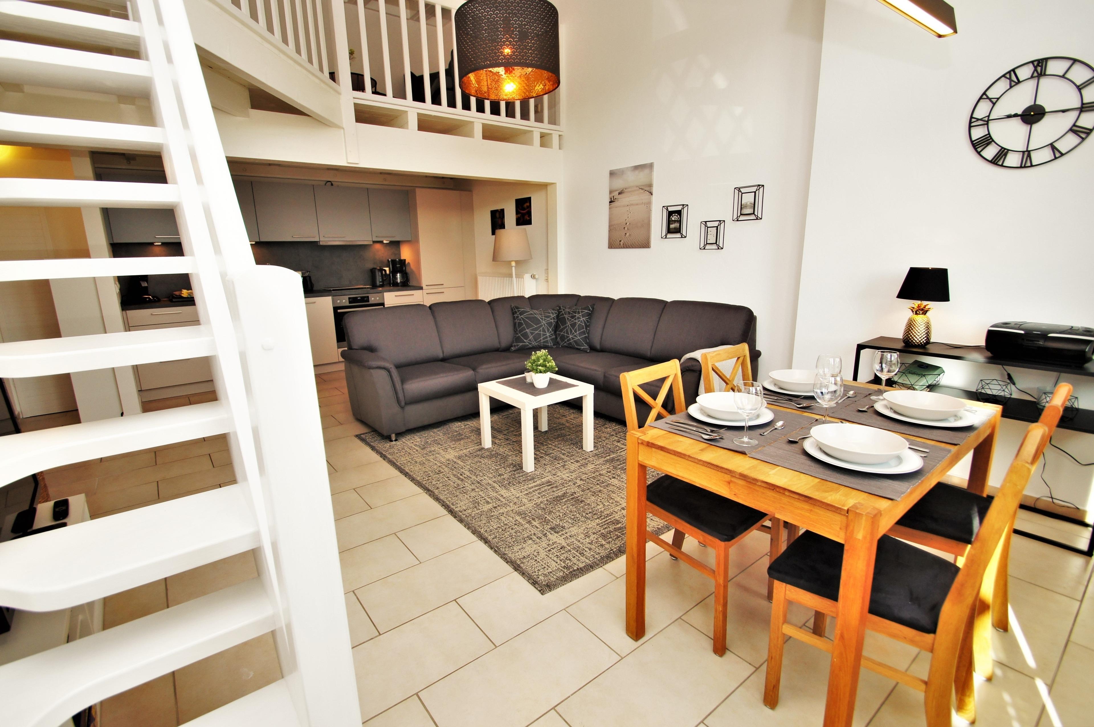 Moderne Ferienwohnung für 4 Personen, hell und freundlich eingerichtet mit Elternschlafzimmer, Schlafmöglichkeiten auf der 20 m² Galerie....2x LCD-TV, Terrasse...