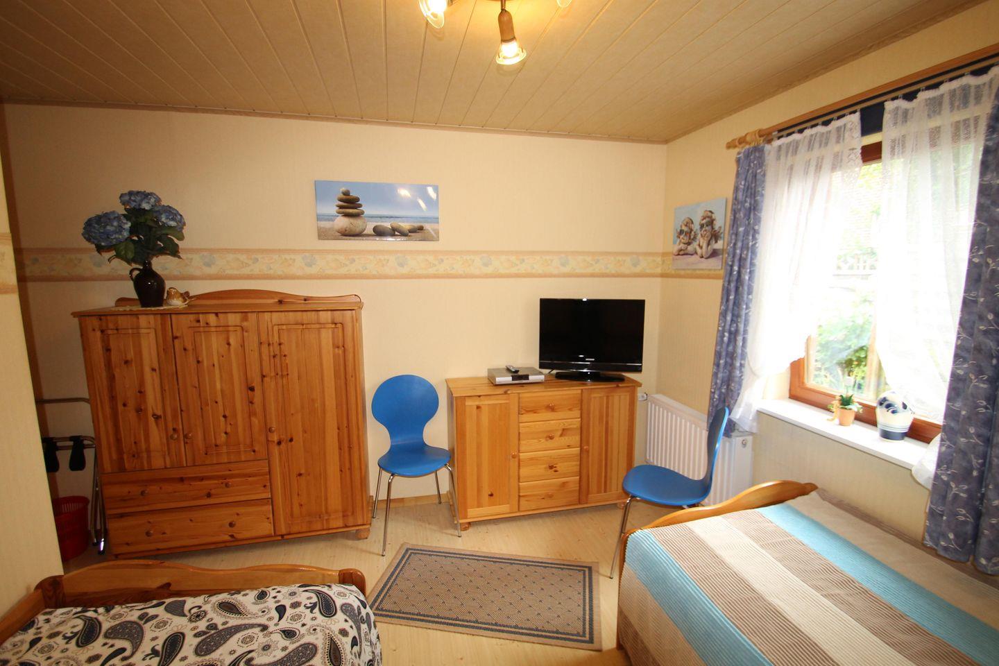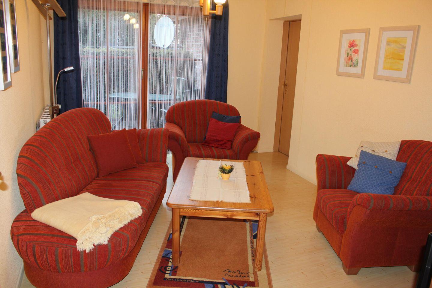Privat geführte großzügige drei Zimmer Ferienwohnung in ruhiger Lage für bis zu fünf Personen. Die Wohnung verfügt über zwei Schlafzimmer, ein Schlafzimmer mit Doppelbett und ein Schlafzimmer mit zwei Einzelbetten. Eine Waschmaschine gegen Gebühr steht Ihnen zur Nutzung selbstverständlich zur Verfügung. Ein festes Kindergitterbett befindet sich ebenfalls in der Wohnung. Im Wohnzimmer und im Kinderzimmer finden Sie je einen LCD-Fernseher. Küche und Tageslichtduschbad sind neu. Im Wohnzimmer ist der direkte Zugang zur möblierten Terrasse. Der PKW-Stellplatz befindet sich direkt vor dem Haus. Gemütliche Ferienwohnung, liebevoll vom Eigentümer eingerichtet und unweit vom Strand. Auch sehr gut geeignet für einen längeren Aufenthalt für zwei Personen in der Vor- und Nachsaison. Hier darf auch ein gut erzogener Vierbeiner gerne Urlaub machen. Der Hundestrand ist nicht weit entfernt. Hier werden Sie sich wohlfühlen. Einziehen und genießen…….