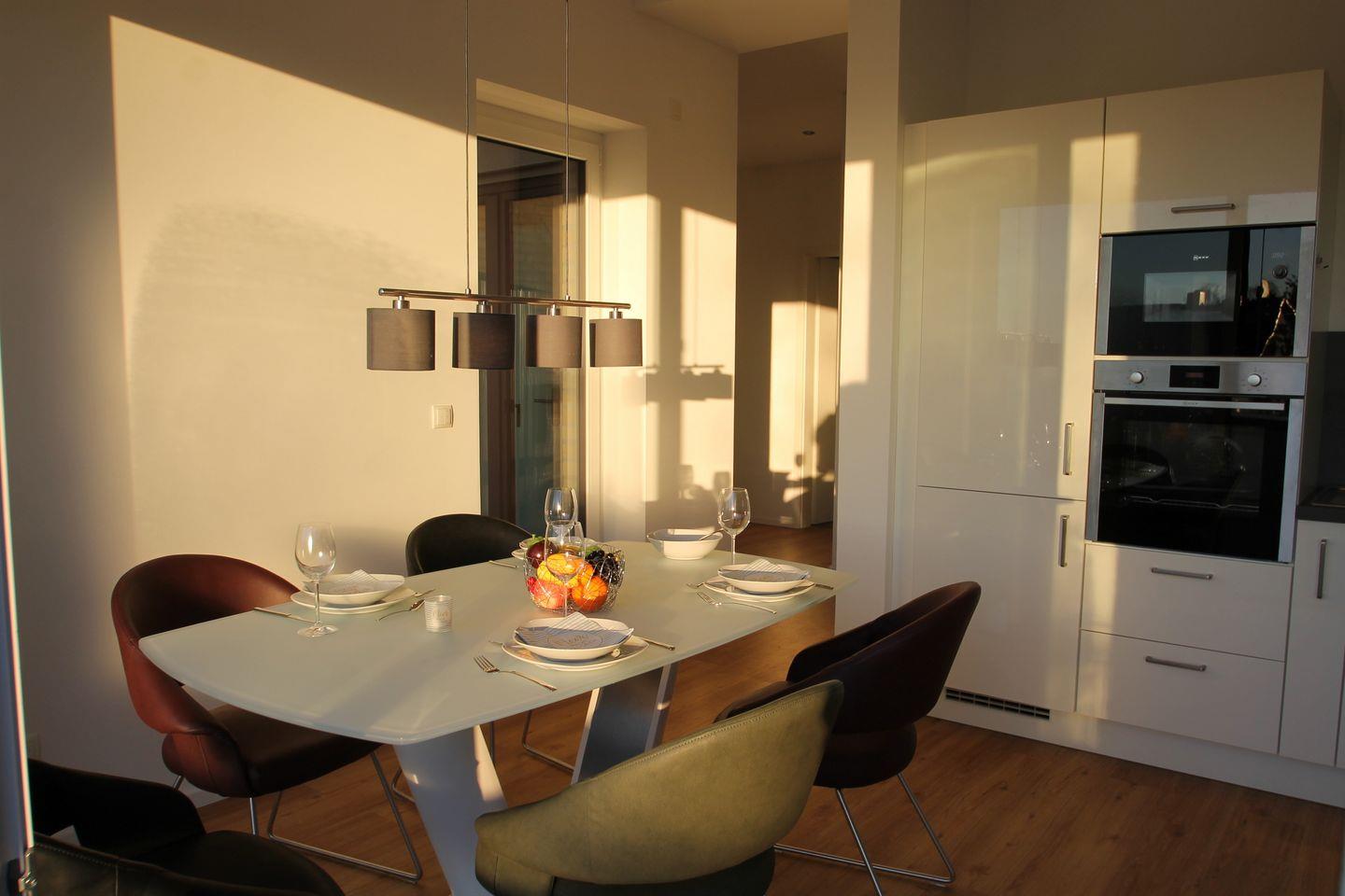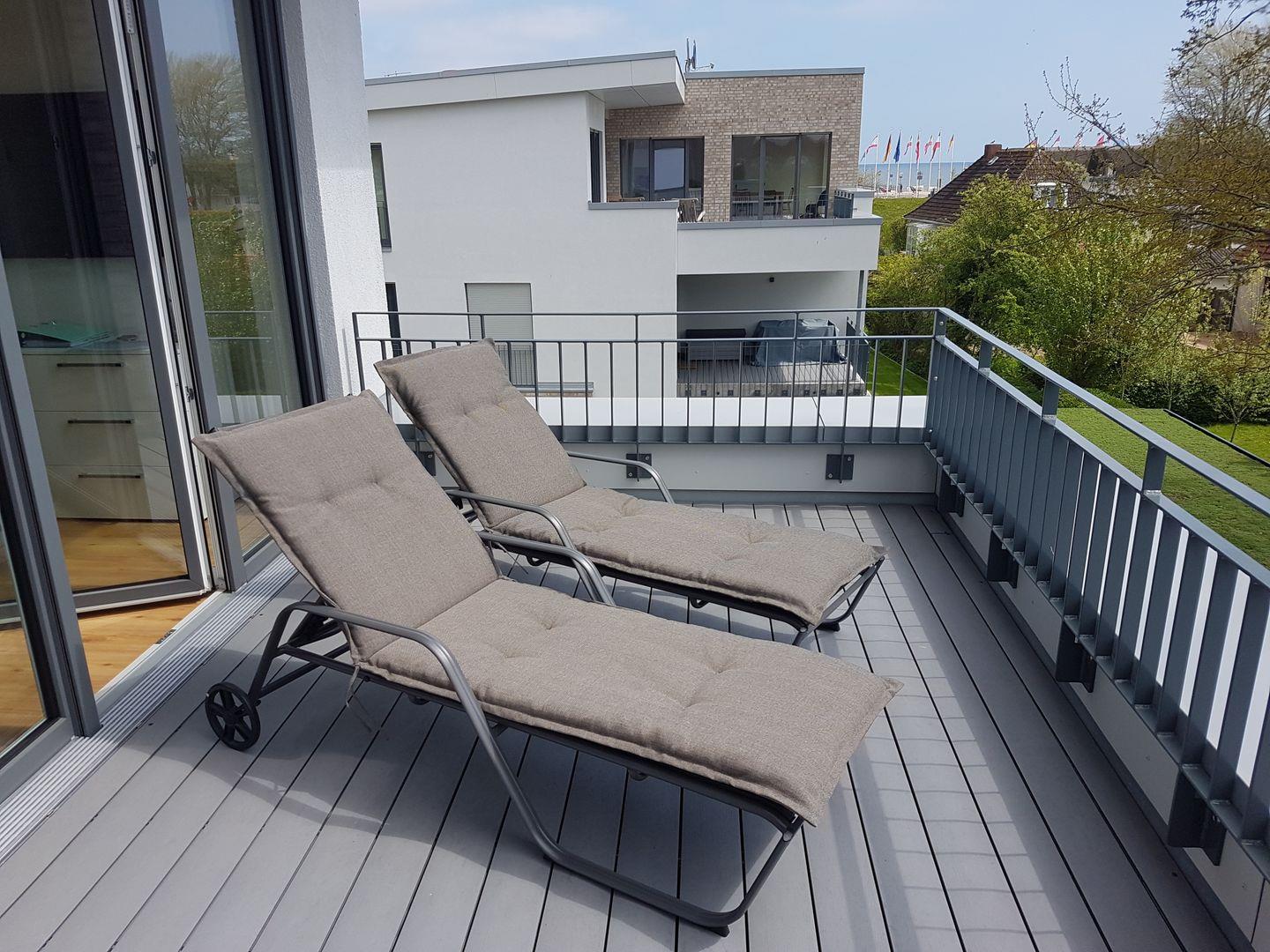 Penthousewohnung direkt hinter dem Deich. Modern eingerichtete 3 Zi-Wohnung im Dachgeschoss mit sehr großer Dachterrasse - teilüberdacht - in unmittelbarer Strandnähe. Die Wohnung verfügt über zwei Schlafzimmer, beide mit jeweils einem Doppelbett (2 x 90x200 cm). Vom Wohn-/Esszimmer aus haben Sie einen direkten Zugang zur sonnigen Dachterrasse. Im Wohnzimmer ist eine hochwertige Schlafcouch für die 5. Person vorhanden. Sehr gute Raumaufteilung und die hochwertige Ausstattung mit Smart-TV (ein TV im Schlafzimmer, einer im Wohnzimmer), Blue-Ray-Player, bodentiefer Dusche und Haartrockner im Badezimmer und ein Waschtrockner ergänzen die gehobene und moderne Ausstattung dieser Wohnung. Ein zweites Duschbad ist vorhanden. Die komplett ausgestattete Küche ist offen in den Wohnraum integriert. Die Fußbodenheizung sorgt für wohlige Wärme. Der PKW-Stellplatz (überdachter Carport) für diese bezaubernde Wohnung ist direkt vor dem Haus, dass insgesamt aus acht Ferienwohnungen besteht. Ein Fahrstuhl bringt Sie gerne ins 2. Obergeschoss. Am Carport findet der Gast auch die abschließbare Unterstellmöglichkeit für mitgebrachte Fahrräder und E-Bikes. In dieser Wohnung können Sie Ihren Ostseetraum verwirklichen und schöne Urlaubstage verbringen! Einziehen, wohlfühlen… und ab ins Meer! Lifestyle Ferienwohnung für den besonderen Urlaub in Dahme.