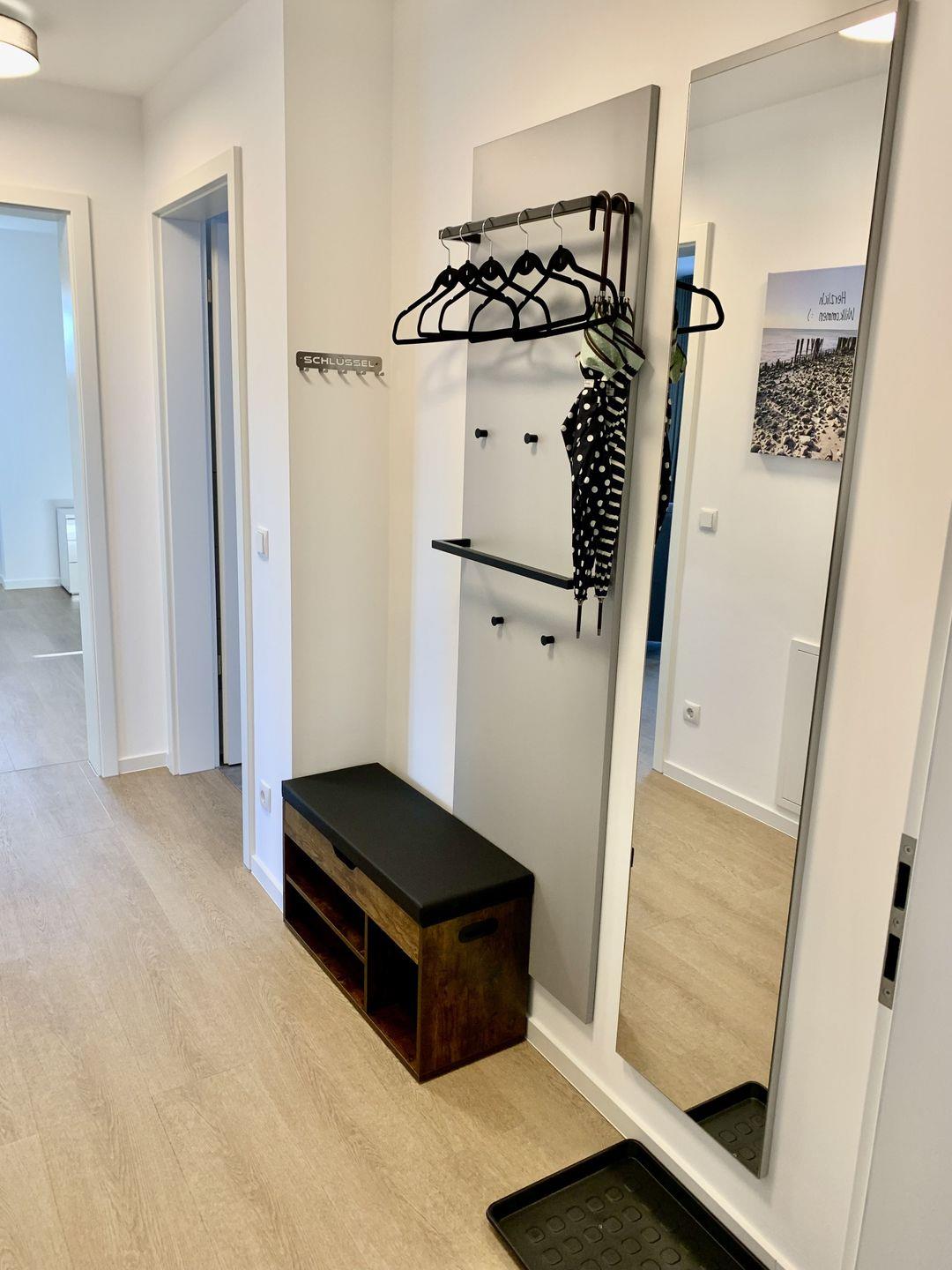 Verdunkelungsrollos an allen Fenstern der Schlafbereiche, Vorhänge im Wohnzimmer, Fußbodenheizung in allen Räumen, WLAN, PKW-Stellplatz, abschließbarer Fahrradabstellplatz!