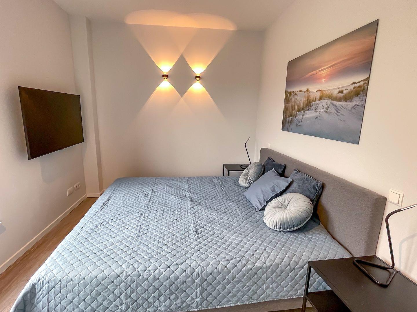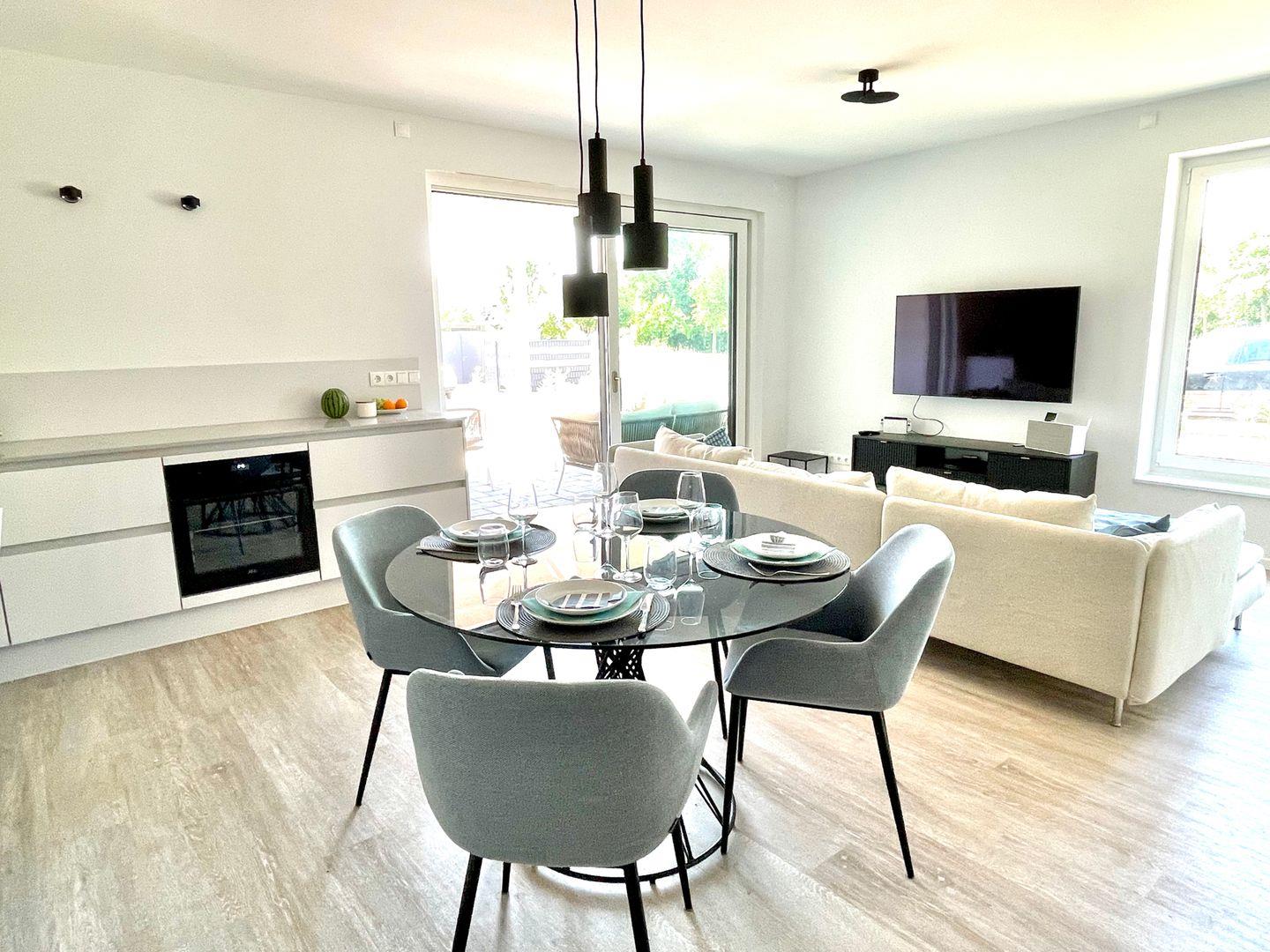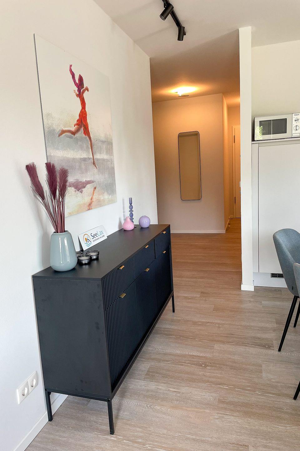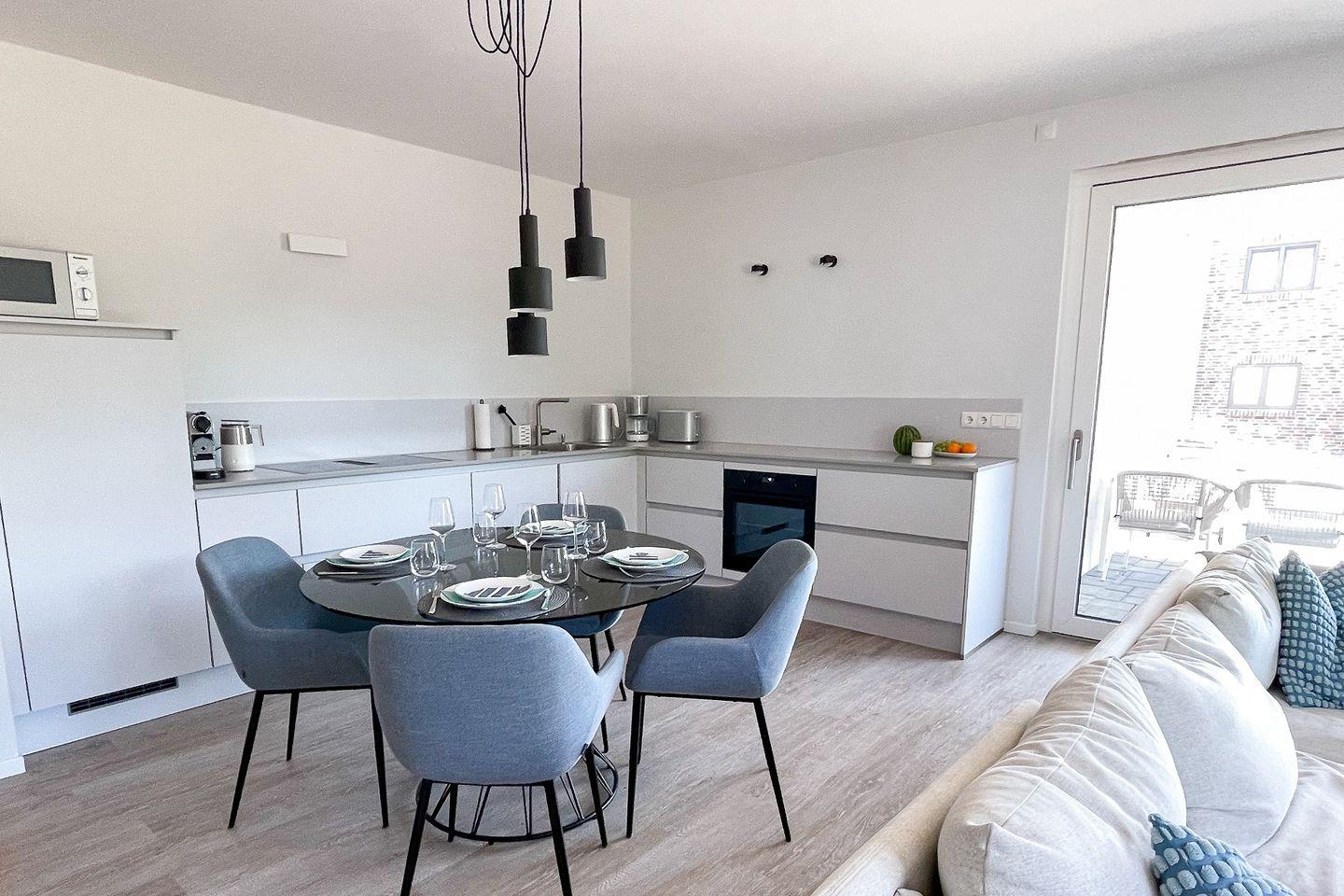 Bereits beim Betreten der Wohnung ist der Wohlfühl-Charakter ausgelöst. Der Eingangsbereich ist mit einer Garderobe ausgestattet. Das erste Schlafzimmer ist mit einem Doppelbett eingerichtet, dass bei Bedarf auch getrennt werden kann. Außenrollläden verdunkeln das Zimmer für einen ruhigen Schlaf. Das zweite Schlafzimmer ist mit einen Bett mit der Größe 180x200 , einem TV-Gerät sowie einem Kleiderschrank eingerichtet. Außenrollläden sorgen auch hier für einen erholsamen Schlaf. Das in heller Optik gehaltene Duschbad hat eine bodentiefe Dusche, Fön und einen Handtuchheizkörper. Der Wohn-Essbereich ist großzügig eingerichtet und durch die bodentiefen Fenster mit Süd- und Westausrichtung hell und freundlich. Ein großer Tisch mit bequemen Schalenstühlen bietet ausreichend Platz. Die offene Küche mit heller Oberfläche ist mit hochwertigen Elektrogeräten ausgestattet: Herd mit integriertem Dunstabzug, Backofen, Mikrowelle, Geschirrspüler, Kühl-/Gefrierkombination, Wasserkocher, Toaster, Filterkaffeemaschine, Nespressomaschine und Milchaufschäumer. Der Wohnbereich ist bequem fein ausgestattet. Ein Smart -Flachbildschirm lässt keine Wünsche offen. Via Bluetooth verbinden und eigene Musik hören - Kein Problem. Auch an einem verregneten Tag lädt eine Nintendo-Switch inkl. einiger Spiele ein, die Zeit gemütlich auf dem Sofa zu verbringen . Vom Wohnzimmer kommen Sie auf die Terrasse in Süd- und West Lage . Die Sonne begrüßt seine Gäste zum Mittag und Abend. Ein großer Tisch mit vier Stühlen und ein bequemes Loungesofa lädt zu gemütlichen Stunden ein. Außerdem verfügt die Wohnung über ein Gäste-WC. Eine Waschmaschine befindet sich in einem Abstellraum in der Wohnung.