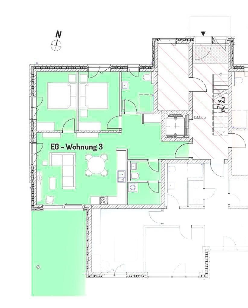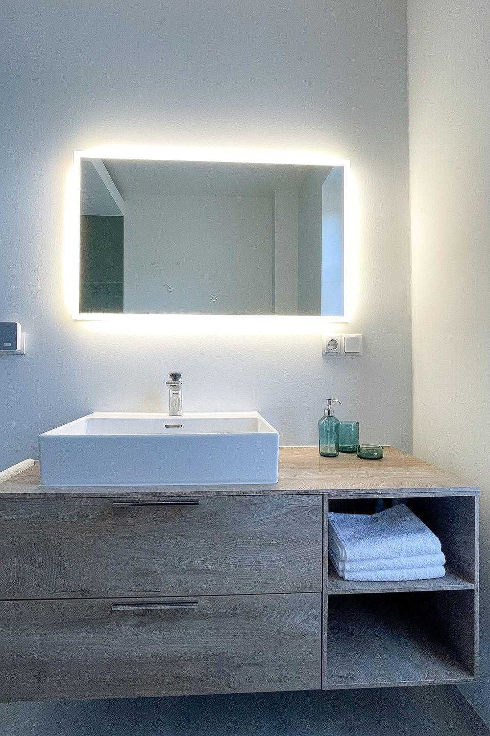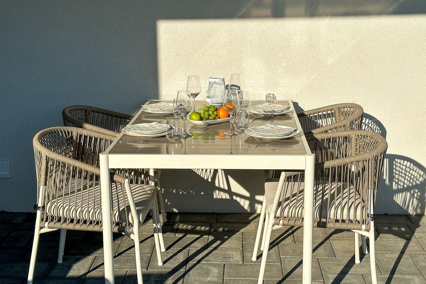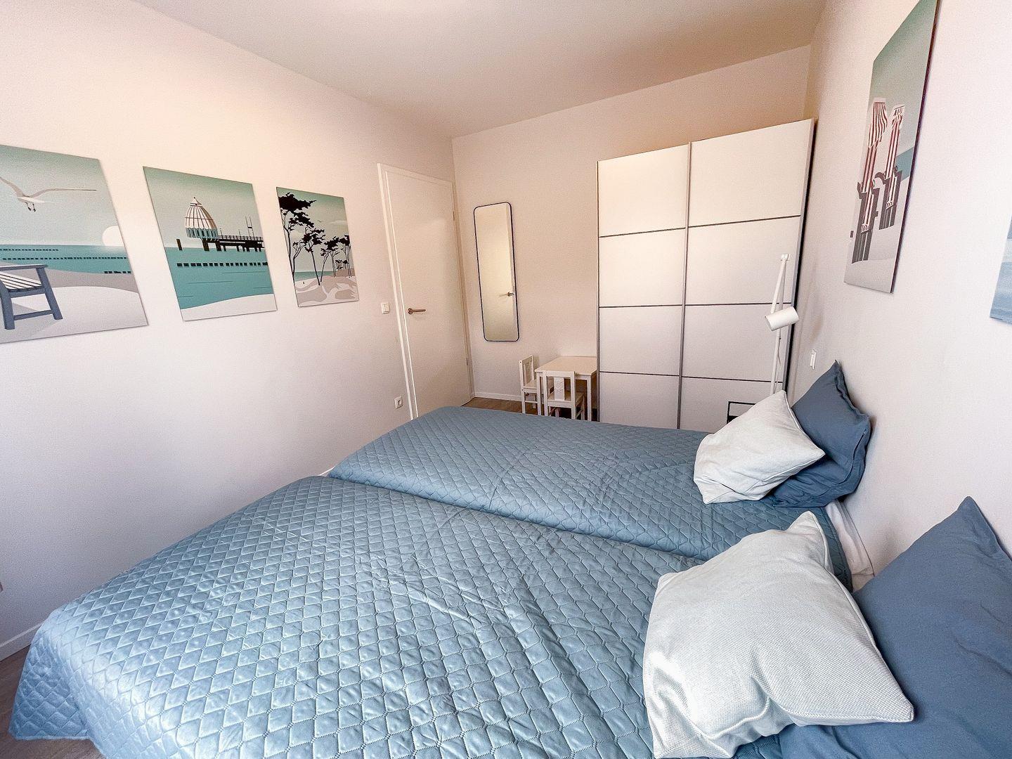 Bereits beim Betreten der Wohnung ist der Wohlfühl-Charakter ausgelöst. Der Eingangsbereich ist mit einer Garderobe ausgestattet. Das erste Schlafzimmer ist mit einem Doppelbett eingerichtet, dass bei Bedarf auch getrennt werden kann. Außenrollläden verdunkeln das Zimmer für einen ruhigen Schlaf. Das zweite Schlafzimmer ist mit einen Bett mit der Größe 180x200 , einem TV-Gerät sowie einem Kleiderschrank eingerichtet. Außenrollläden sorgen auch hier für einen erholsamen Schlaf. Das in heller Optik gehaltene Duschbad hat eine bodentiefe Dusche, Fön und einen Handtuchheizkörper. Der Wohn-Essbereich ist großzügig eingerichtet und durch die bodentiefen Fenster mit Süd- und Westausrichtung hell und freundlich. Ein großer Tisch mit bequemen Schalenstühlen bietet ausreichend Platz. Die offene Küche mit heller Oberfläche ist mit hochwertigen Elektrogeräten ausgestattet: Herd mit integriertem Dunstabzug, Backofen, Mikrowelle, Geschirrspüler, Kühl-/Gefrierkombination, Wasserkocher, Toaster, Filterkaffeemaschine, Nespressomaschine und Milchaufschäumer. Der Wohnbereich ist bequem fein ausgestattet. Ein Smart -Flachbildschirm lässt keine Wünsche offen. Via Bluetooth verbinden und eigene Musik hören - Kein Problem. Auch an einem verregneten Tag lädt eine Nintendo-Switch inkl. einiger Spiele ein, die Zeit gemütlich auf dem Sofa zu verbringen . Vom Wohnzimmer kommen Sie auf die Terrasse in Süd- und West Lage . Die Sonne begrüßt seine Gäste zum Mittag und Abend. Ein großer Tisch mit vier Stühlen und ein bequemes Loungesofa lädt zu gemütlichen Stunden ein. Außerdem verfügt die Wohnung über ein Gäste-WC. Eine Waschmaschine befindet sich in einem Abstellraum in der Wohnung.
