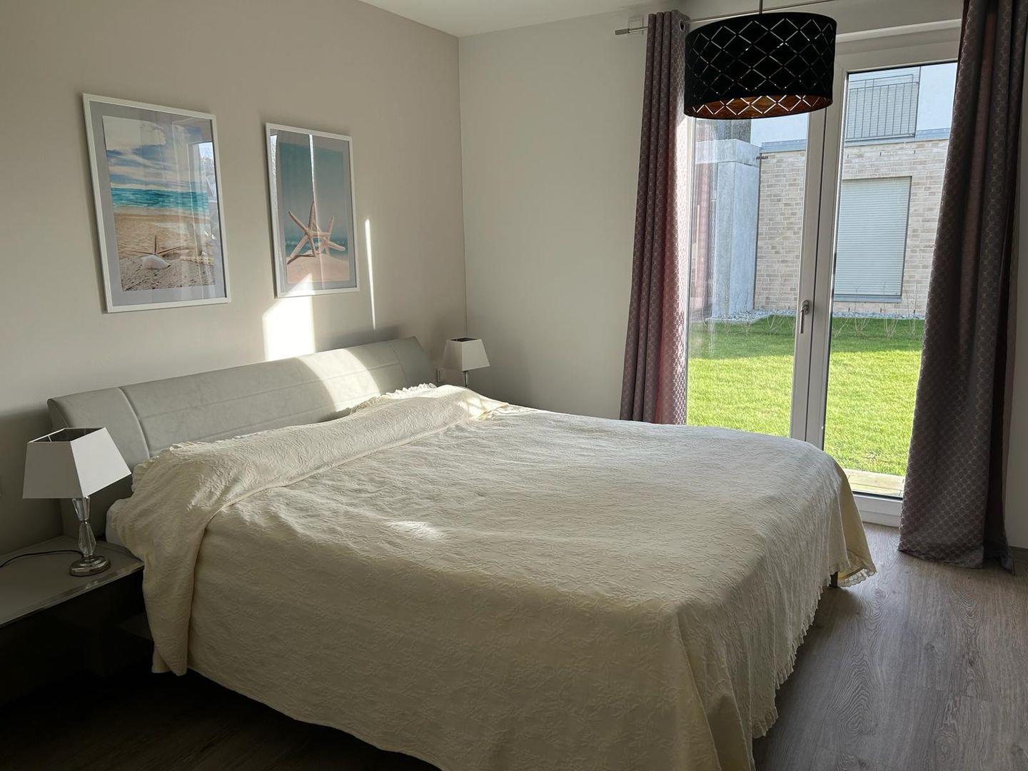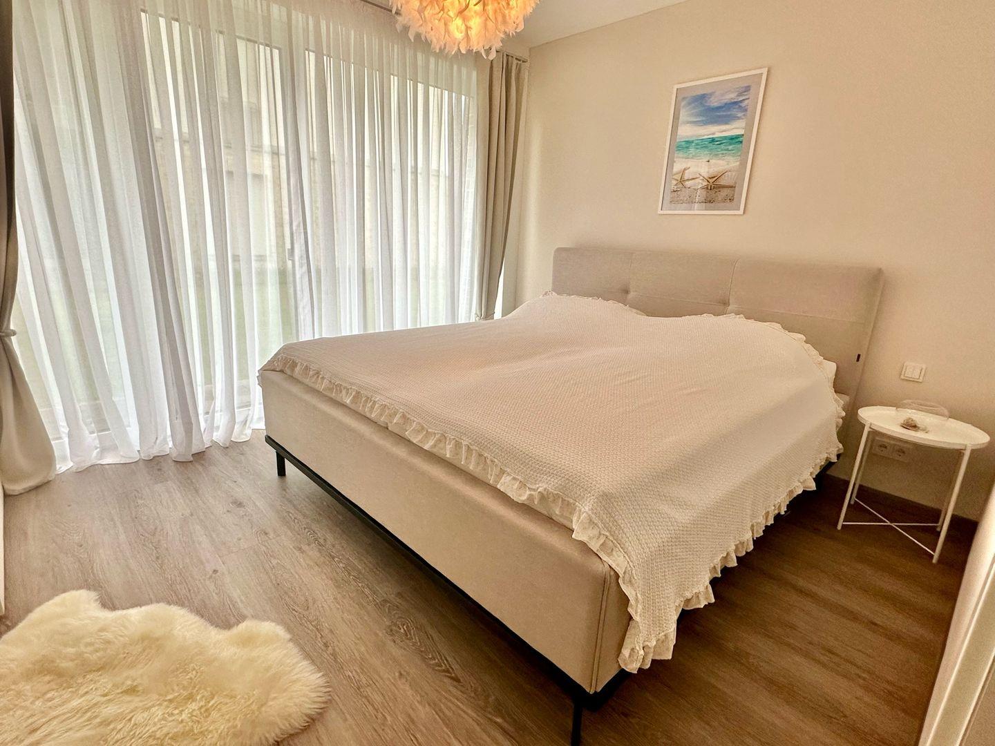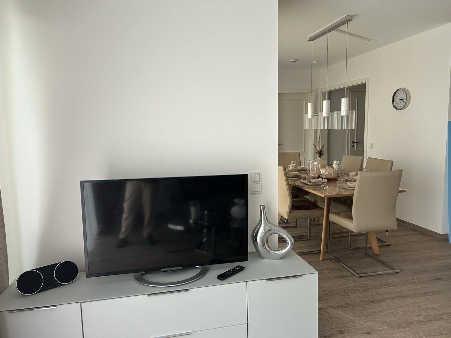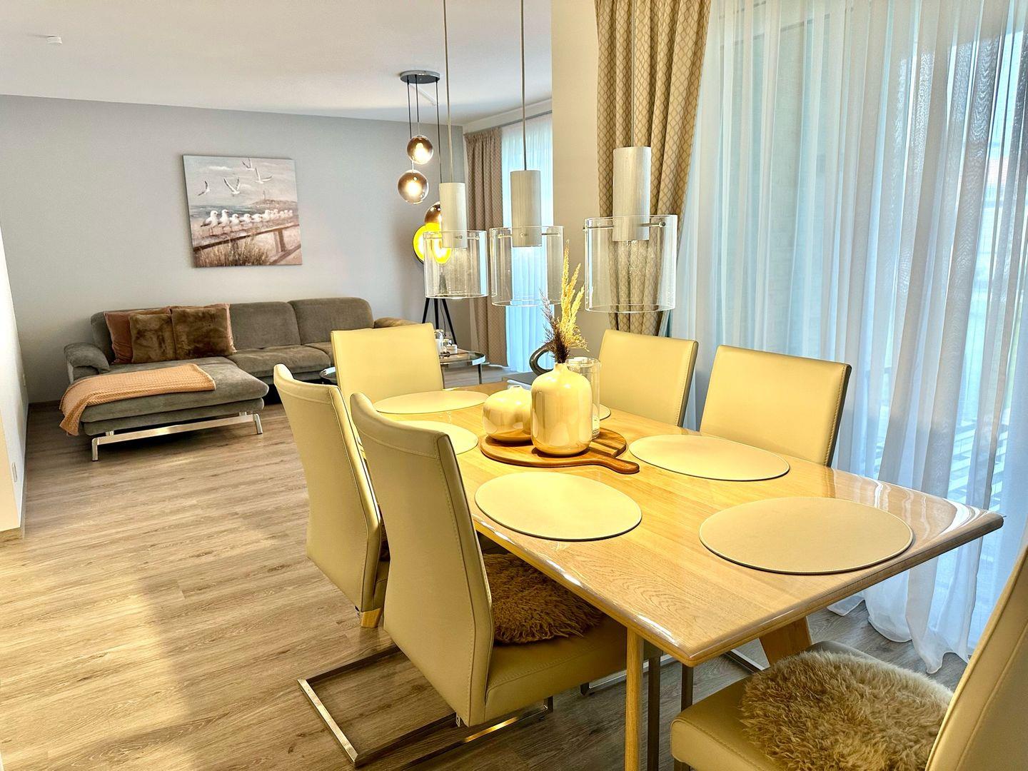 Zeitgemäßer Luxus in Perfektion! Hier ist es gelungen, unter Verwendung warmer Farben, hochwertiger Materialien und exklusivem Mobiliar in Verbindung mit wunderbaren Einbauten ein herrliches Ambiente zu schaffen, das höchsten Ansprüchen genügt. Es erwartet Sie ein lichtdurchfluteter Wohn- Essbereich mit bodentiefen Fenstern und Blick auf die schöne Terrasse, die teilweise überdacht ist. Die Räumlichkeiten sind großzügig und bieten ausreichend Raum für gemeinsame Mahlzeiten und gemütliches Beisammensein. Die äußerst hochwertige Küche in perfekter Ausstattung fügt sich wunderbar in den Wohnraum ein. Es stehen zwei separate Schlafzimmer zur Verfügung, die mit ausgezeichnet komfortablen Boxspringbetten , Schränken und je einem TV ausgestattet sind. Die Fenster lassen sich durch elektrische Rollläden verdunkeln. Das neue Duschbad ist mit hochwertigen Sanitärobjekten ausgestattet. Weiterhin steht ein separates Gäste WC zur Verfügung. Ein fester Parkplatz befindet sich direkt an der Wohnung und Fahrräder können in einer abschließbaren Fahrradgarage sicher und trocken untergestellt werden. Im Wirtschaftsraum befinden sich der Kühl-Gefrierschrank sowie die Waschmaschine . Bei diesem Objekt handelt es sich um ein Nichtraucherobjekt. Haustiere sind nicht gestattet.