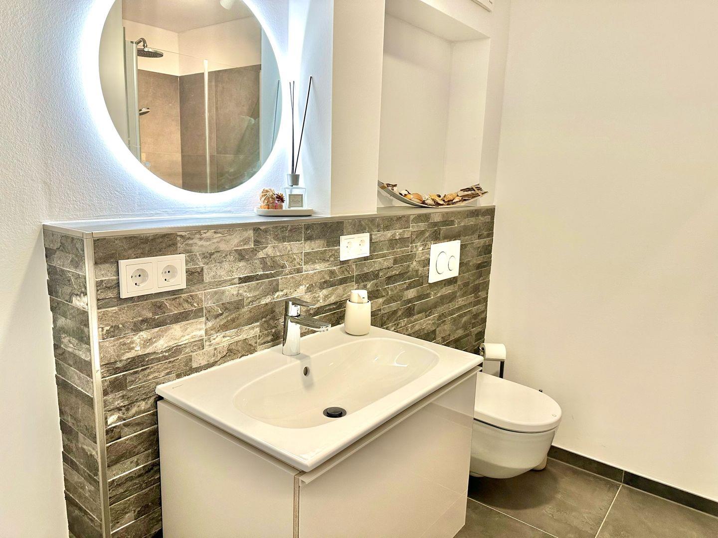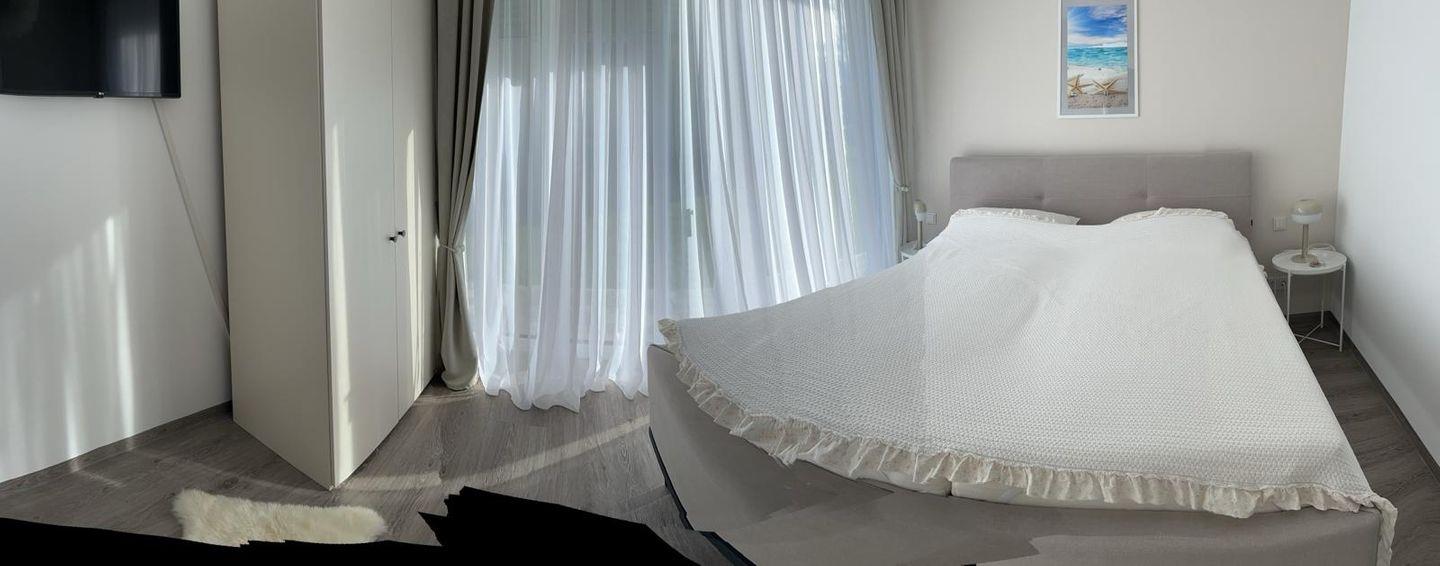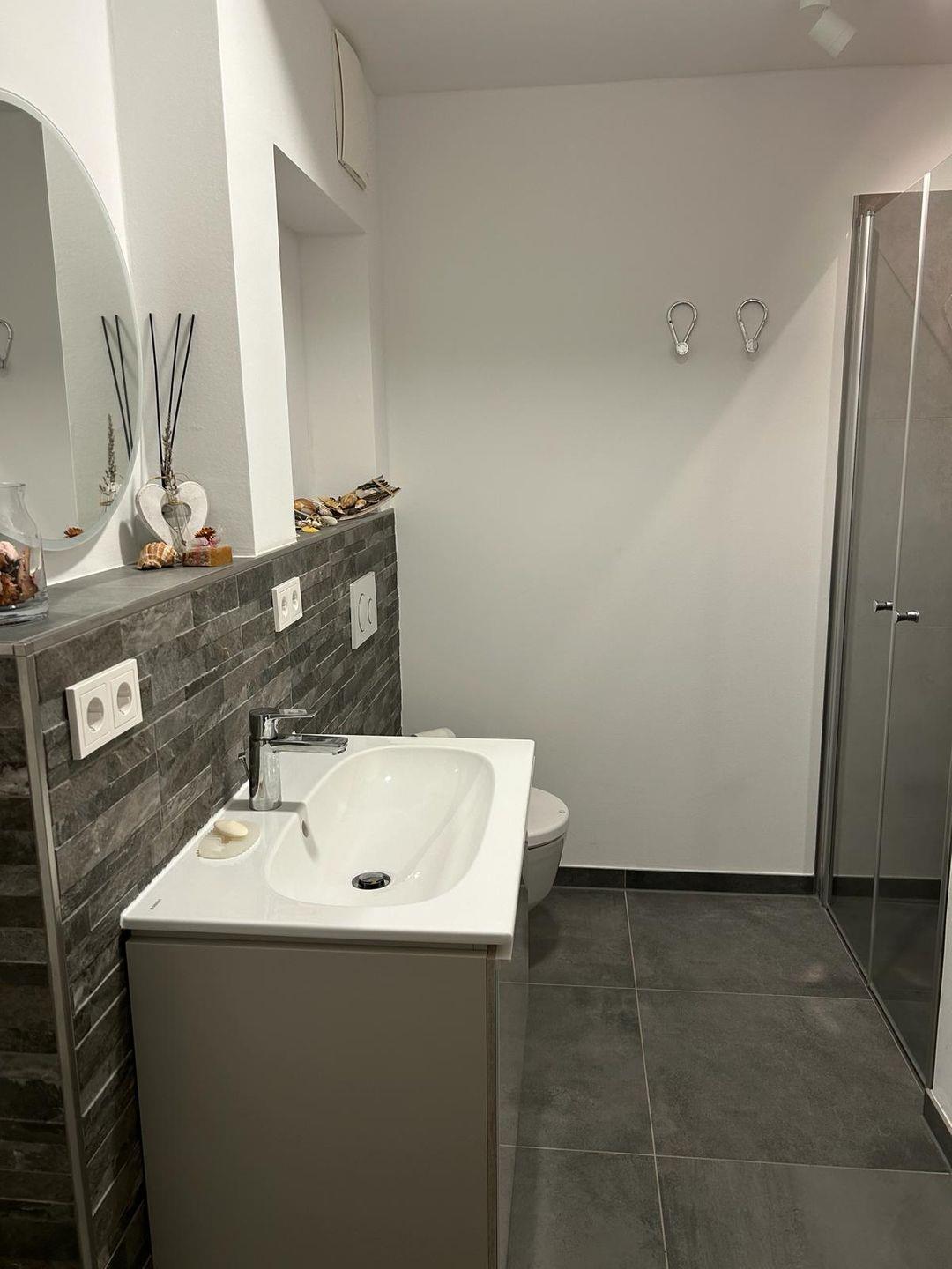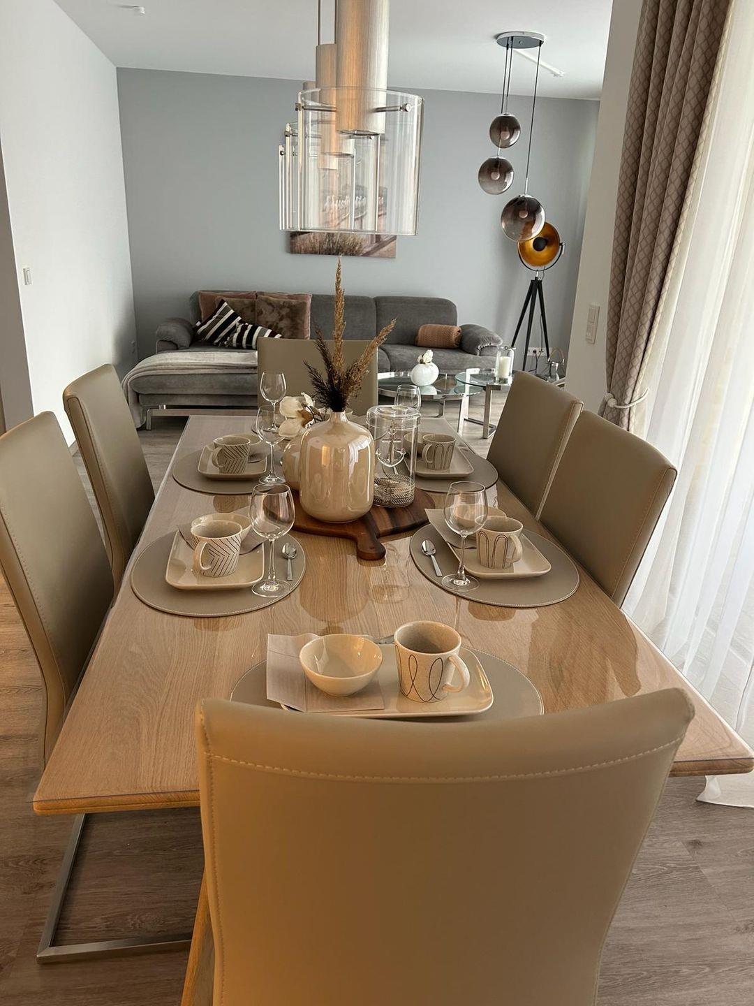 Zeitgemäßer Luxus in Perfektion! Hier ist es gelungen, unter Verwendung warmer Farben, hochwertiger Materialien und exklusivem Mobiliar in Verbindung mit wunderbaren Einbauten ein herrliches Ambiente zu schaffen, das höchsten Ansprüchen genügt. Es erwartet Sie ein lichtdurchfluteter Wohn- Essbereich mit bodentiefen Fenstern und Blick auf die schöne Terrasse, die teilweise überdacht ist. Die Räumlichkeiten sind großzügig und bieten ausreichend Raum für gemeinsame Mahlzeiten und gemütliches Beisammensein. Die äußerst hochwertige Küche in perfekter Ausstattung fügt sich wunderbar in den Wohnraum ein. Es stehen zwei separate Schlafzimmer zur Verfügung, die mit ausgezeichnet komfortablen Boxspringbetten , Schränken und je einem TV ausgestattet sind. Die Fenster lassen sich durch elektrische Rollläden verdunkeln. Das neue Duschbad ist mit hochwertigen Sanitärobjekten ausgestattet. Weiterhin steht ein separates Gäste WC zur Verfügung. Ein fester Parkplatz befindet sich direkt an der Wohnung und Fahrräder können in einer abschließbaren Fahrradgarage sicher und trocken untergestellt werden. Im Wirtschaftsraum befinden sich der Kühl-Gefrierschrank sowie die Waschmaschine . Bei diesem Objekt handelt es sich um ein Nichtraucherobjekt. Haustiere sind nicht gestattet.