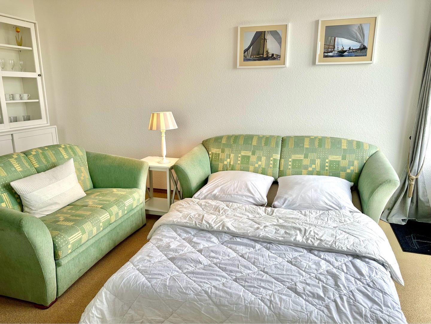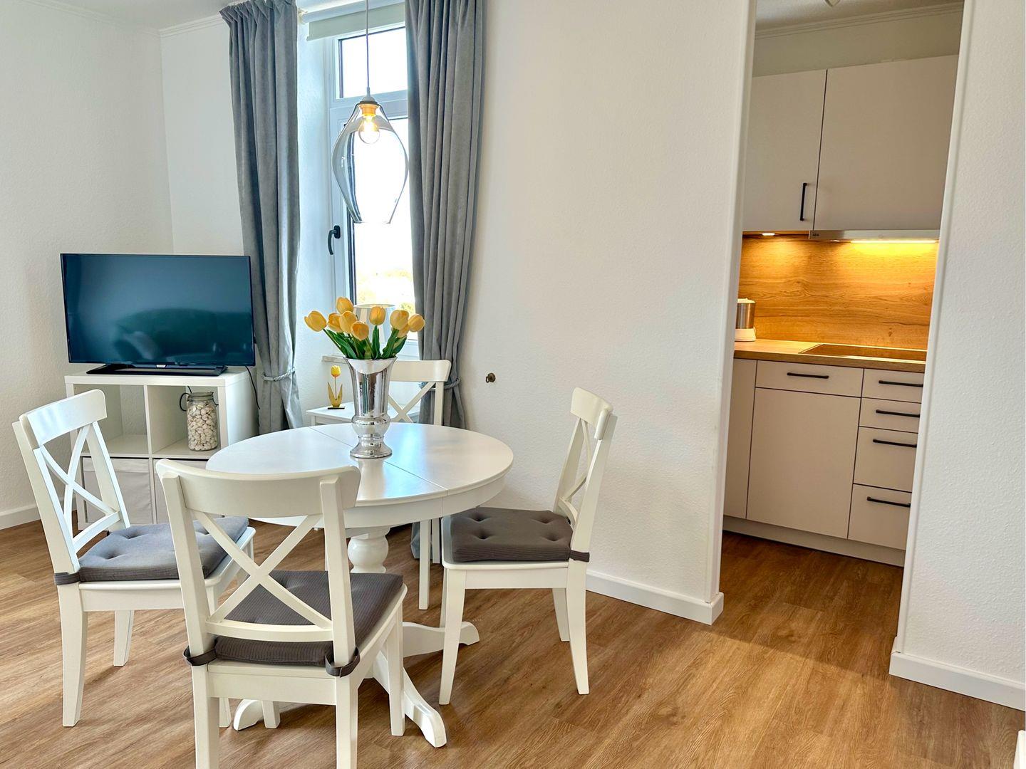 Das 48 m² große Ferienappartement im 3. Stock ist ideal für bis zu vier Gäste geeignet und verfügt über ein gemütliches Schlafzimmer mit einem komfortablen Doppelbett ( 2x 1m x2,00m ). Im Wohnzimmer erwarten Sie ein Schlafsofa mit Federkern und ein Fernseher, die zum Verweilen und Entspannen einladen. Hier können Sie nach einem erlebnisreichen Tag am Strand die wohlverdiente Ruhe genießen. Die moderne, neue Küche ist mit Geräten ausgestattet, darunter ein Induktionsherd, Backofen, Kühlschrank mit Gefrierfach, Wasserkocher, Toaster und eine Kaffeemaschine. Genießen Sie die Freiheit, sich selbst zu verpflegen und dabei Ihre Mahlzeiten auch auf dem Balkon bei schönem Wetter zu genießen.