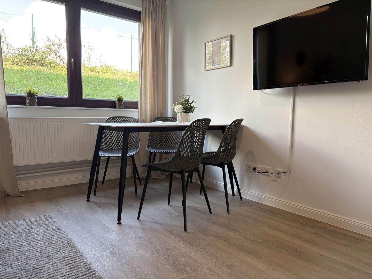 - Wohnzimmer mit Sofa, Tisch, 2 Sesseln und TV, Esstisch und Stühlen;