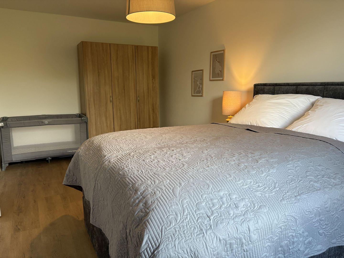 - Schlafzimmer mit Boxspringbett (durchgängige Matratze mit Topper), Kleiderschrank und Kinderreisebett