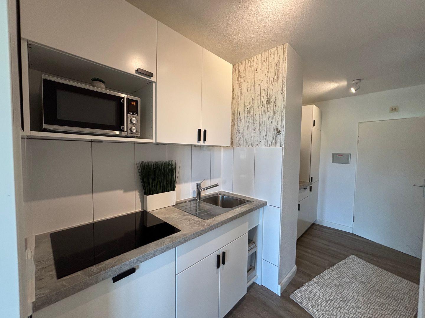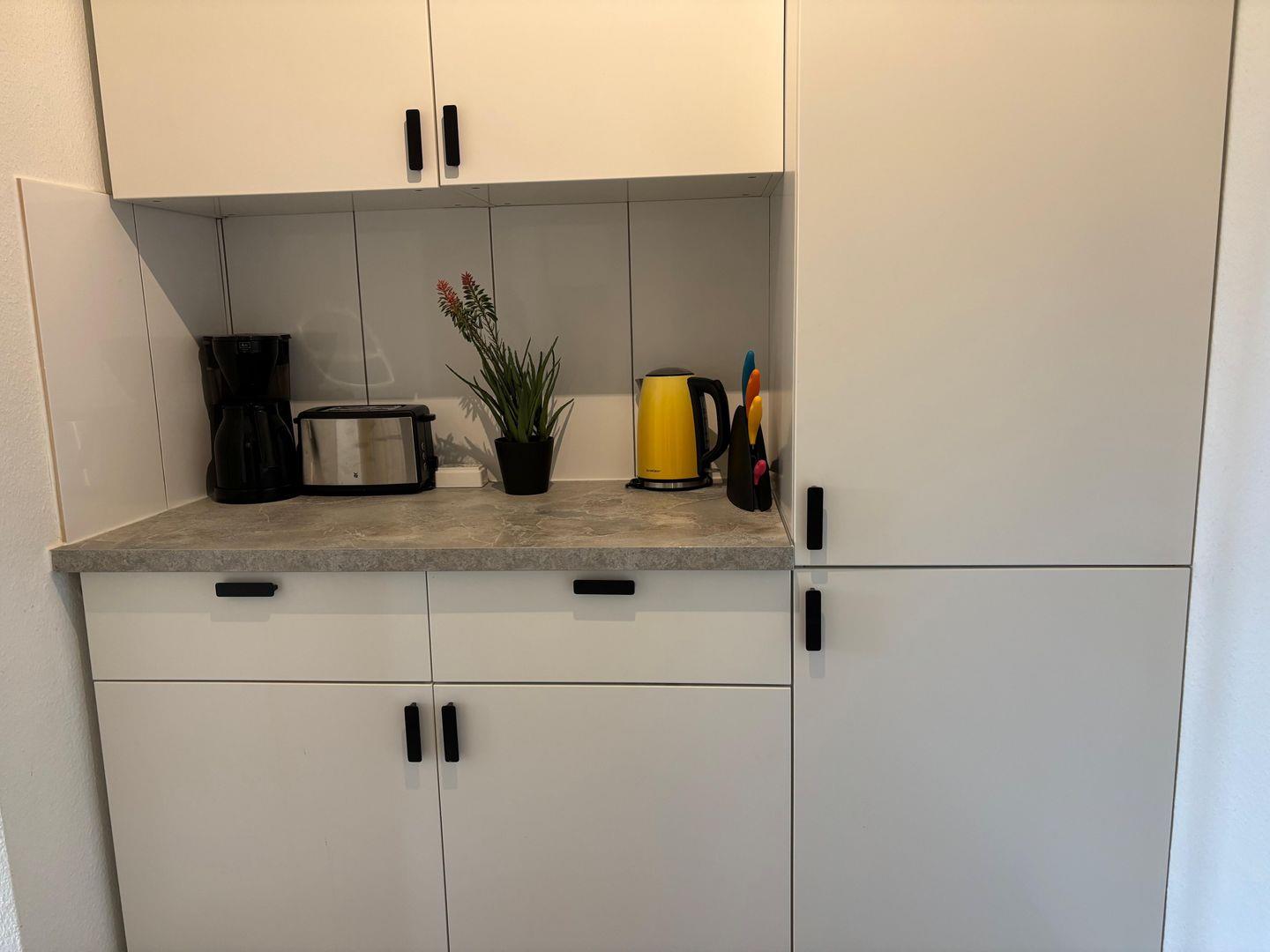Ceranfeld mit 4 Kochzonen. Kaffeemaschine. Toaster. Eierkocher. Mikrowelle. Geschirrspüler.