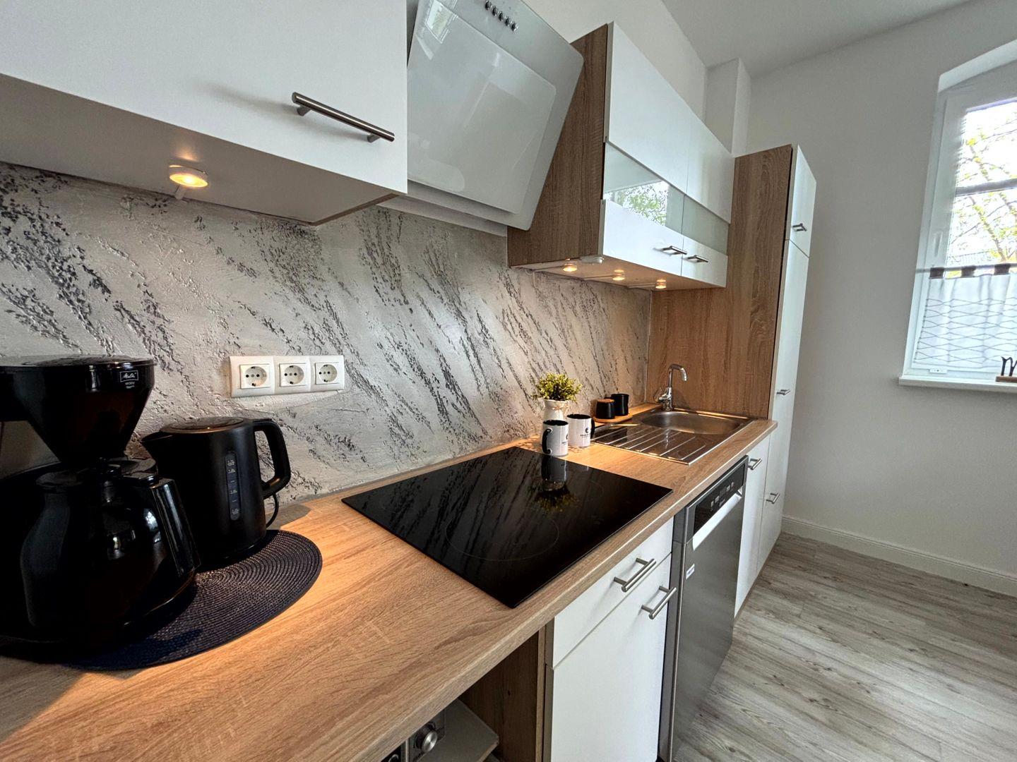 Ceranfeld mit 4 Kochzonen. Kaffeemaschine. Toaster. Eierkocher. Mikrowelle. Geschirrspülmaschine.