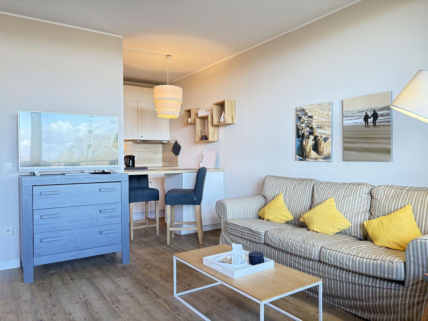 - Wohnzimmer mit gemütlichem Sofa, ein großer Flachbildfernseher
