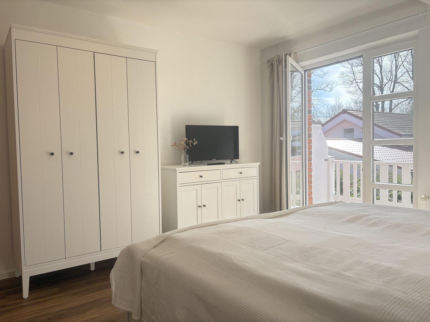 - Schlafzimmer mit Doppelbett (2 Einzelmatratzen 90x200cm), Kleiderschrank und Kommode,