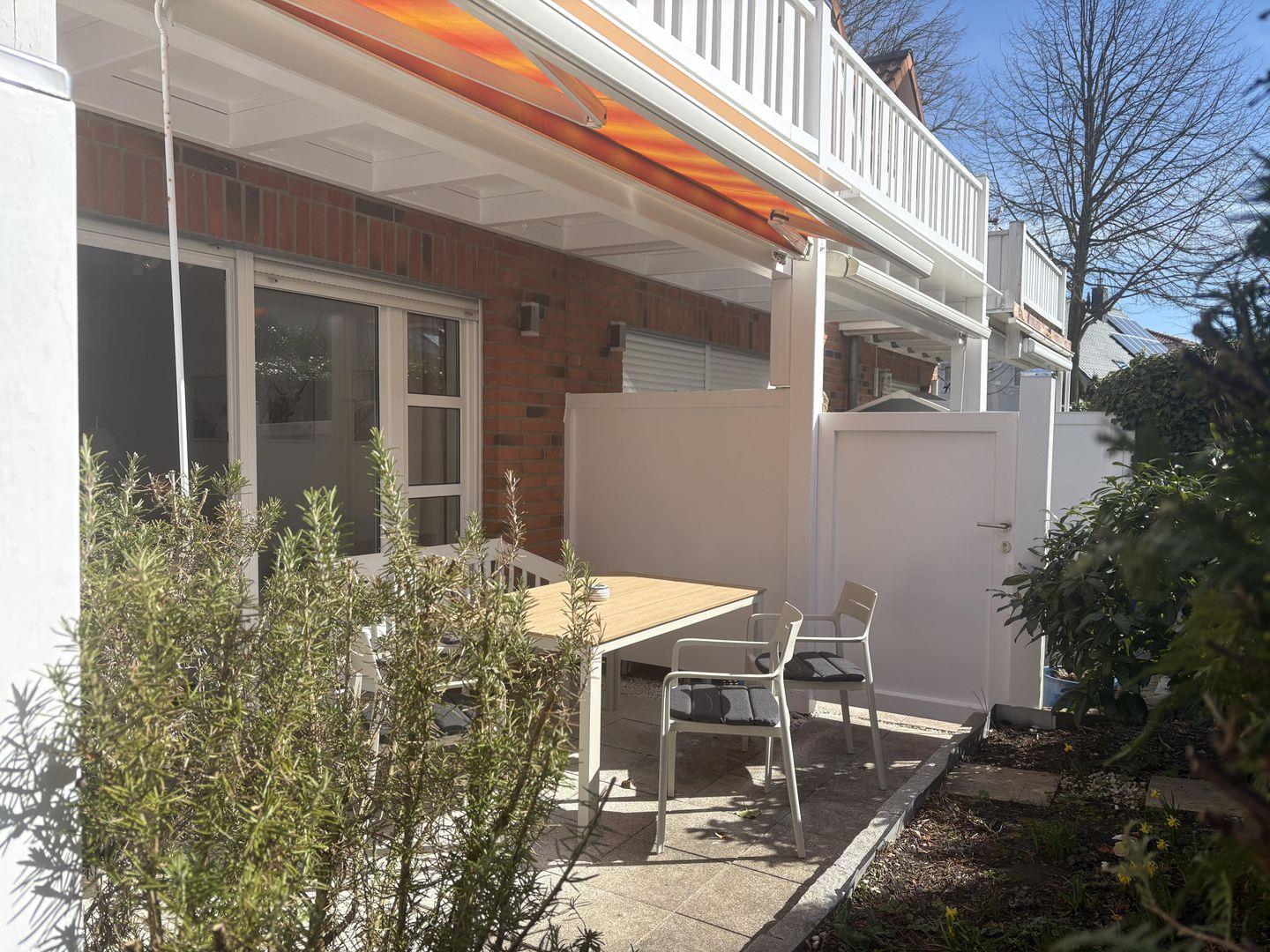direkter Zugang zur überdachten möblierten Terrasse mit Markise,