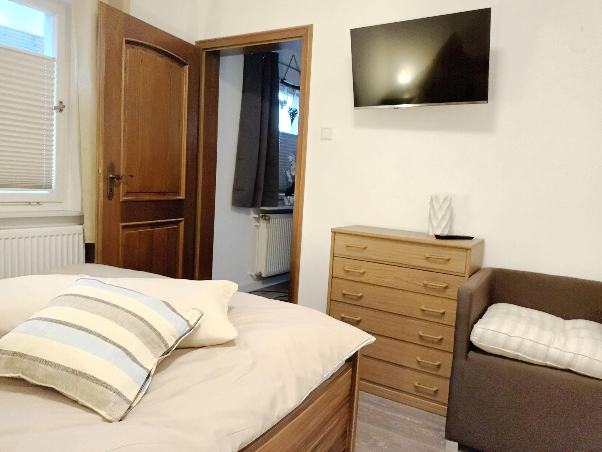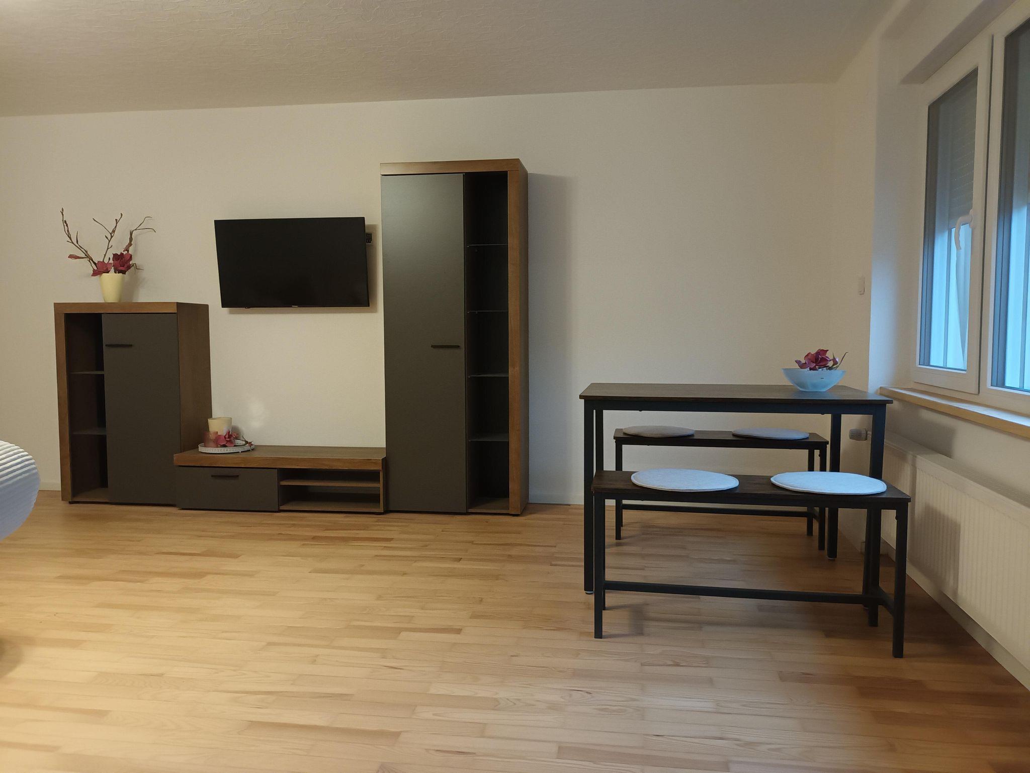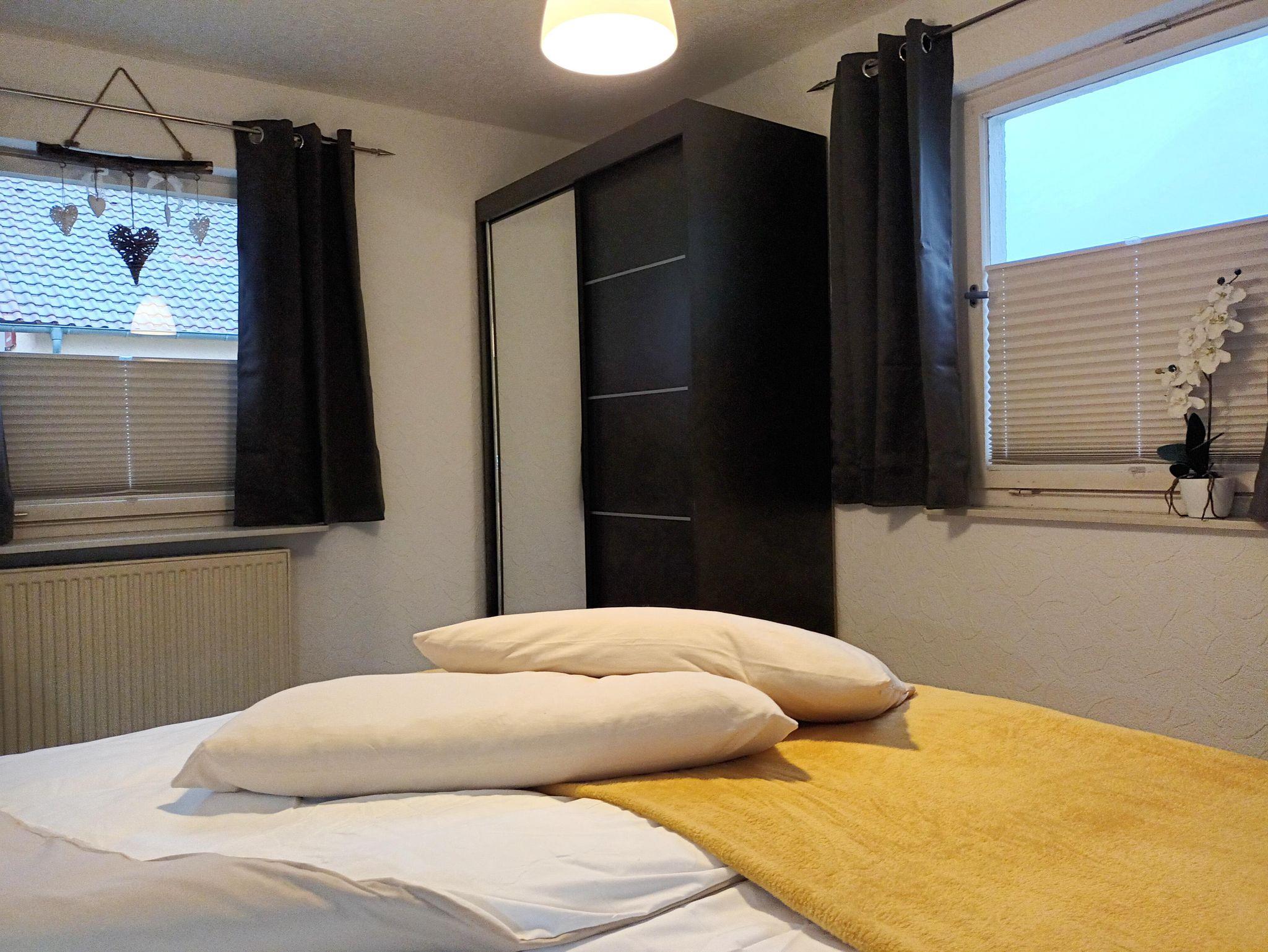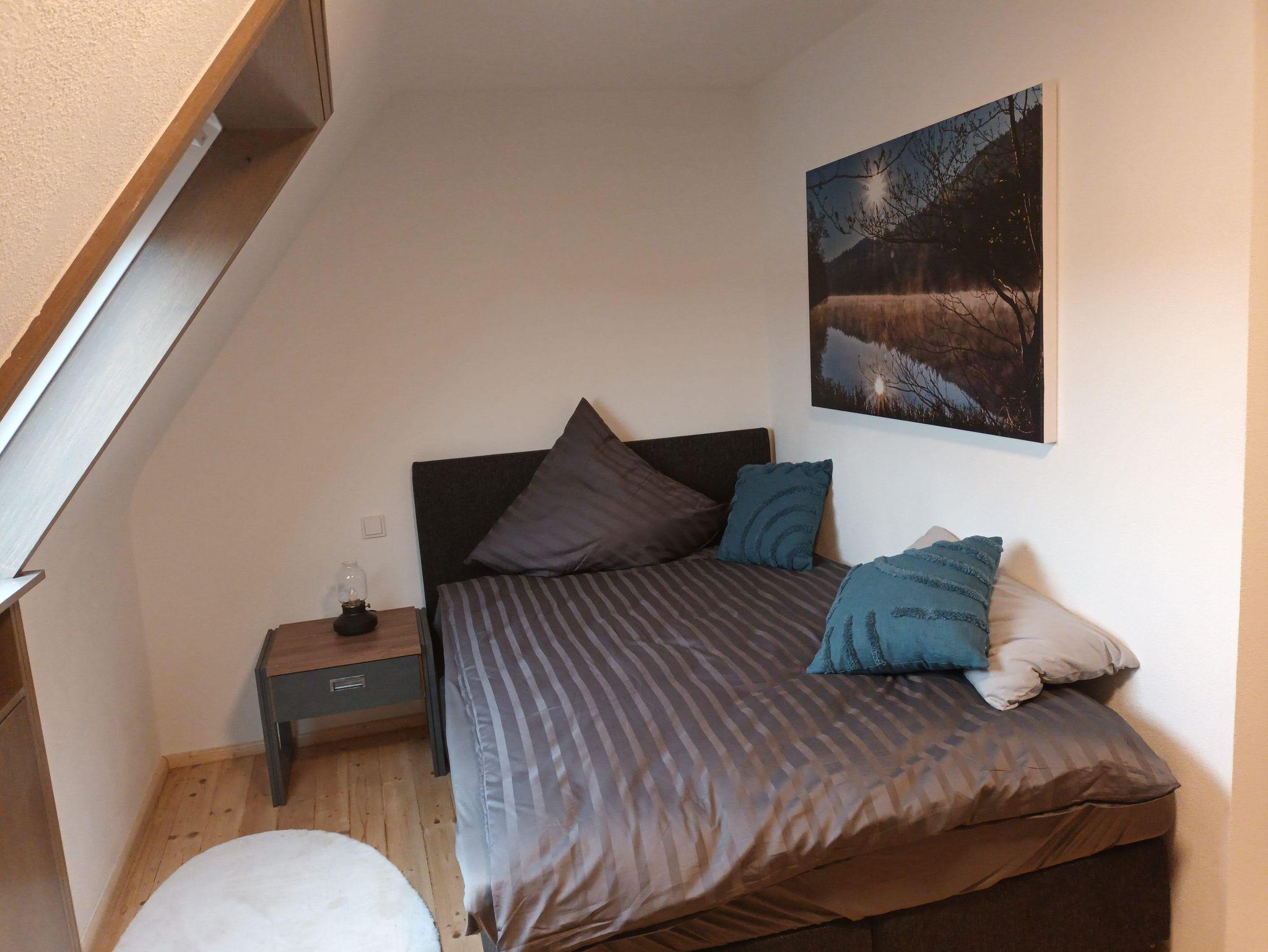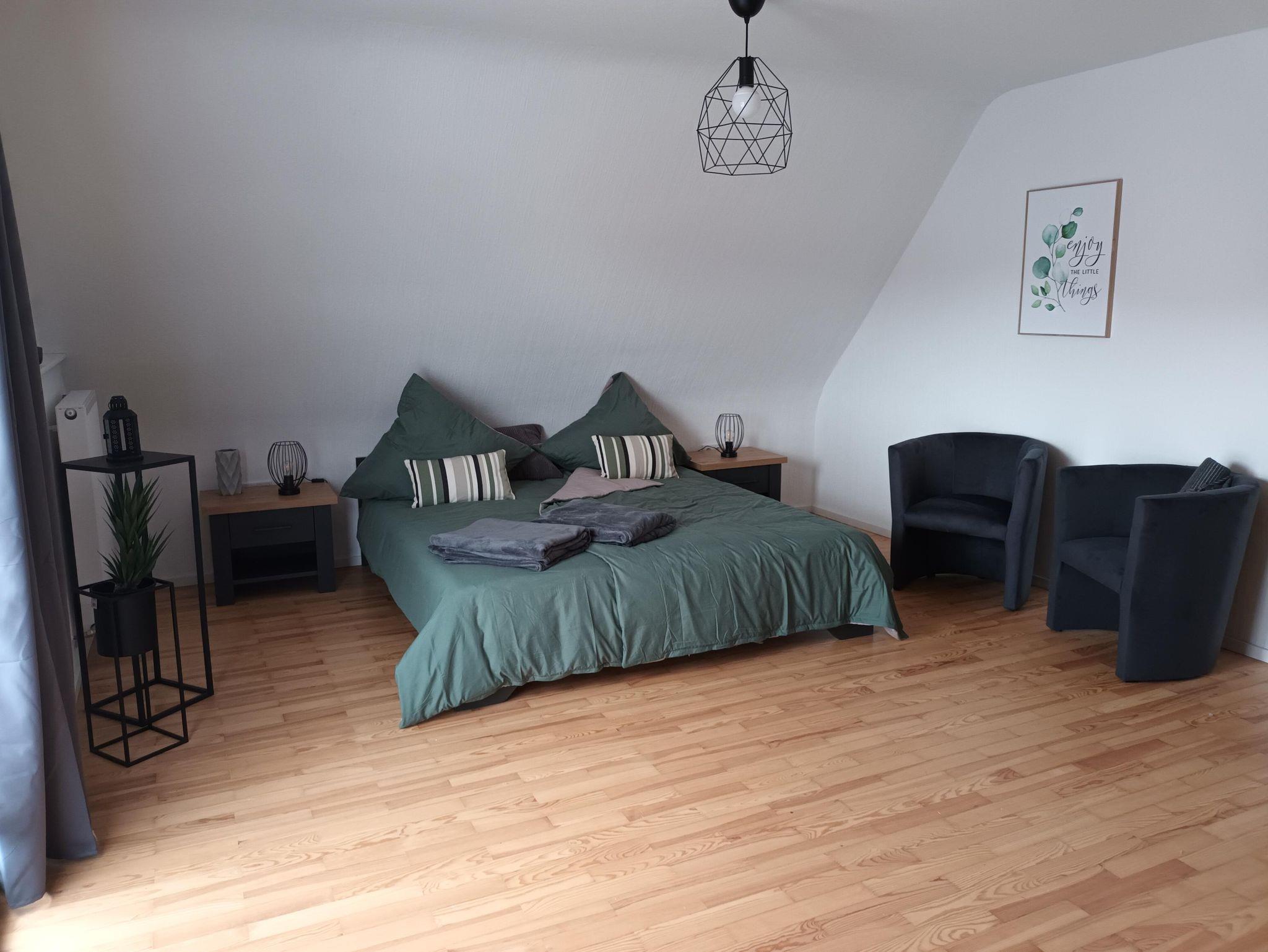 Im Schlafzimmer steht ein Doppelbett 180x200 cm. Getrennte Matratzen, 2 Bettdecken in Komfortgrößen 155x220, inkl. Bettwäsche laden zum Kuscheln ein. Zudem ist das Zimmer ausgestattet mit einem großen Kleiderschrank, 2 Sessel und einem Flachbild-TV. Auf dem Balkon können Sie an einem Tisch mit 2 Stühlen den Ausblick auf den Hochstein und die Burgengruppe Altdahn, die abends beleuchtet ist, genießen.