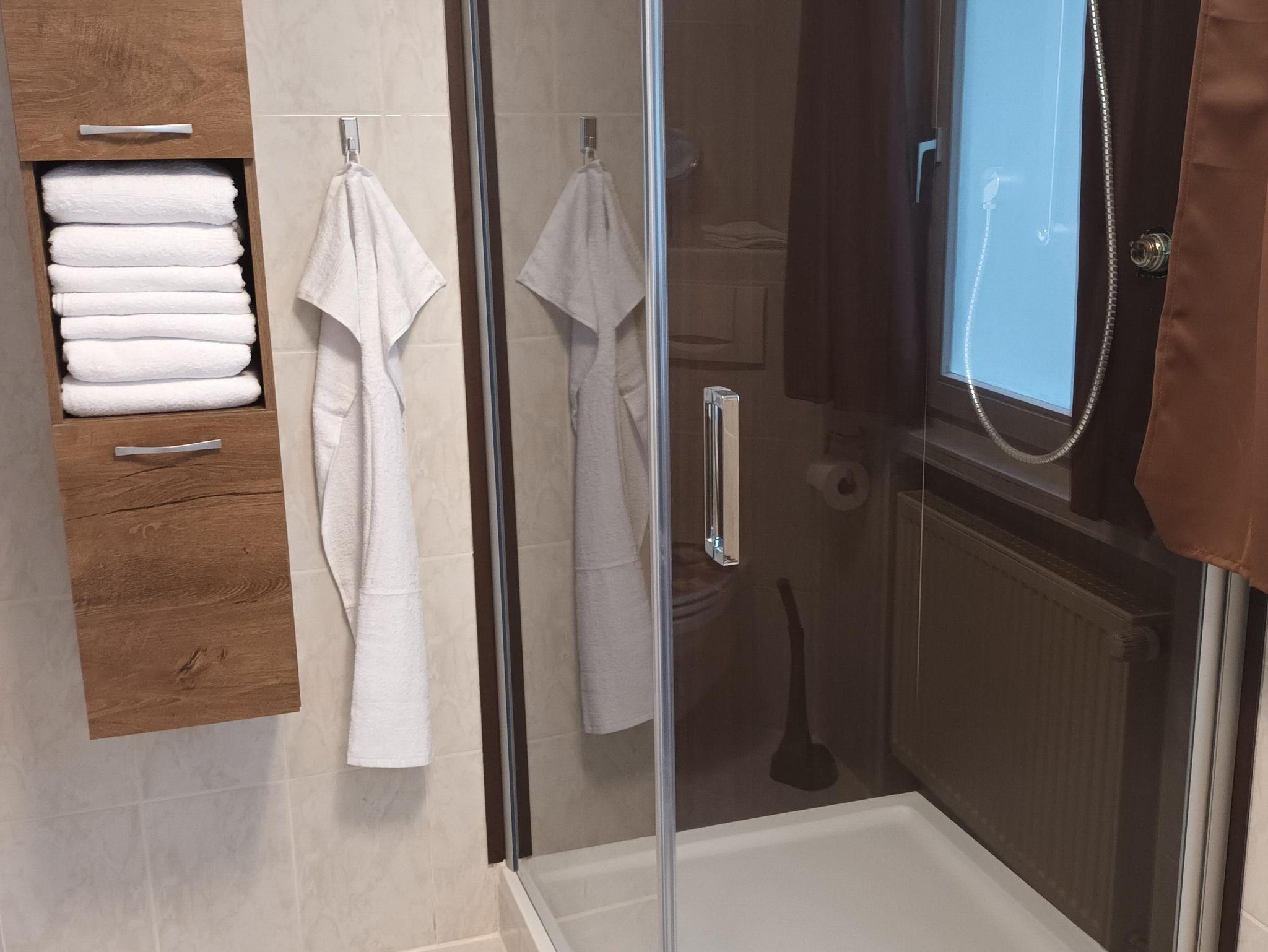 1 Badezimmer mit großer Dusche und WC im Erdgeschoss