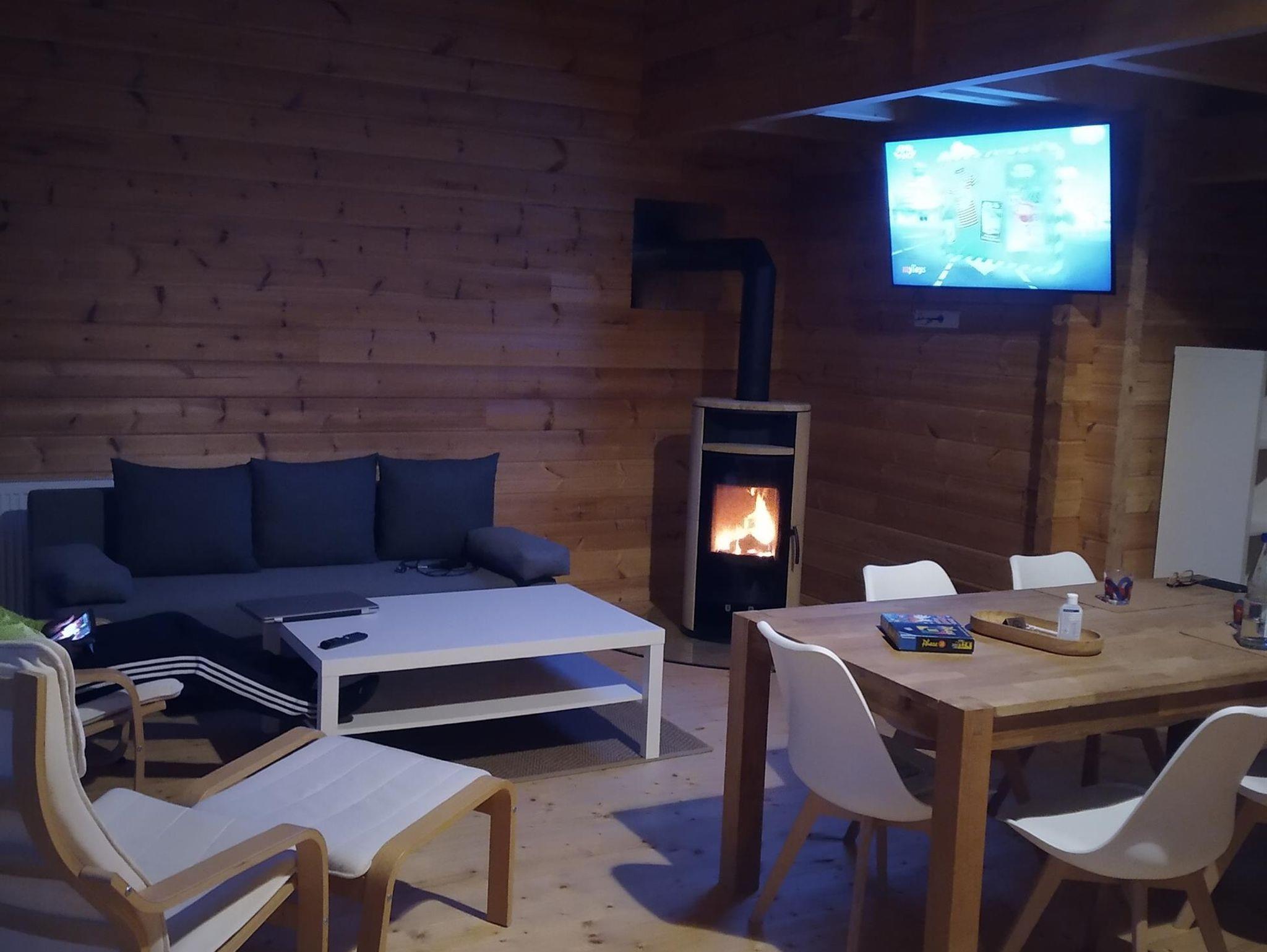 mit TV, großer Fensterfront und Ausgang zur möblierten Terrasse, Bad mit Dusche und WC sowie zusätzliches WC im Obergeschoss.