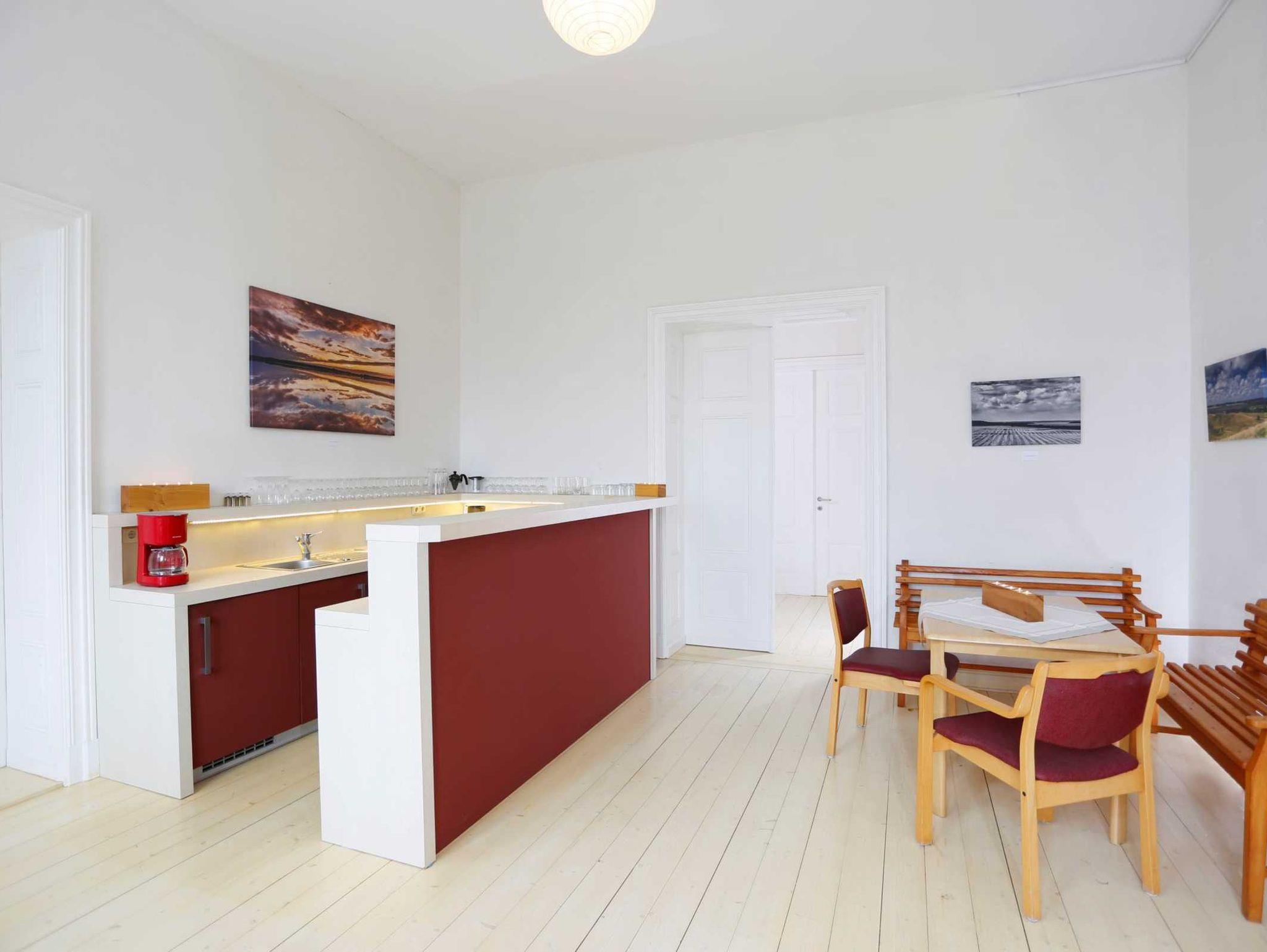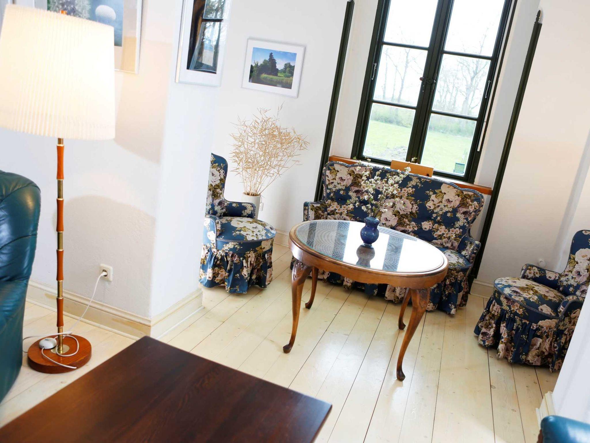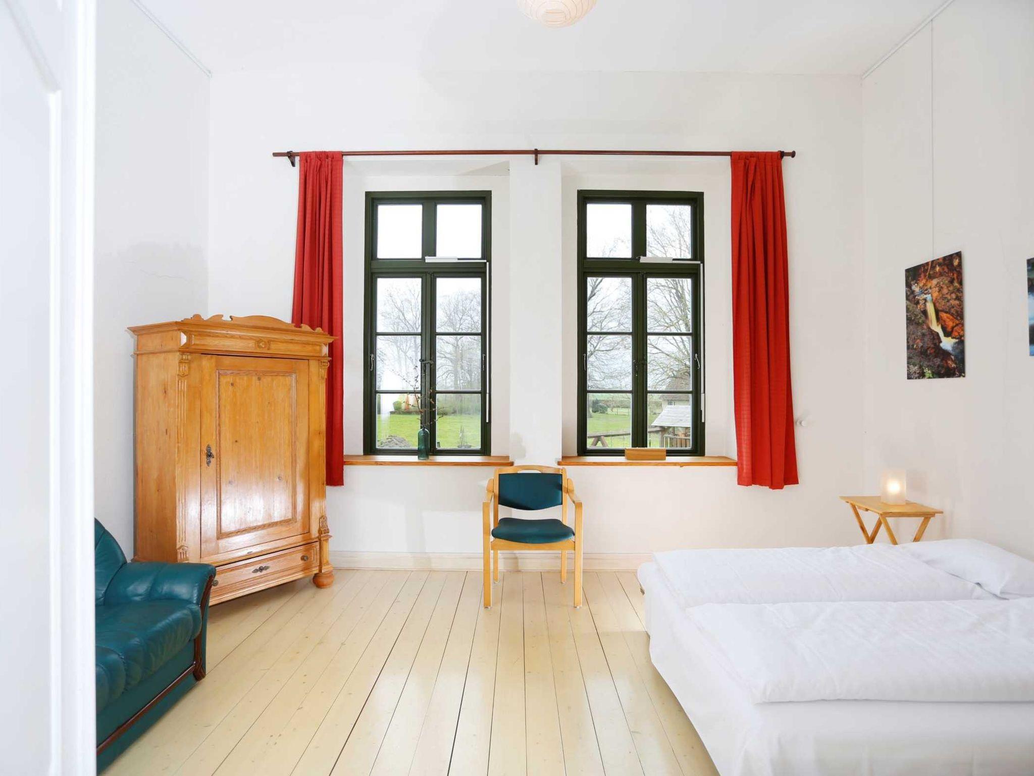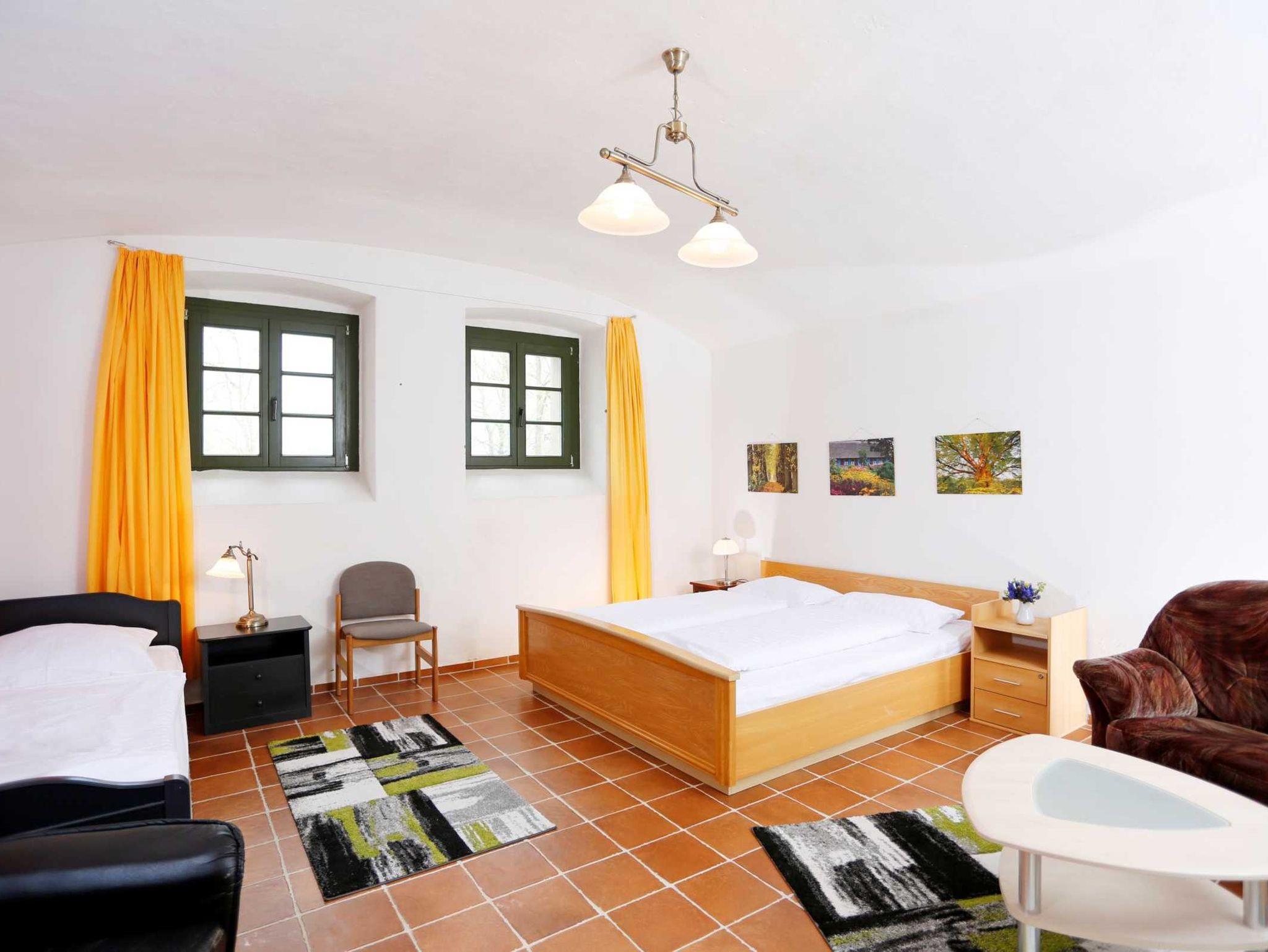 In dieser großen Licht durchfluteten herrschaftlichen Wohnung können Sie wie die Gutsherren residieren. Sie kommen vom Wohnzimmer (dem ehemaligen Saal des Herrenhauses) auf eine große Terrasse mit einem herrlichen Blick in den hauseigenen Park. Zur Wohnung gehören ein Schlafzimmer mit Doppelbett, eine große Küche und ein Bad mit Badewanne und Dusche sowie das Souterrain (45 qm) mit 2 Schlafmöglichkeiten. Dieses ist über eine Wendeltreppe von der Eingangsdiele erreichbar. Zusätzliche Schlafmöglichkeiten sind im Wohnzimmer auf zwei Doppelbettschlafcouchen vorhanden.